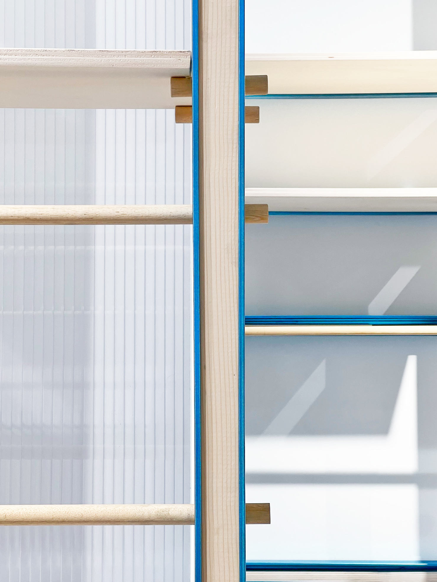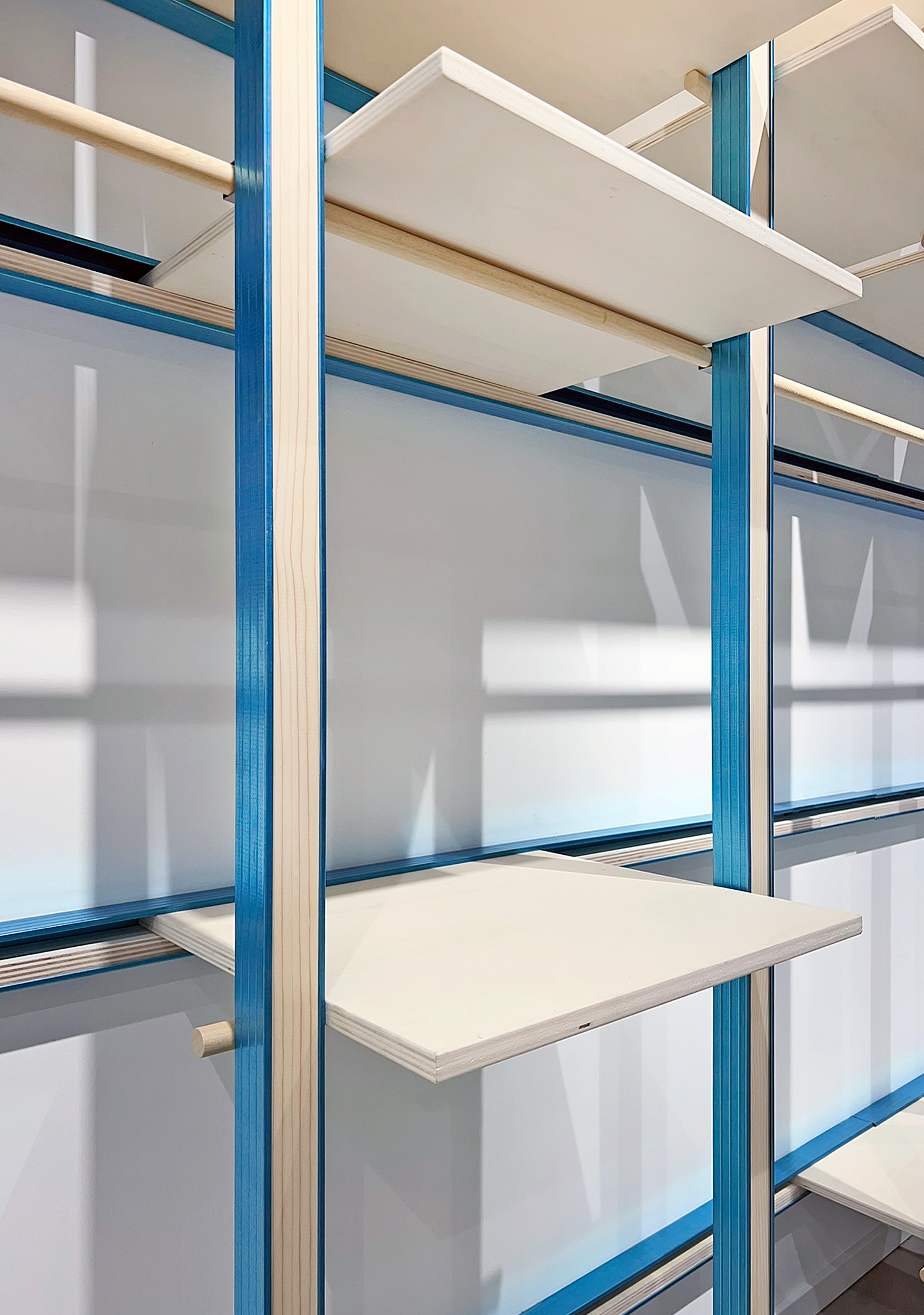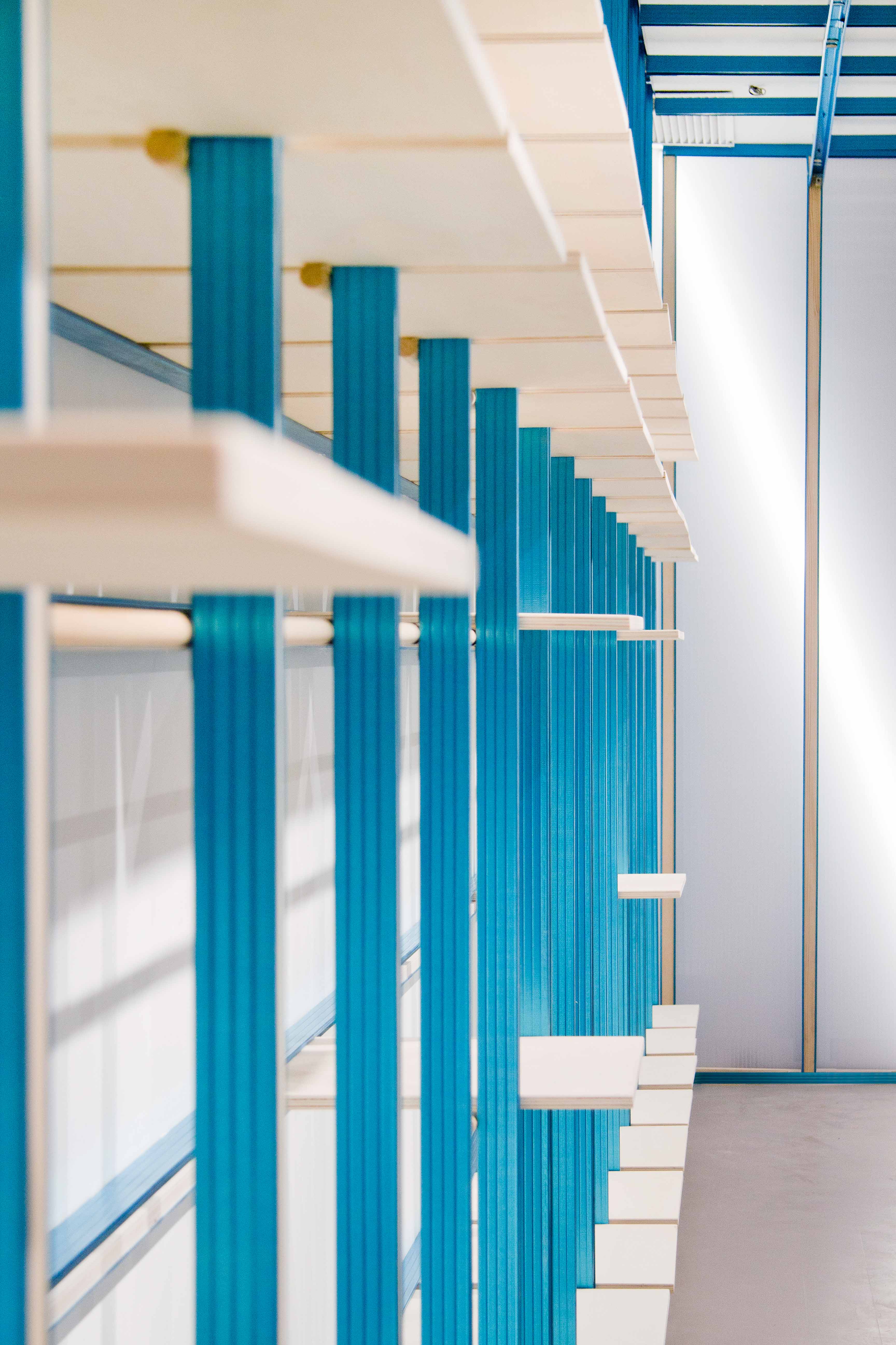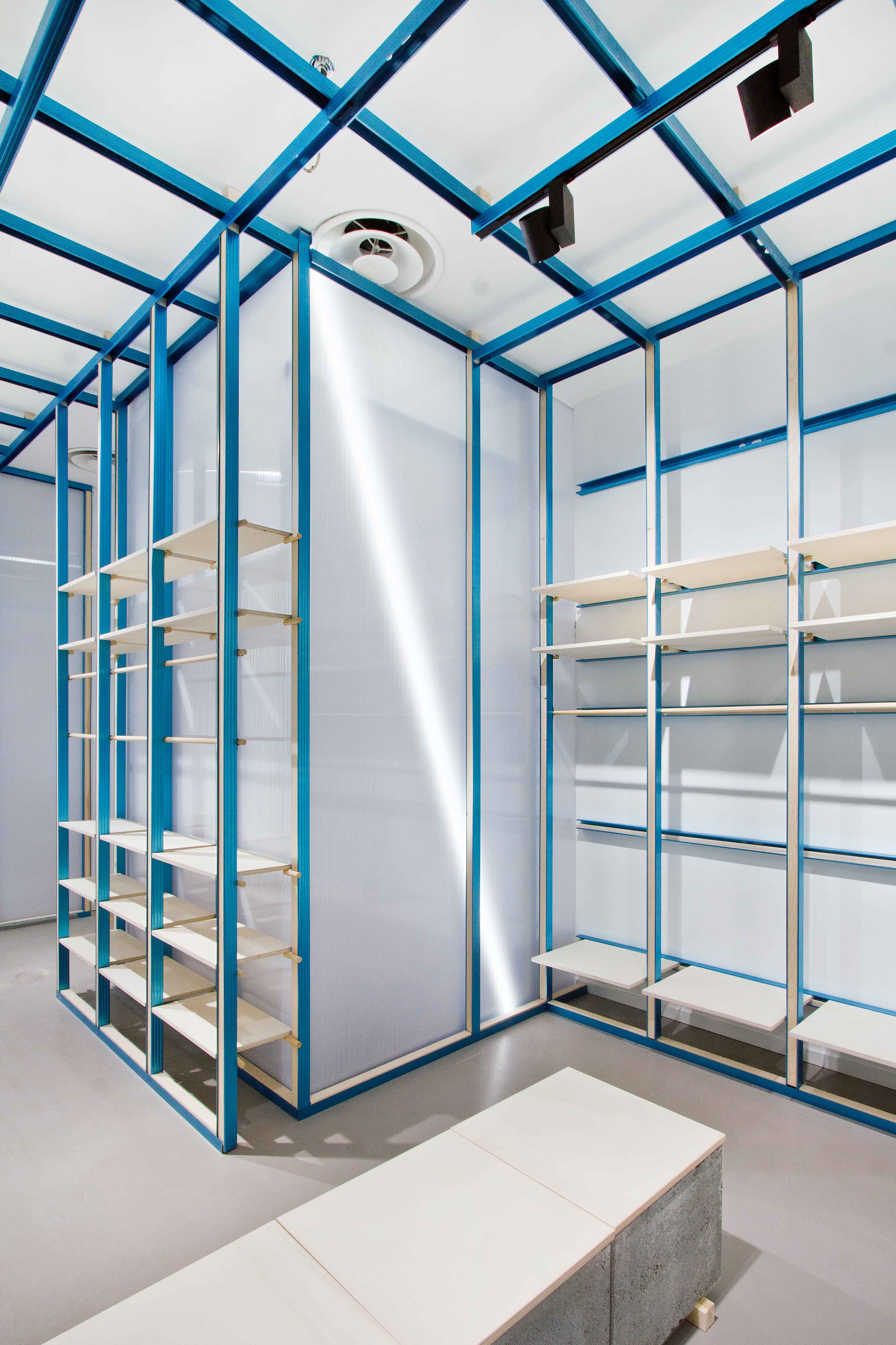 리버시블 샵은 이탈리아 밀라노의 다중 브랜드 소매업체인 온오프(ON-OFF)를 위한 새로운 매장이다. 건축가는 건축 산업에서의 유연하고 확장 가능한 디스플레이 솔루션에서 영감을 받아 미래 사업의 순환을 나타내는 계획안을 구상했다. 기존의 공간은 유지하면서 개선된 재료로 빠르고 쉽게 시공할 수 있는 방식을 선택하여 내부 공간의 배치를 개방적으로 구성하고, 다양한 상황에 유연한 대처가 가능하도록 구조적으로 계획했다. 상품을 매달 수 있는 디스플레이는 제품 자체가 공간의 건축적인 요소가 되어 브랜드 아이덴티티를 만들어낸다. 천장에서 내려오는 유색 금속 격자, 조절가능한 선반을 지탱하는 포플러 목재 레일, 파란색의 메타크릴레이트 노출 구조물 등 산업과 천연 재료를 재치있게 재해석하여 기업의 이미지를 정의한다.