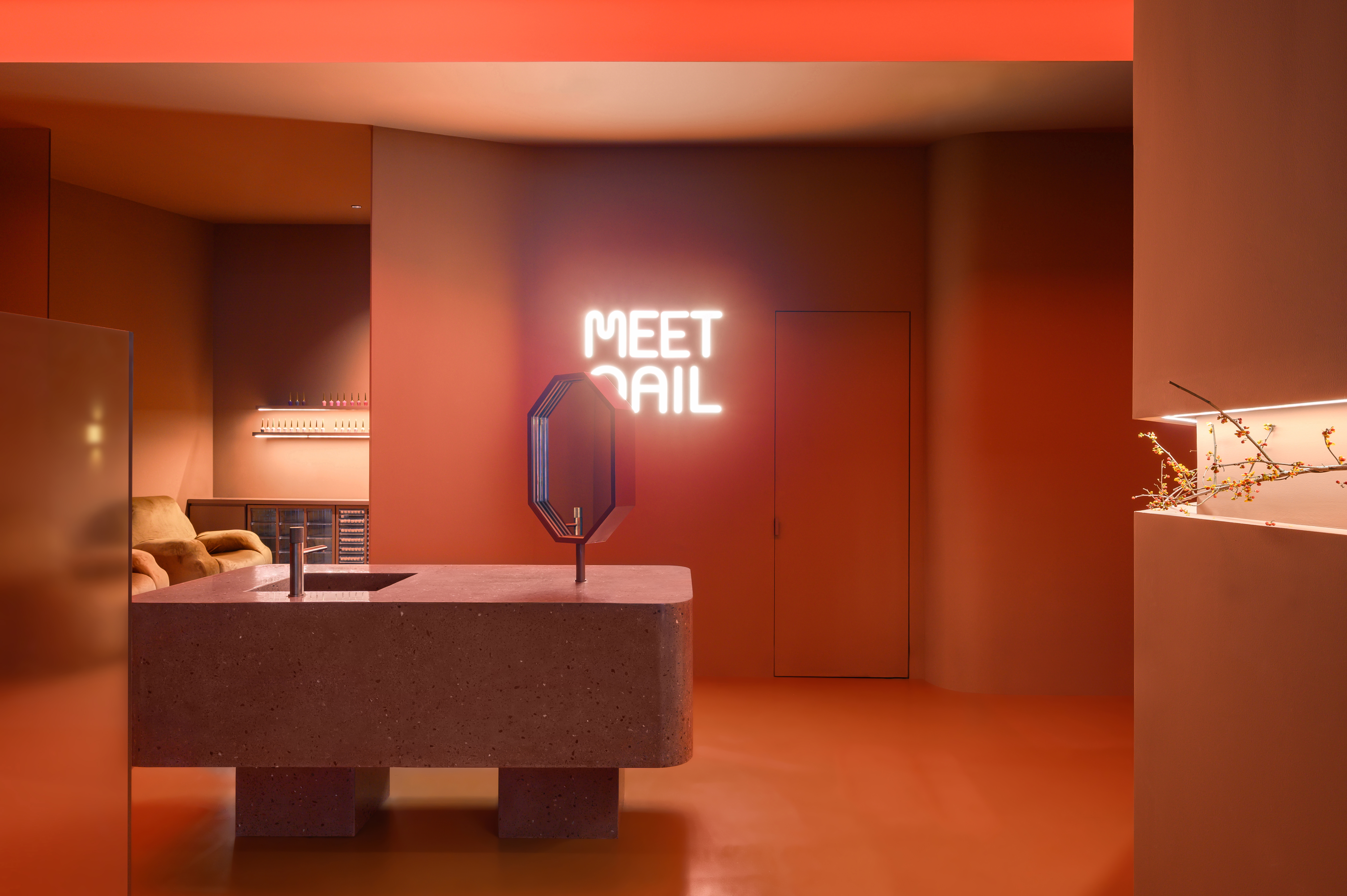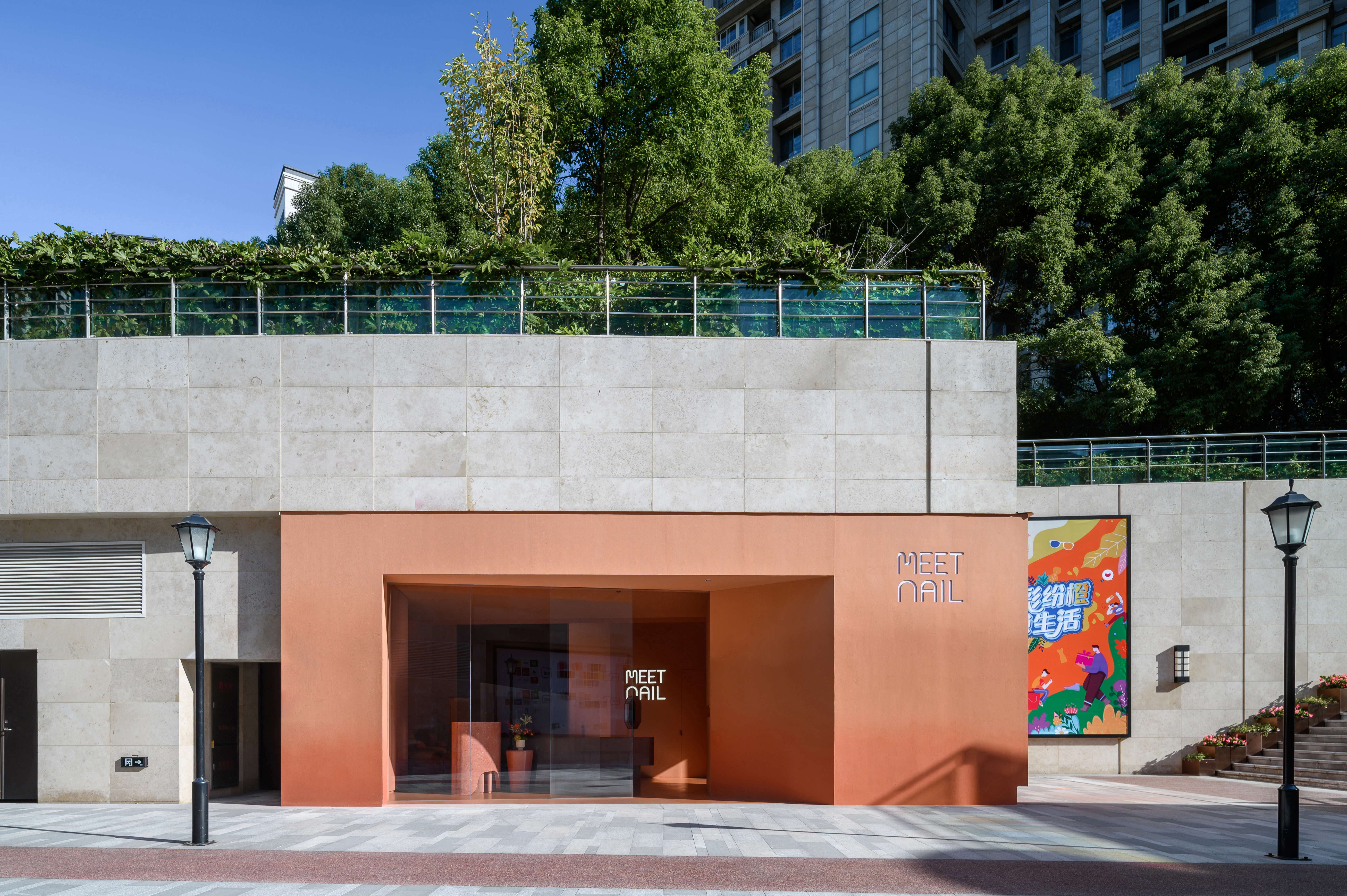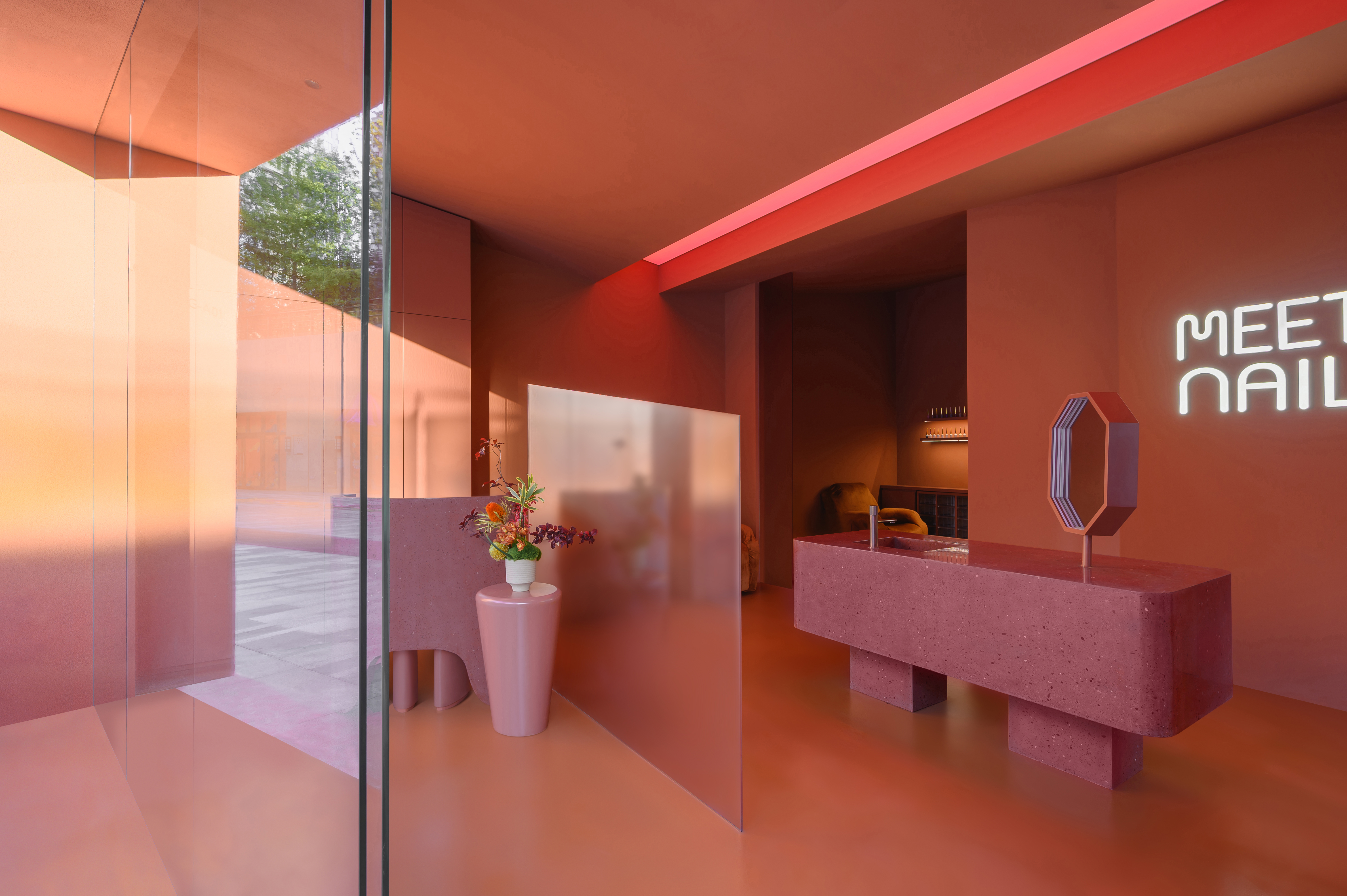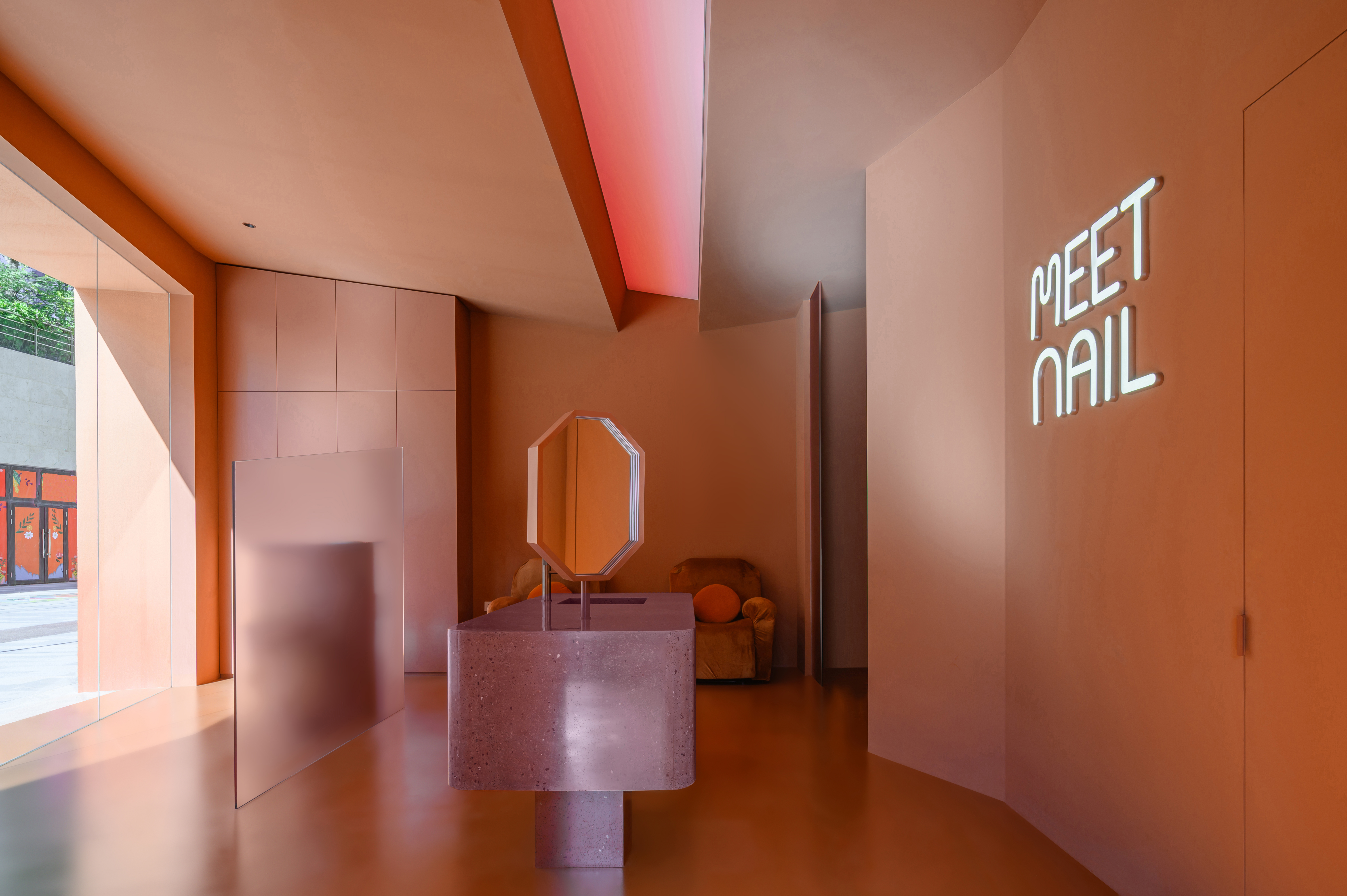 밋 네일 플래그스토어는 ʻ 시야 속 빛’을 테마로 한 고급 네일 브랜드 매장이다. 야외로 노출된 지하 1층에 해당하는 매장의