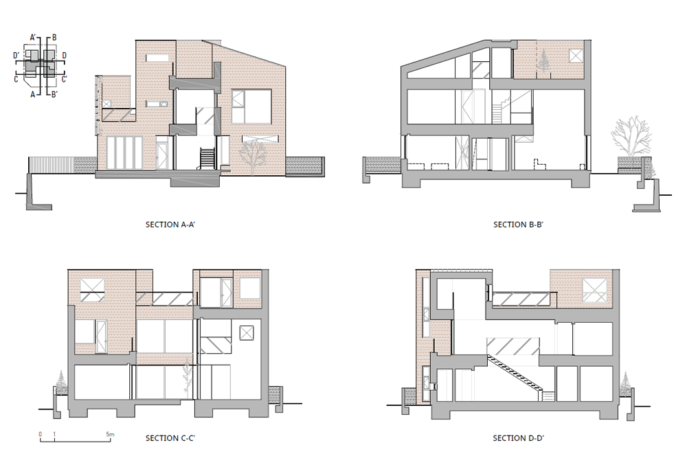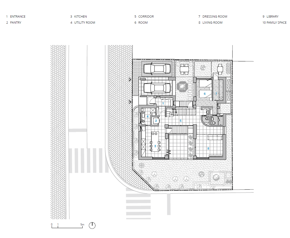 건축가는 실내에 머무르는 시간이 긴 내부 사용자의 만족도에 초점을 맞춰 건축적 전략을 전개했다. 건축주의 선호에 따라 거실과 주방이 명확하게 분리된 구조를 선택했다. 1층 남측부에 주방과 거실 등 공용공간을 배치 하고, 북측에 안방을 포함한 개인공간을 확보했다. 각각의 층은 가족들을 위한 공간과 게스트를 위한 공간으로 구분되며, 옥상은 취미 겸 다목적 공간의 기능을 한다.