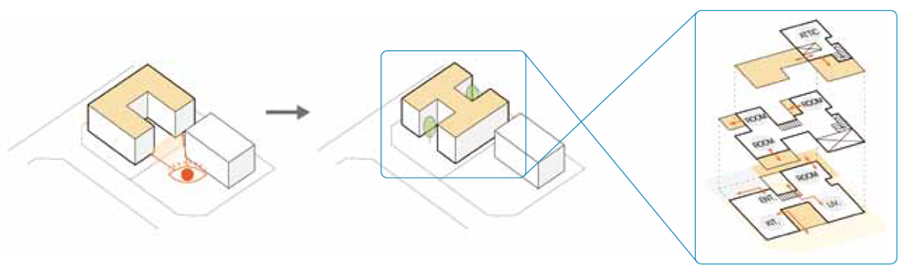 건축가는 실내에 머무르는 시간이 긴 내부 사용자의 만족도에 초점을 맞춰 건축적 전략을 전개했다. 건축주의 선호에 따라 거실과 주방이 명확하게 분리된 구조를 선택했다. 1층 남측부에 주방과 거실 등 공용공간을 배치 하고, 북측에 안방을 포함한 개인공간을 확보했다. 각각의 층은 가족들을 위한 공간과 게스트를 위한 공간으로 구분되며, 옥상은 취미 겸 다목적 공간의 기능을 한다.
