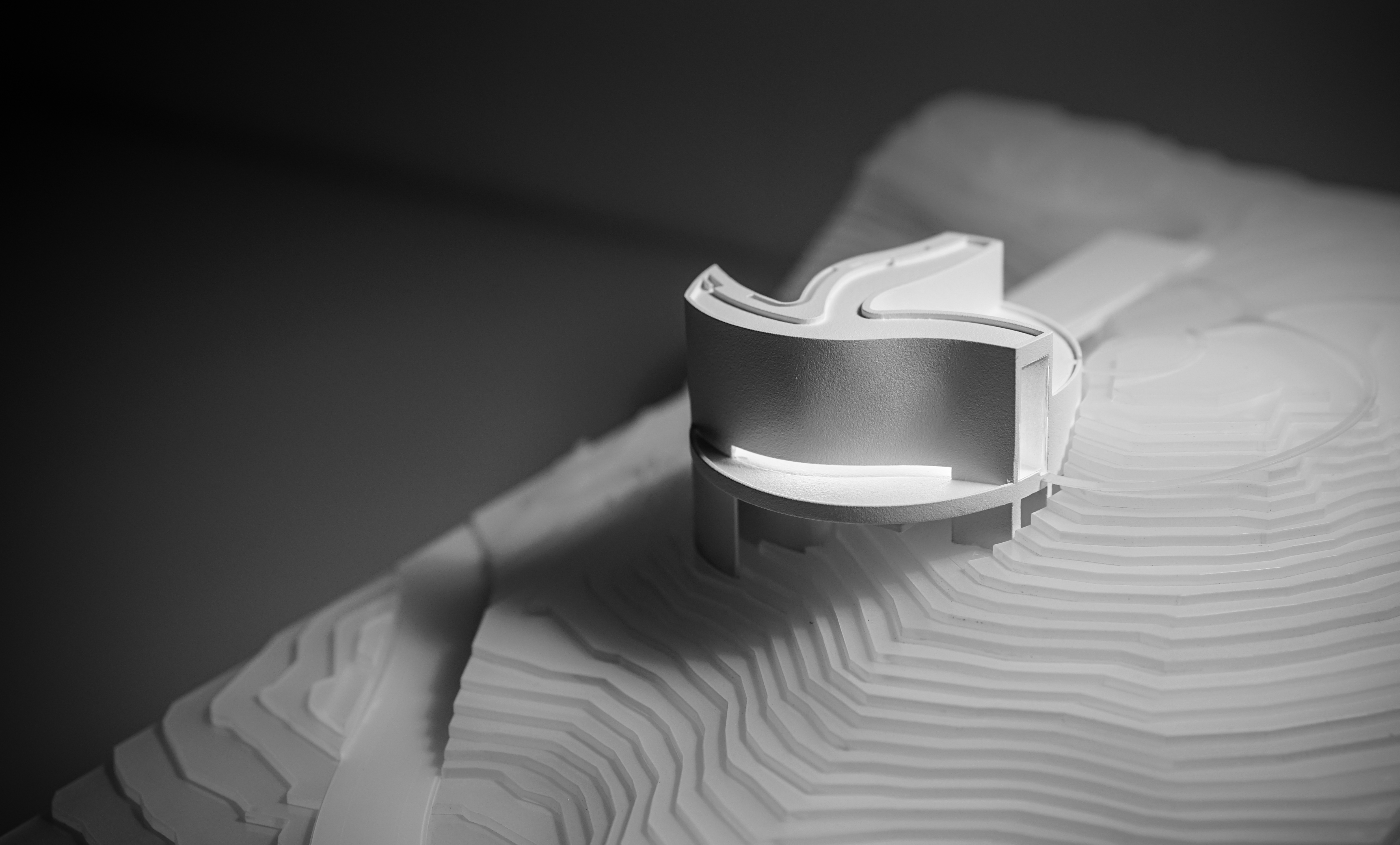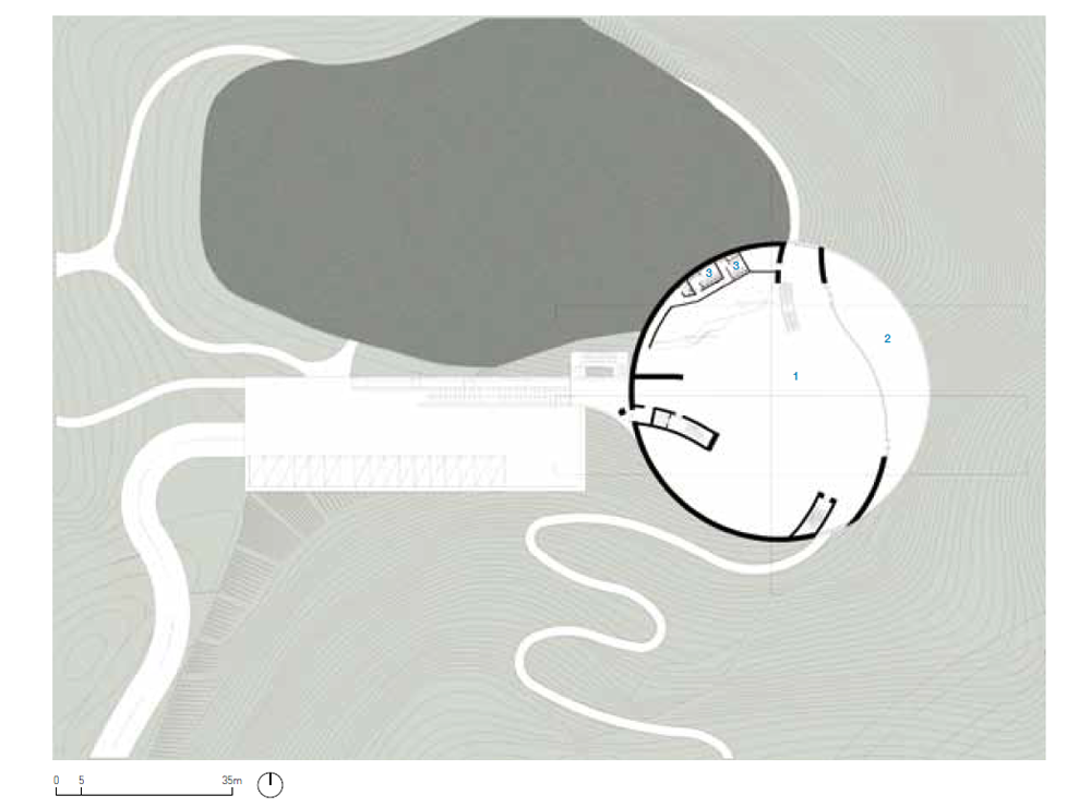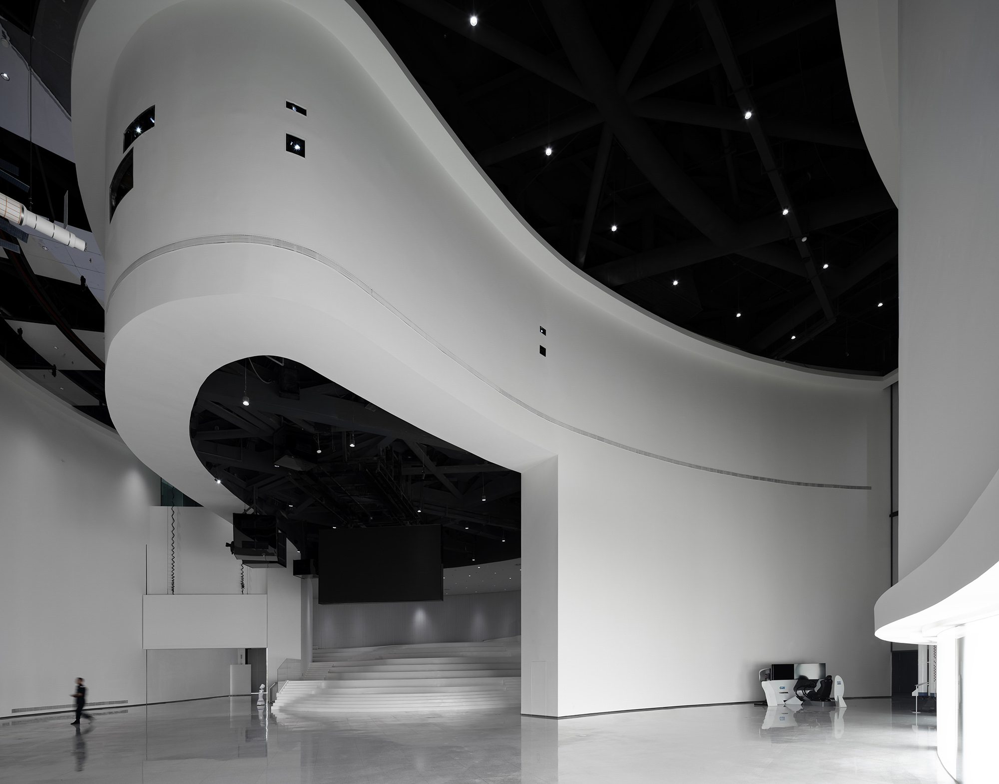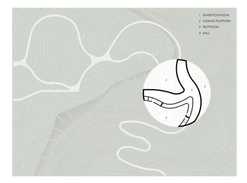 자링 강과 양쯔 강을 내려다 볼 수 있는 언덕 위, 룽싱 고대 도시의 희미한 풍경을 볼 수 있는 곳에 충칭 량장협력혁신지구 기획전시관이 고고히 서있다. 동쪽에는 절벽이 있고, 그 아래에는 밍웨 호와 그 주변의 생태공원이 있어 자연 환경에 둘러싸인 모습이다. 풍부한 자연 환경을 즐길 수 있도록 설계됐다. 건축가들은 프로젝트의 초기 단계부터 작은 언덕 위에 세워질 센터를 자연 속에 파묻힐 수 있도록 크기를 규정해놓고 작업했다. ‘흐르는 강물’은 이 건축물의 형태를 보여준다. 위안취로의 대나무 숲에서 시작되어 어이저는 동선을 따라 걷다보면 점점 더 자연 속을 향해 걷고 있음을 느낄 수 있다. 원형의 각각 층은 절벽 위에 캔틸레버로 지지된다.  콘크리트로 만들어진 원통형의 건축물은 긴 수평 창과 수직 홈으로 최소한의 표현만 가지고 있다. 공간 안에 들어서서 공간으로 깊이 들어갈수록 탁 트인 호수의 멋진 전망을 볼 수 있다. 기획전시관은 혁신 구역의 ‘거실’같은 공간으로 전시와 사무실 등의 기능을 수행하는 유연한 공간 구성을 가진다. 관람객은 원형 형태의 공간을 따라 전시를 관람하고 이동하면서 주변 풍경 또한 탐험할 수 있다. 곡선의 높은 천장을 가진 내부는 주변 자연 환경을 그대로 모방하고 있다.