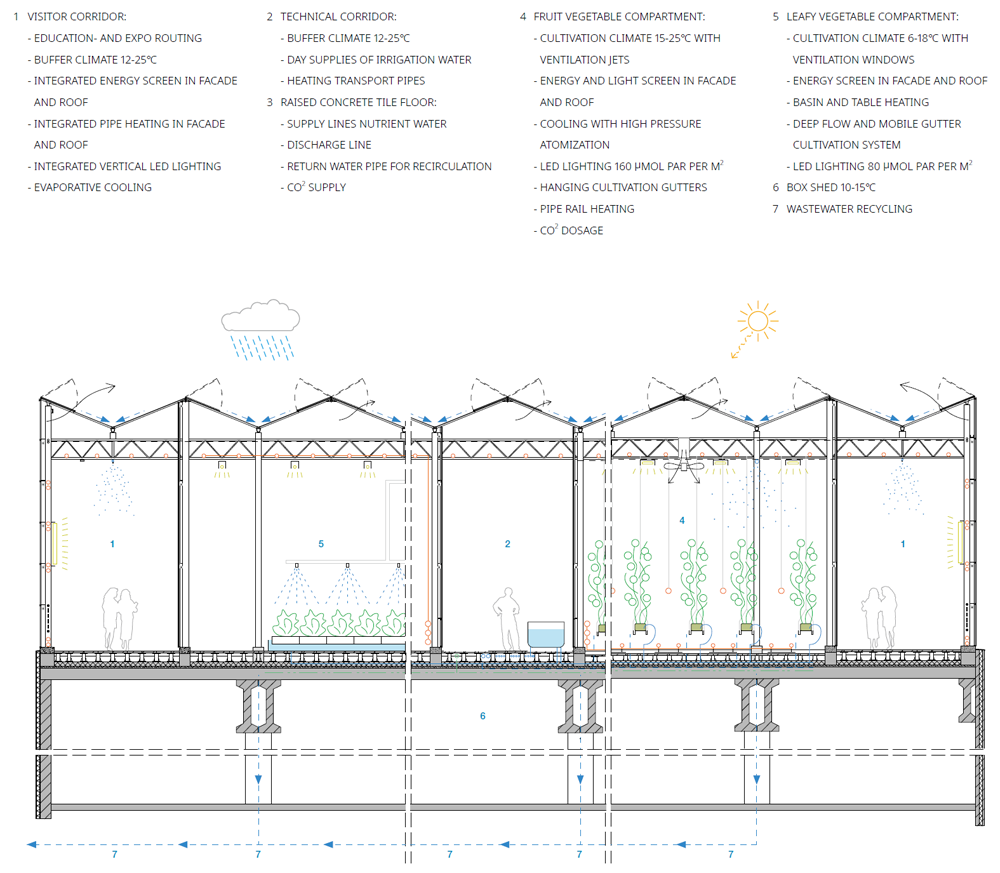 기존의 온실에 비해 두 배 높은 수직 구조는 건축물의 첫 인상을 만들며 이곳만의 정체성을 보여준다. 동시에 수직형 재배에 매우 적합하다. 두 개의 캔틸리버 구조의 건물 상단에 투명한 온실을 배치함으로써 투과성이 있는 독특한 외관이 만들어졌다. 입구에는 특별한 자외선 차단 처리를 한 수직의 베이 윈도우가 형성되어 있어 내부와 외부로 향하는 뷰를 유지한다. 입구의 넓은 계단으로부터 중심부의 원예 시설로 이어진 복도는 농업 교육을 위한 방문객들이 직접 온실을 둘러볼 수 있게 한다.