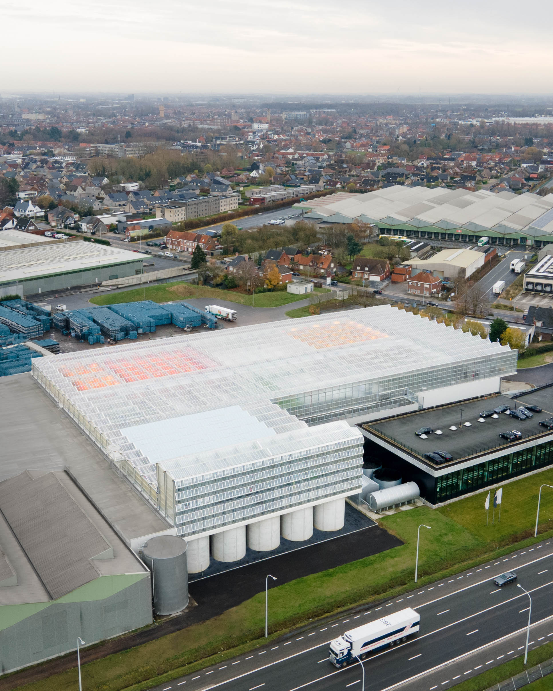 아그로토피아는 사회적인 과제를 해결하기 위한 플랑드르 지역의 공공 사업인 ‘생산적인 경관을 위한 시범 프로젝트(PPPL)’의 일환으로 진행됐다. 건축가는 다양한 분야의 협력을 통해 지속 가능하고 효율적인 통합 연구 및 농업 교육용 시설을 계획했다. 디자인적으로는 웨스트 플랑드르(Flanders) 지역의 과일과 채소 물류의 중심지 역할을 하는 REO 베일링(REO Veiling)의 본사 건물 옥상에 적층하는 방식을 택했다. 철골과 유리로 만들어진 투명한 온실은 농업과 공공 기능을 강조하면서 로에세라르 산업단지 지역의 광활한 스카이라인 속에서 건축적이고 기념비적인 형태로 세워져 있다.