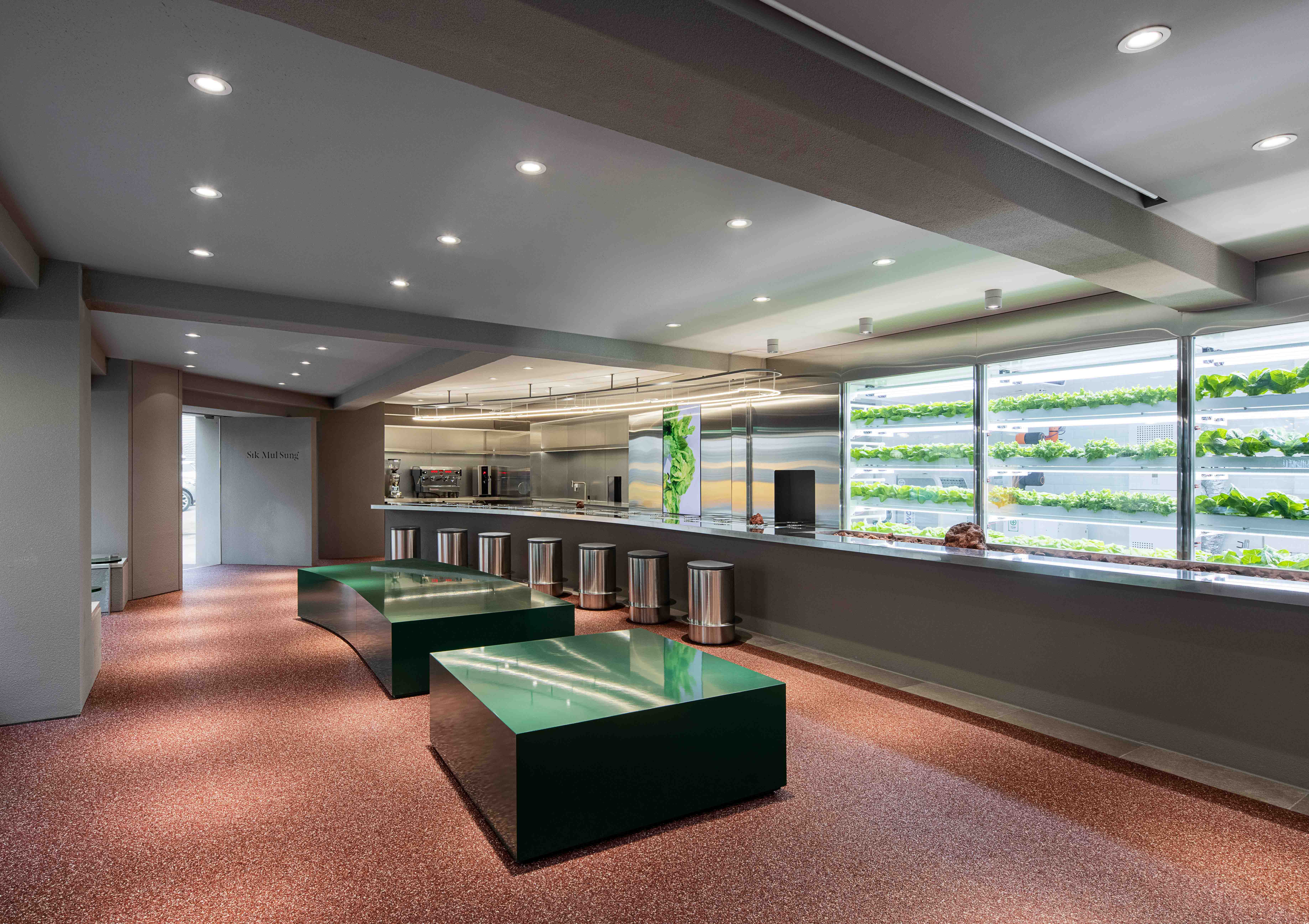 디자이너는 식물성의 주요 상품인 채소와 자연을 디자인 요소로 설정하고, 재배-수확-요리-식사의 일련의 과정을 한 공간에서 경험할 수 있는 공간을 의도했다. 전체적으로 붉은색과 초록색을 공간에 적용하여 청결함과 자연적인 느낌을 부각하고, 스테인레스 스틸을 사용한 가구와 화성의 붉은 모래를 연상시키는 붉은 자갈 바닥 등 마감재의 변화는 공간이 단조로워지는 것을 해소한다. 카운터 너머로 마련된 재배실은 유리 마감으로 경계를 나누었고, 시각적으로는 인공조명을 활용한 수경재배 시스템을 가감 없이 보여준다. 매장의 컨베이어 벨트는 매장에서 직접 재배한 채소를 활용한 요리를 고객에게 전달하는 장치이며, 긴 축으로 회전하고 있는 원형 접시가 마치 궤도를 도는 행성처럼 보이게 한다.