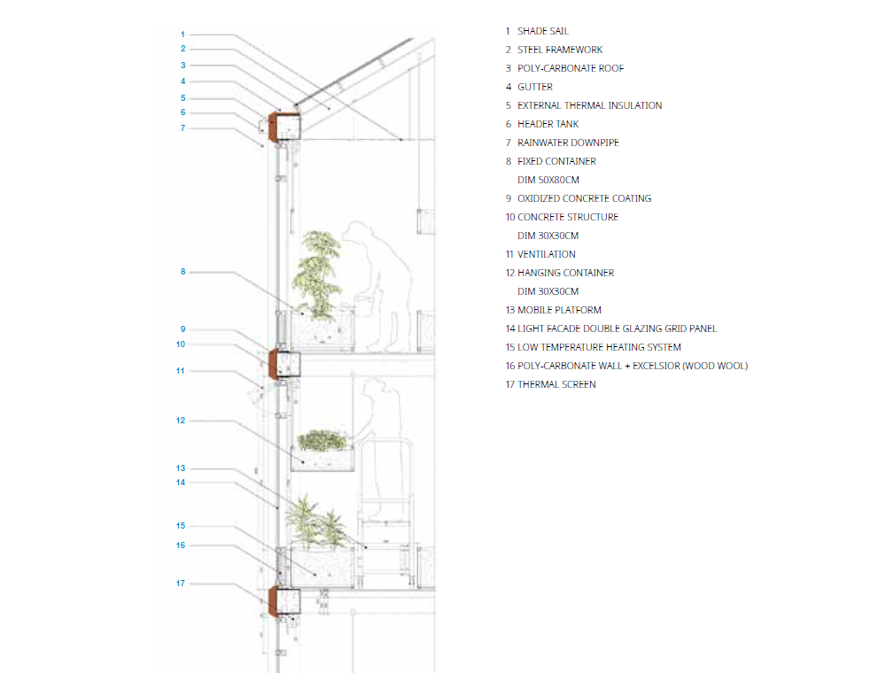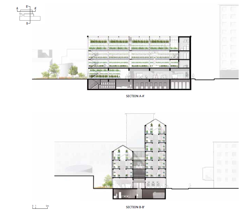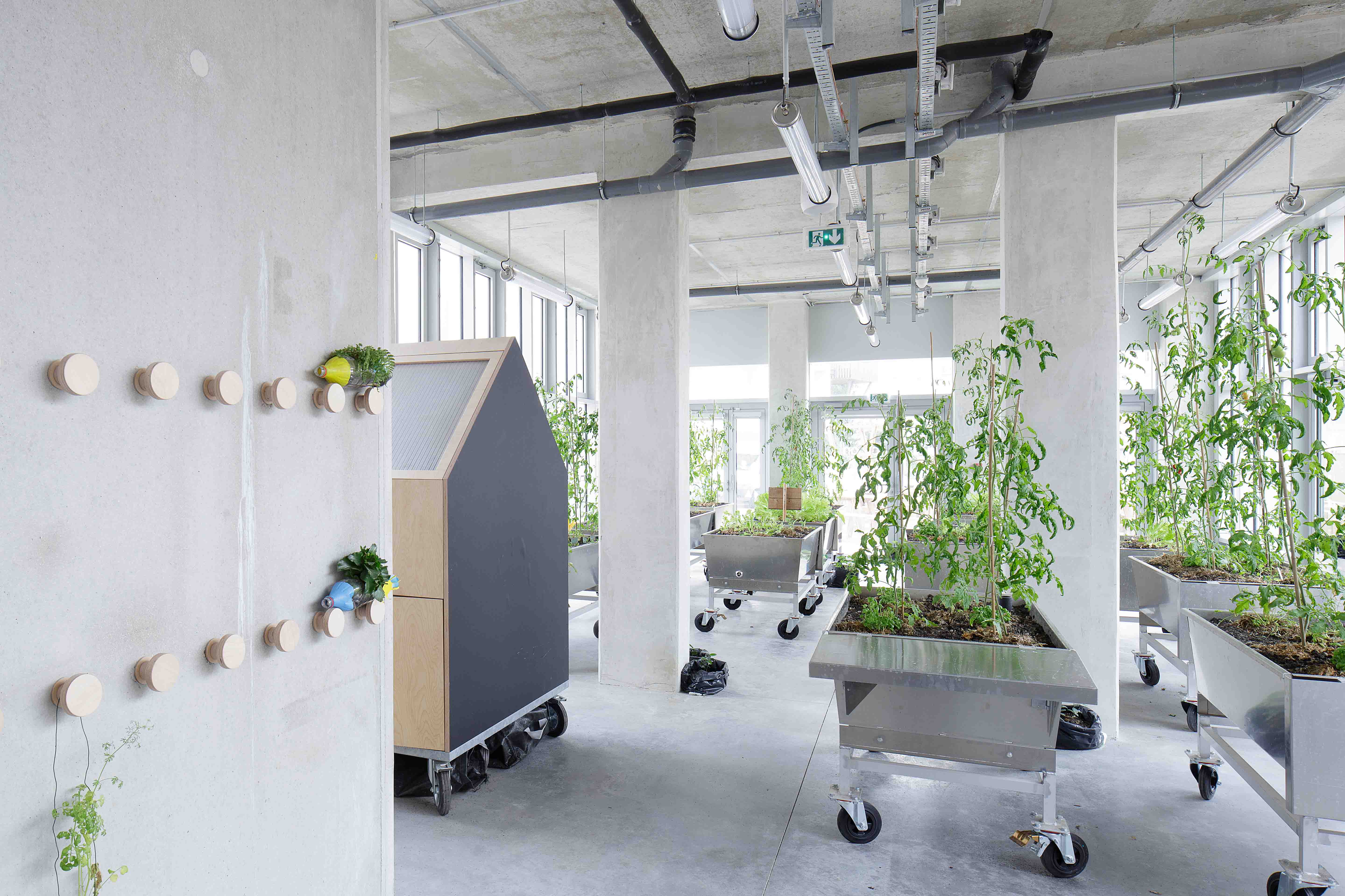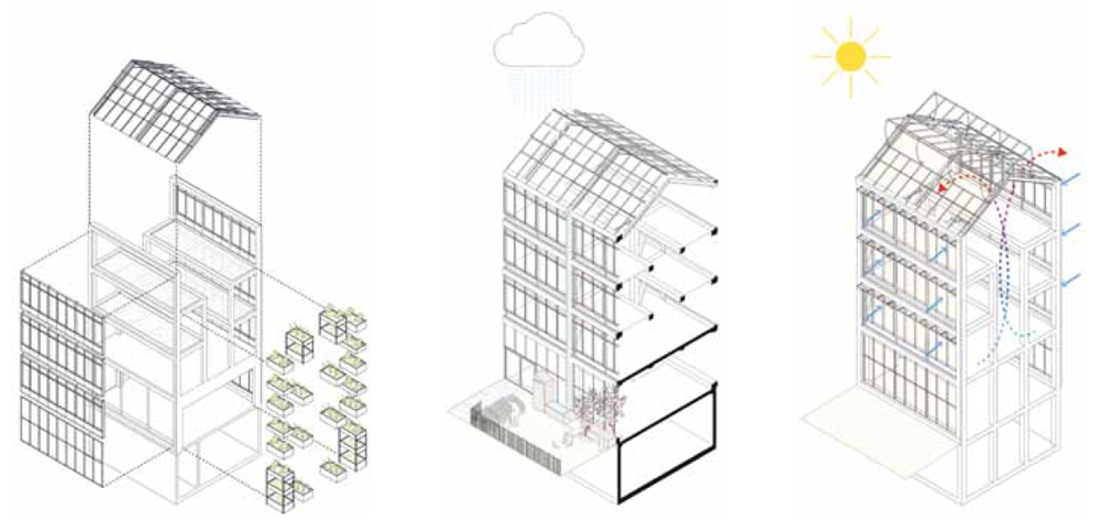 전체적인 디자인은 인접해있는 건물들과의 관계를 고려하였으며, 농업과 산업의 이미지를 결합하여 주요 재료와 텍스처를 결정했다. 수직 도시 농장의 1층은 교육용 정원과 식당, 작업장으로 계획됐다. 2층 이상으로는 작물 생산을 위한 재배 공간으로 계획됐다. 각각 원예용 온실과 산업 용도의 건물로 구분된 두 채의 건물을 잇는 교차로는 합리적이고 유연한 부피감을 주어 건물 내부에서의 동선을 자연스럽게 형성한다. 지붕과 창은 자연광을 활용하기 유리하게 설계되었으며, 짚 베일과 목재 섬유 단열재와 같은 유기 건축 자재를 사용하여 건물의 지속가능성을 높였다.