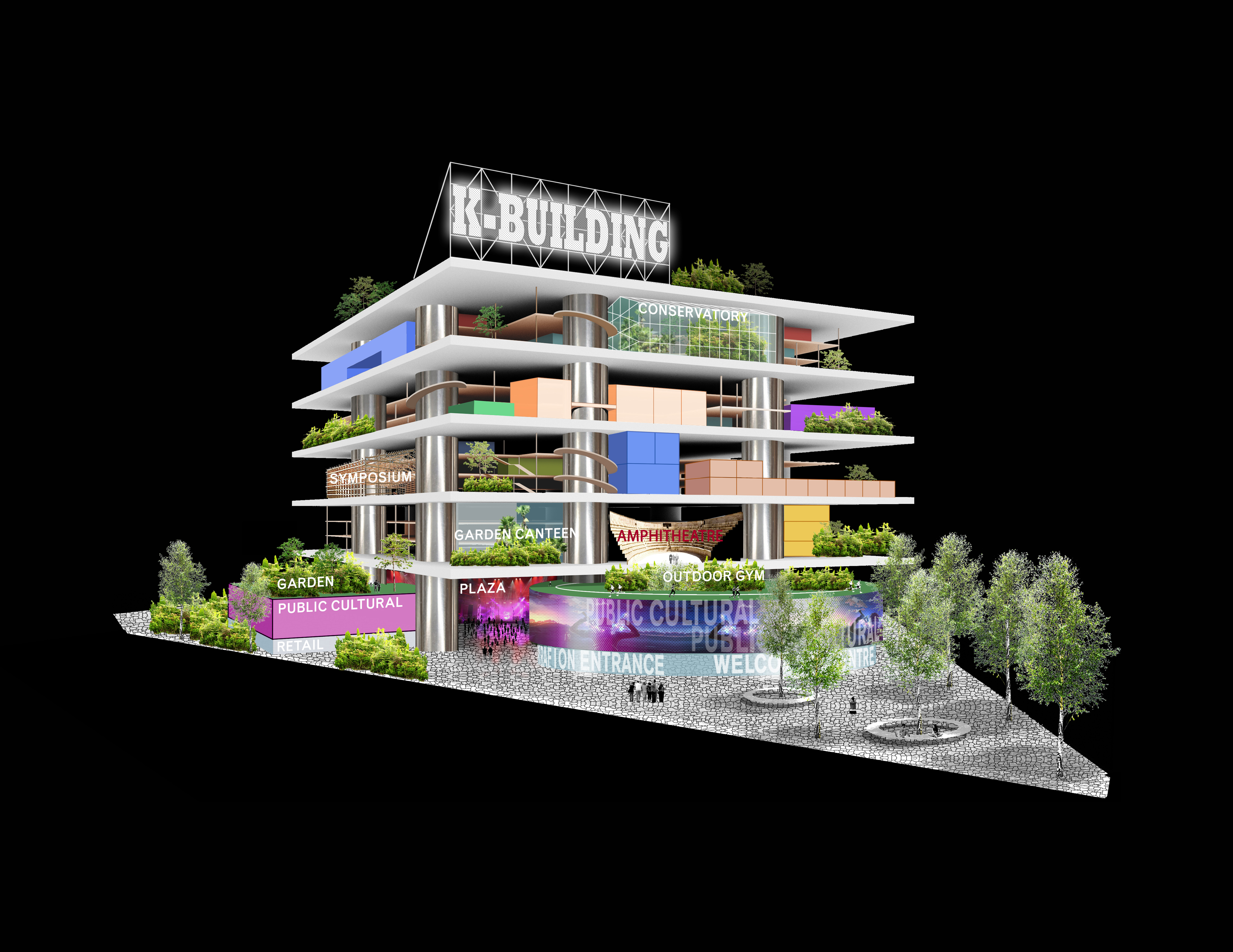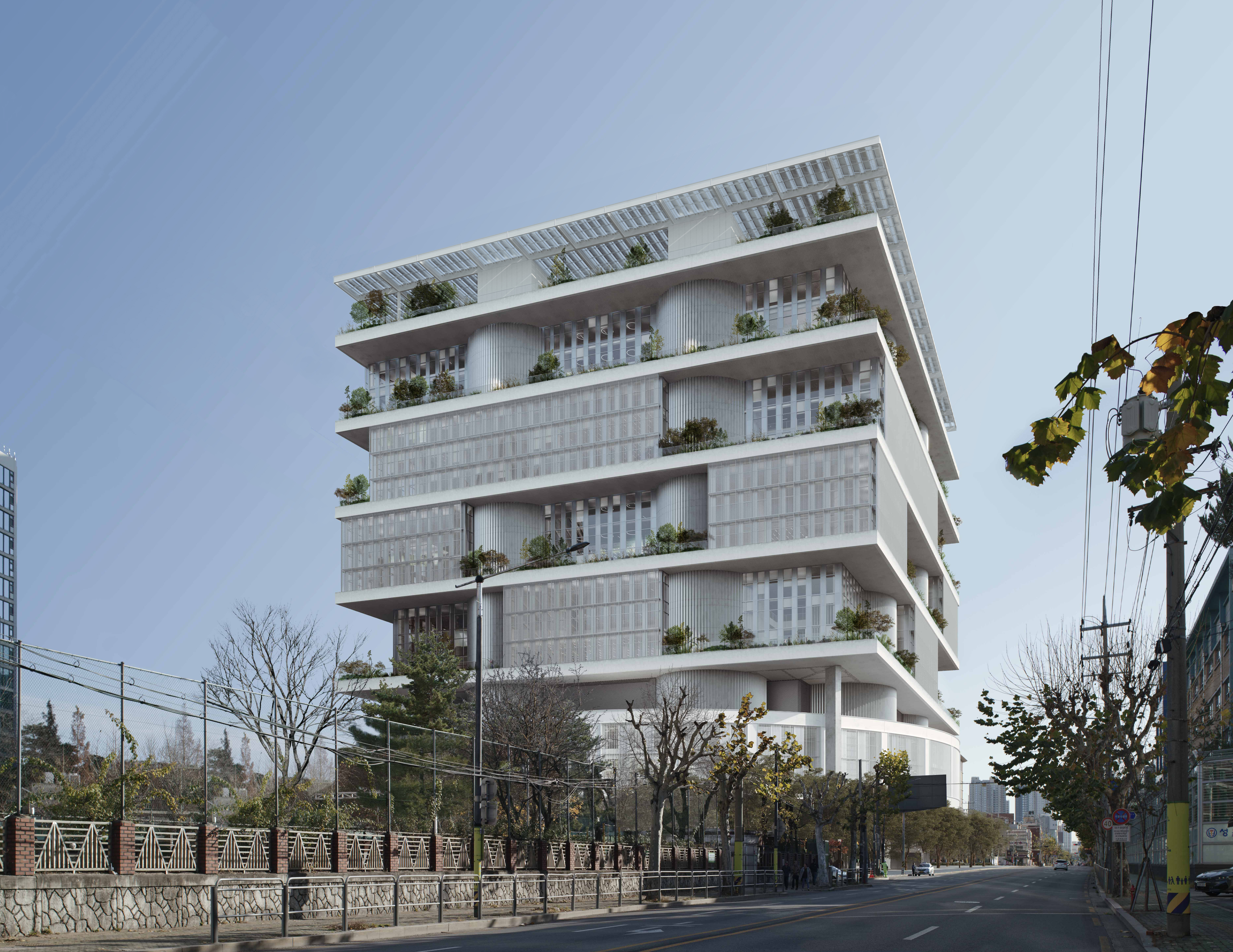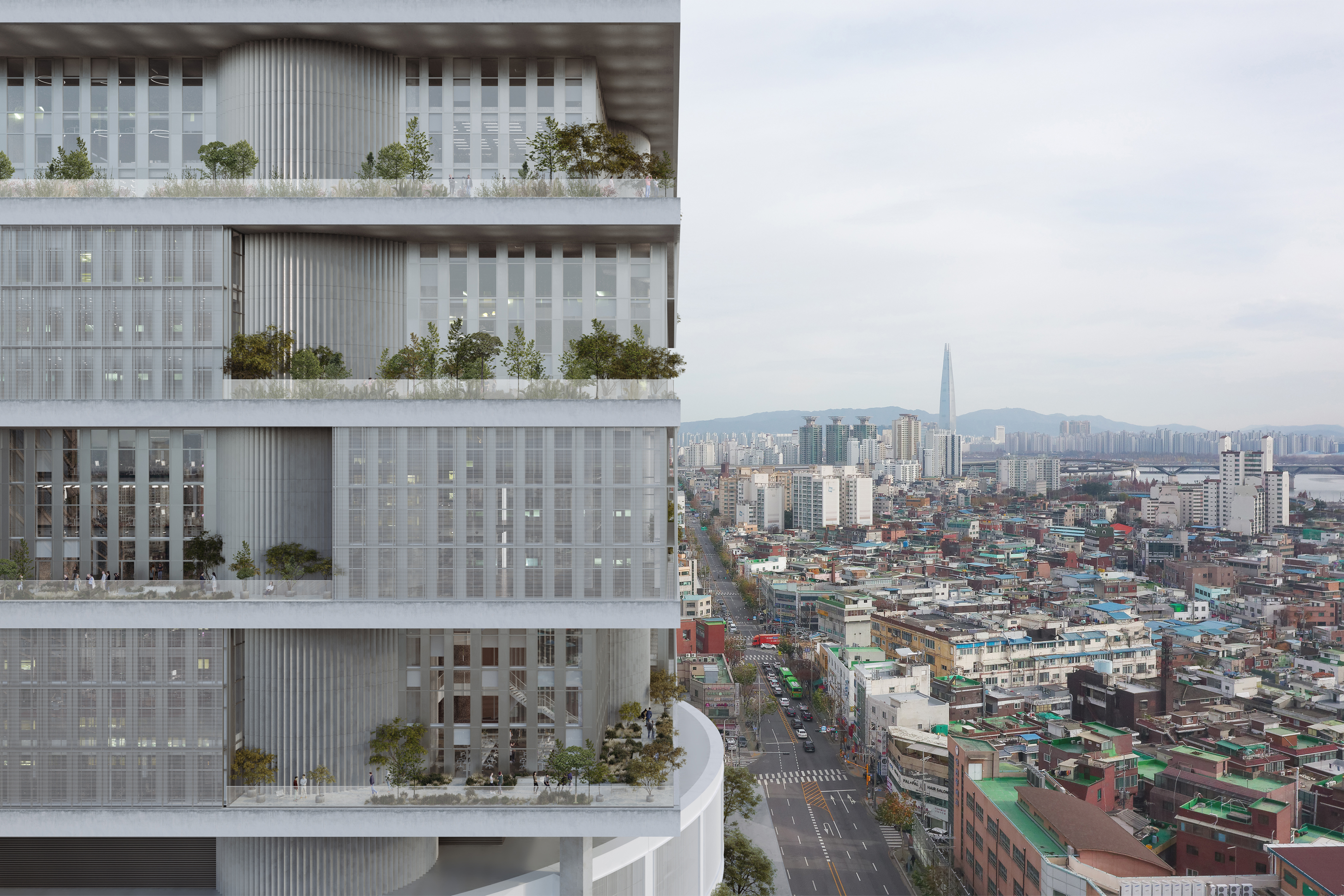 성수동이라는 활동적인 삶의 무대를 기반으로 사옥 안에는 다용도 아트리움과 문화 멀티플렉스가 자리 잡을 예정이다. 건물은 순환과 서비스를 포함하는 8개의 수직 원통형 코어에 의해 5개의 개방형 평면을 지나며, 중간의 복층 구조는 유연하게 이용할 수 있다. 경량 구조로 만들어진 업무 공간은 현대적이고 새로운 업무방식에 맞게 공간이 성장하고 적응할 수 있도록 계획되어 있다. 바닥 사이의 커튼월 시스템은 외피의 다양성을 더한다. 대지 주변의 공공 영역을 확장하고 입구 안뜰 역할을 하는 세 개의 도시 광장을 제안한다.
