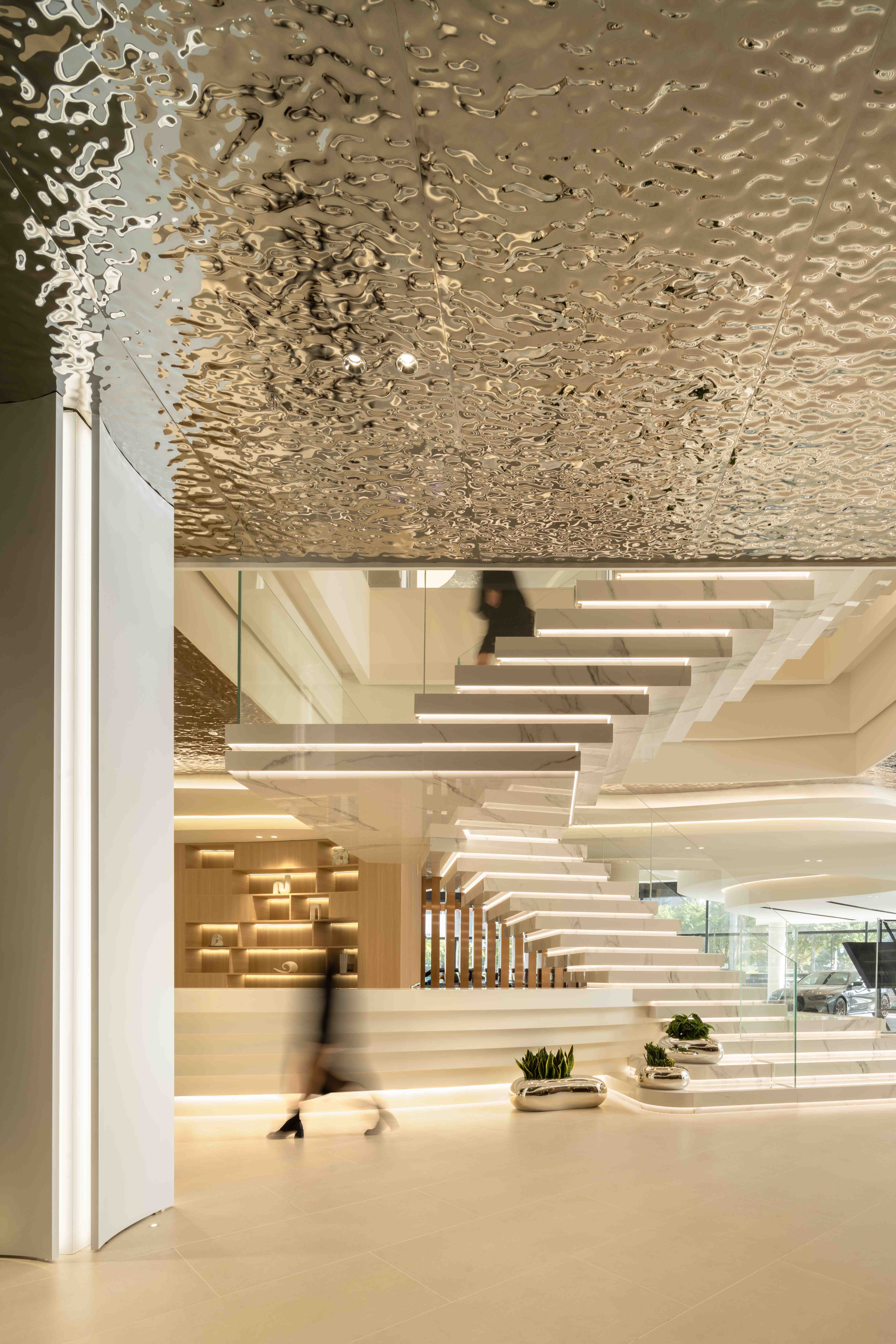 건축가는 자연과 바다에서 영감을 얻어 유연하게 흐르는 인테리어 테마를 완성시켰다. ‘물’의 의미를 담고 있는 부드럽게 레이어드 된 물결 모양의 천장은 디스플레이 공간부터 고객을 위한 바(bar) 공간, 휴게 공간에 이르기까지 연속적으로 흐르며 자유로운 고객 경험을 유도한다.