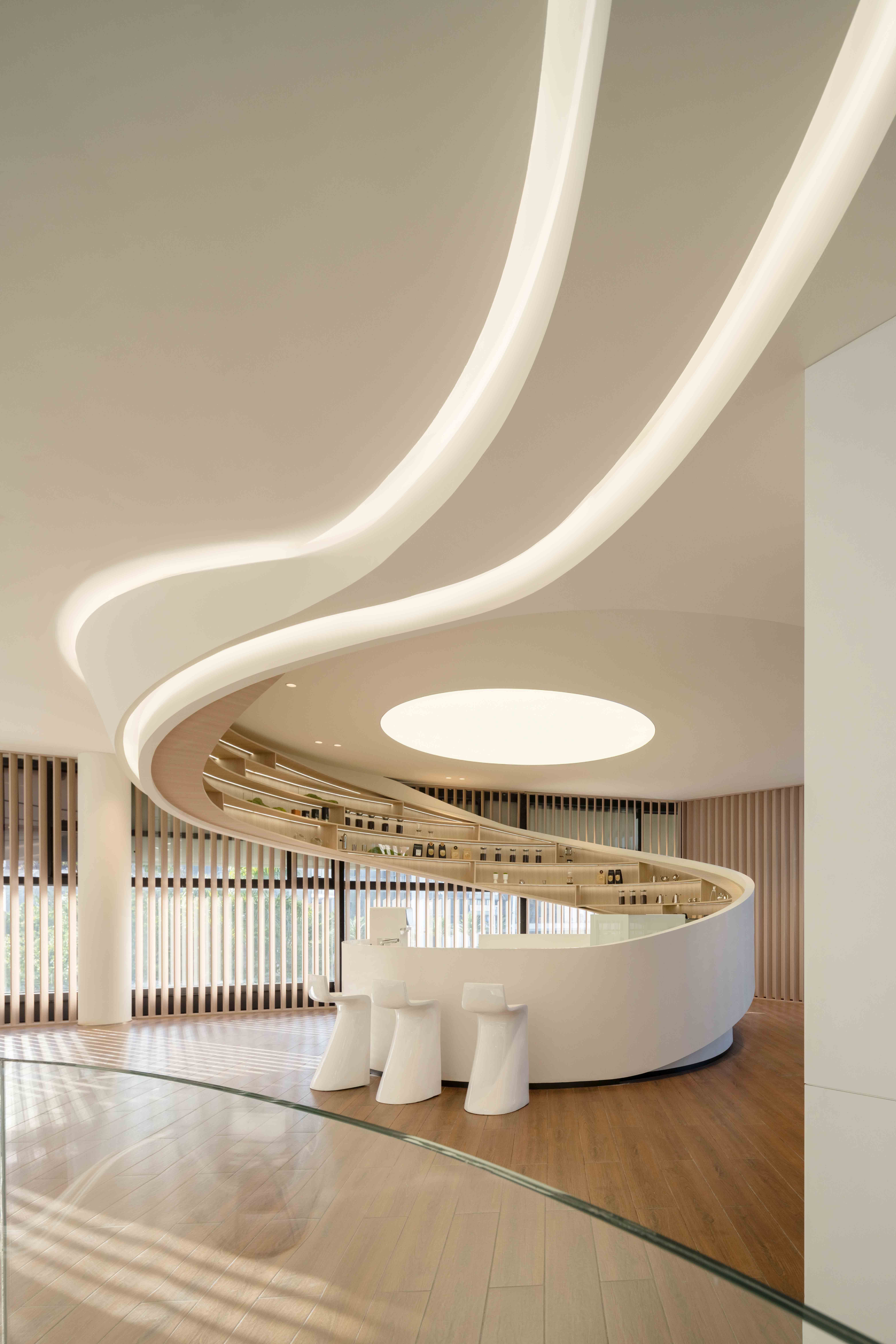 건축가는 자연과 바다에서 영감을 얻어 유연하게 흐르는 인테리어 테마를 완성시켰다. ‘물’의 의미를 담고 있는 부드럽게 레이어드 된 물결 모양의 천장은 디스플레이 공간부터 고객을 위한 바(bar) 공간, 휴게 공간에 이르기까지 연속적으로 흐르며 자유로운 고객 경험을 유도한다.