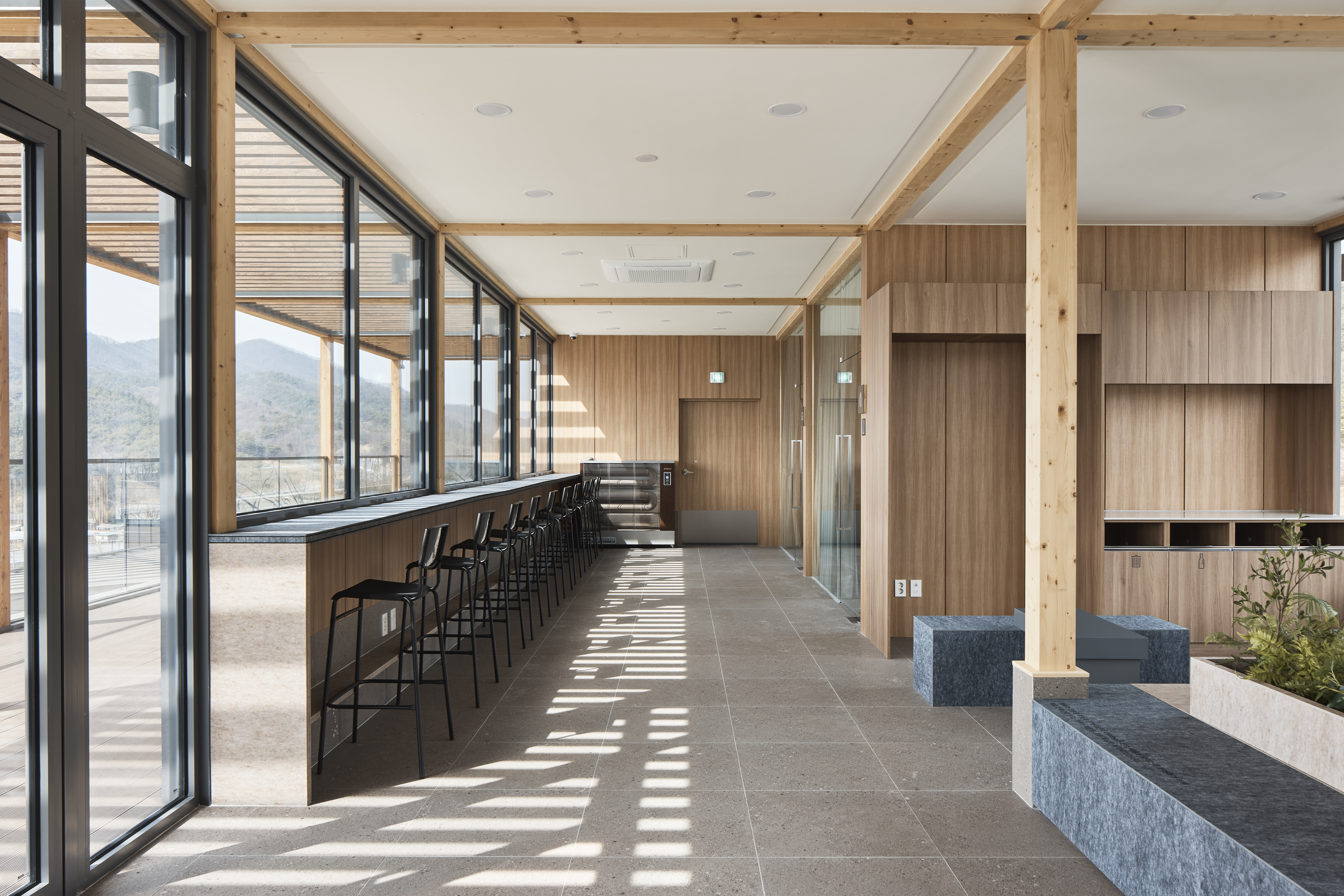 설계에서 중요했던 첫 번째 사항은 공공건축물과 친환경 목구조 형식의 최적의 조합 방법이었다. 공공건축에서 일반적으로 요구되는 넓은 경간, 높은 층고, 투명한 입면의 확보를 위해 중목 구조를 기준으로 한 골조 체계와 목재 판넬라이징 공법을 사용한 벽체구조를 혼용한 목구조 하이브리드 방식으로 지었다. 두 번째는 미래형 휴게소로서의 장소성 구현이다. 기존 내연기관 중심의 휴게소와는 달리 전기 충전을 위해 최대 1시간 이상 머물러야 하는 장소성이 확보되는 공간을 만들어야 했다. 차량 충전과 탑승자의 휴식공간을 일체화하여 공간을 구성했고, 휴게소의 주요 단위 기능인 화장실, 라운지, 편의점 등의 시설이 유기적인 동선을 가질 수 있도록 설계했다. 뿐만 아니라, 수려한 주변 자연환경을 바라볼 수 있는 전후면 외부공간, 2층 테라스 공간 등도 함께 계획했다. 세 번째는 모듈화를 통한 확장 가능성의 공간이다.