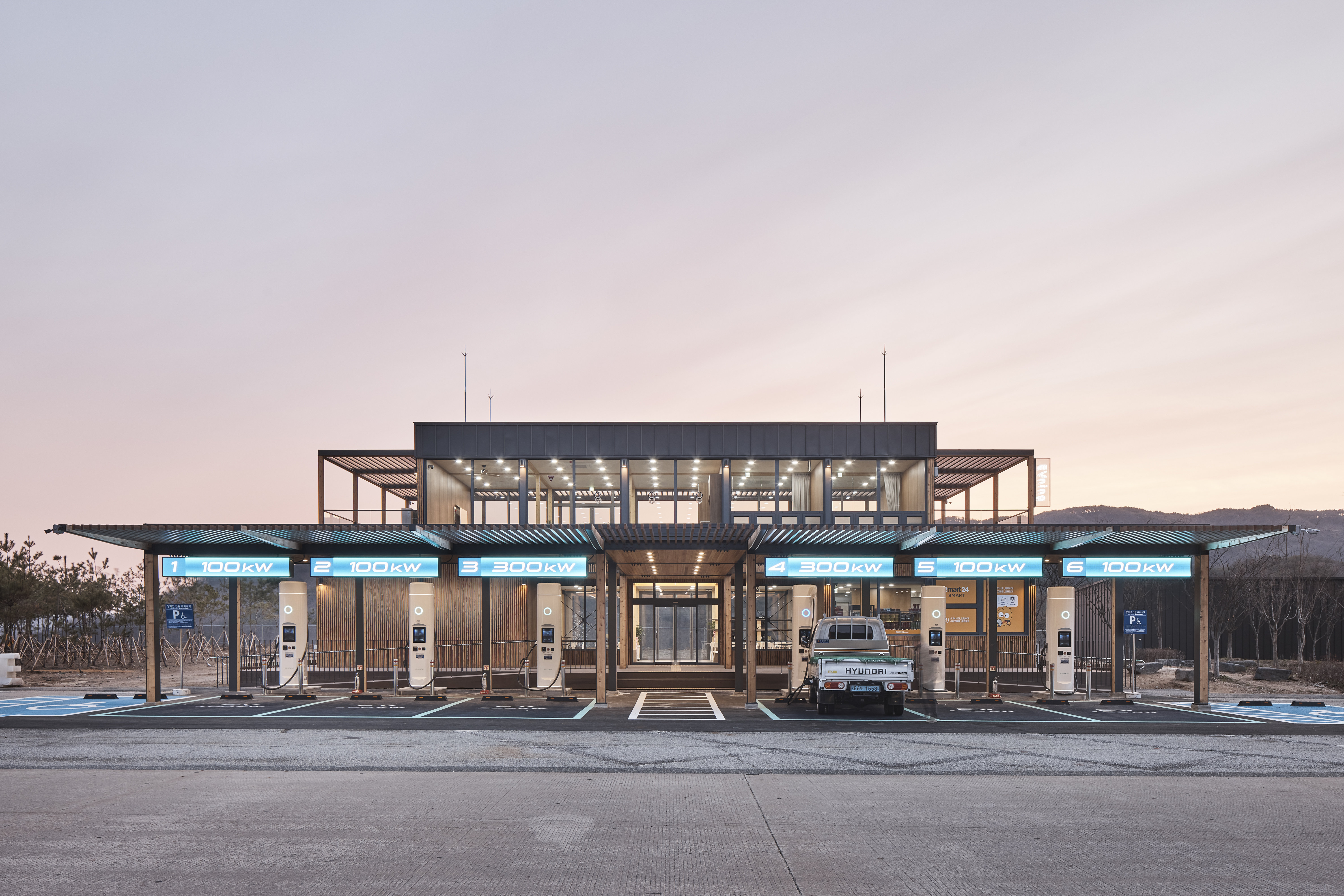 고속도로 충전라운지 “EVning” 프로젝트는 전기차 시대에 적합한 친환경 공공 건축을 제안한 작업이다. 한국도로공사는 환경기준의 강화 및 정부의 친환경 차 보급 정책에 따른 충전 인프라 확충을 위해 고속도로상의 전기차 충전소와 연계된 비대면 중심의 미래형 휴게 라운지 시범사업을 추진함에 따라, 차세대 휴게소 모델로서의 뉴노멀 전기차 충전라운지를 만들어야 했다.