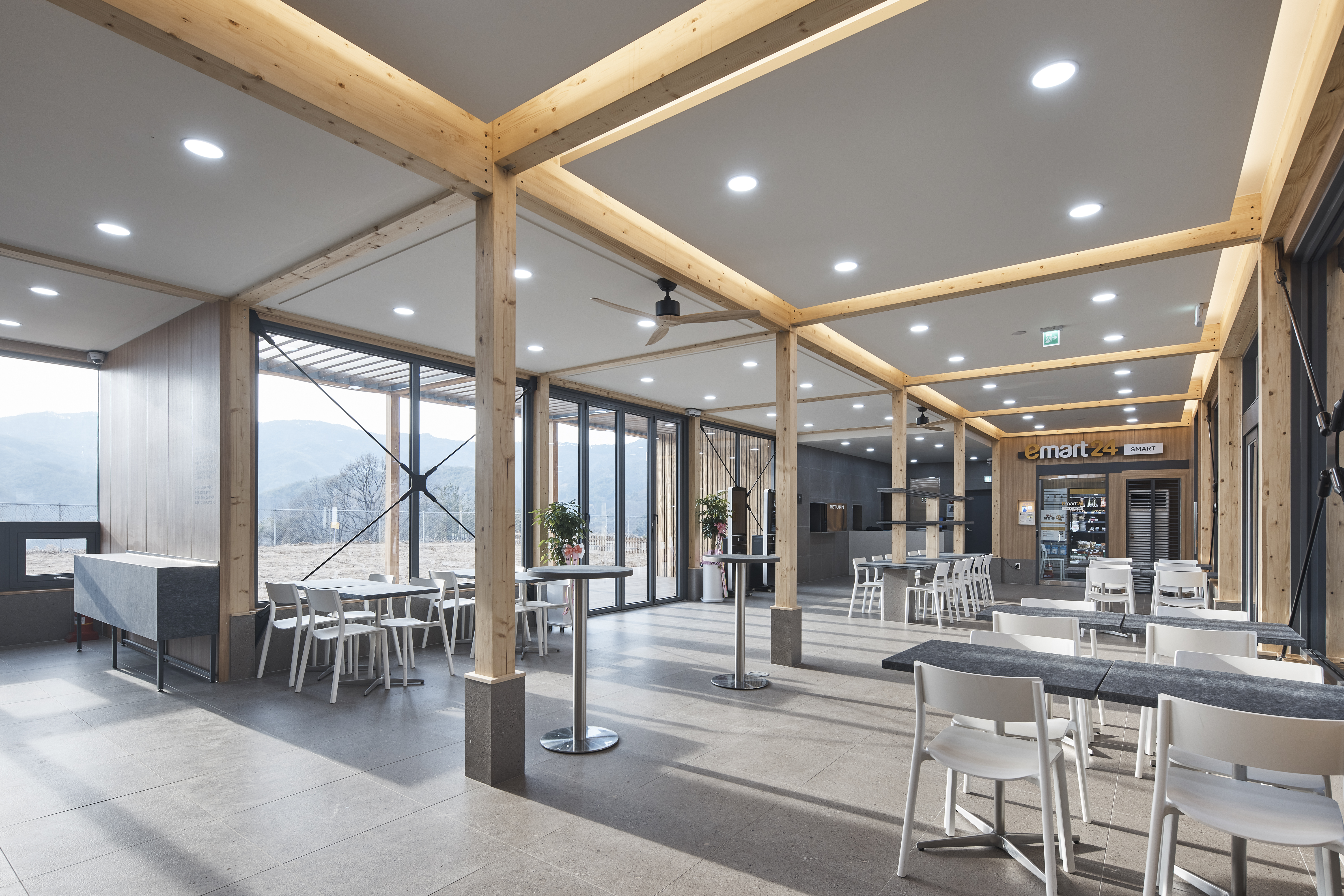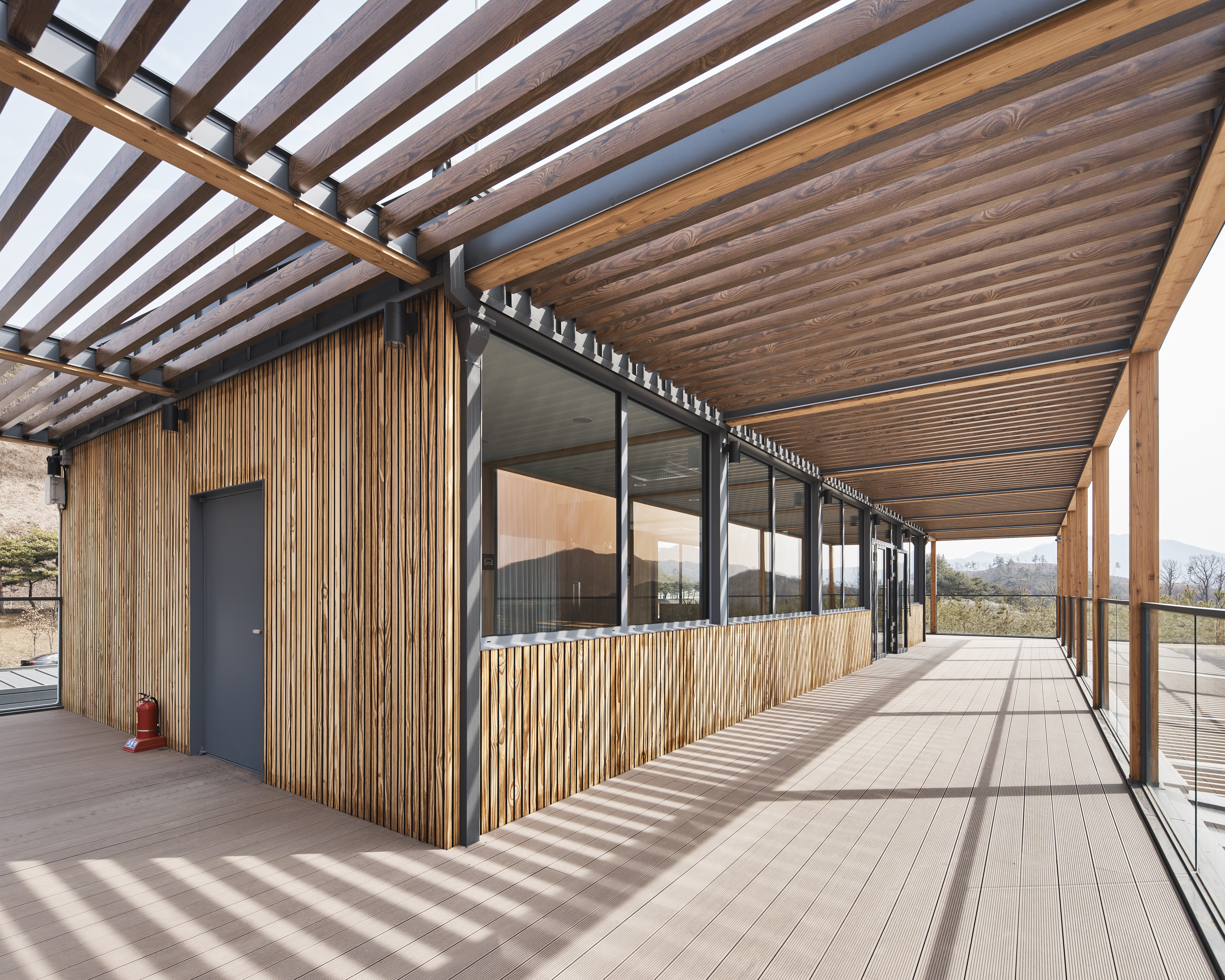 설계에서 중요했던 첫 번째 사항은 공공건축물과 친환경 목구조 형식의 최적의 조합 방법이었다. 공공건축에서 일반적으로 요구되는 넓은 경간, 높은 층고, 투명한 입면의 확보를 위해 중목 구조를 기준으로 한 골조 체계와 목재 판넬라이징 공법을 사용한 벽체구조를 혼용한 목구조 하이브리드 방식으로 지었다. 두 번째는 미래형 휴게소로서의 장소성 구현이다. 기존 내연기관 중심의 휴게소와는 달리 전기 충전을 위해 최대 1시간 이상 머물러야 하는 장소성이 확보되는 공간을 만들어야 했다. 차량 충전과 탑승자의 휴식공간을 일체화하여 공간을 구성했고, 휴게소의 주요 단위 기능인 화장실, 라운지, 편의점 등의 시설이 유기적인 동선을 가질 수 있도록 설계했다. 뿐만 아니라, 수려한 주변 자연환경을 바라볼 수 있는 전후면 외부공간, 2층 테라스 공간 등도 함께 계획했다. 세 번째는 모듈화를 통한 확장 가능성의 공간이다.
