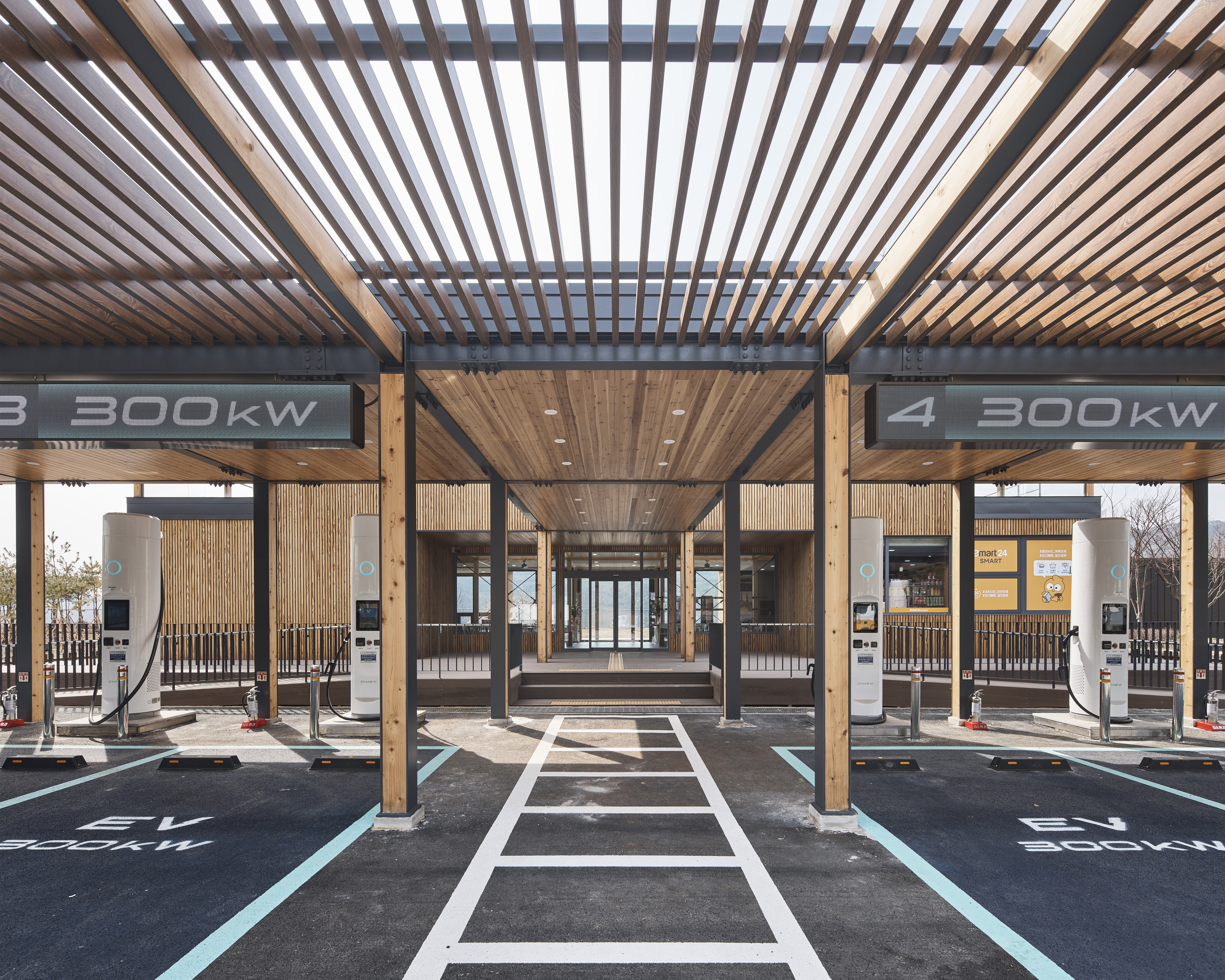 고속도로 충전라운지 “EVning” 프로젝트는 전기차 시대에 적합한 친환경 공공 건축을 제안한 작업이다. 한국도로공사는 환경기준의 강화 및 정부의 친환경 차 보급 정책에 따른 충전 인프라 확충을 위해 고속도로상의 전기차 충전소와 연계된 비대면 중심의 미래형 휴게 라운지 시범사업을 추진함에 따라, 차세대 휴게소 모델로서의 뉴노멀 전기차 충전라운지를 만들어야 했다.