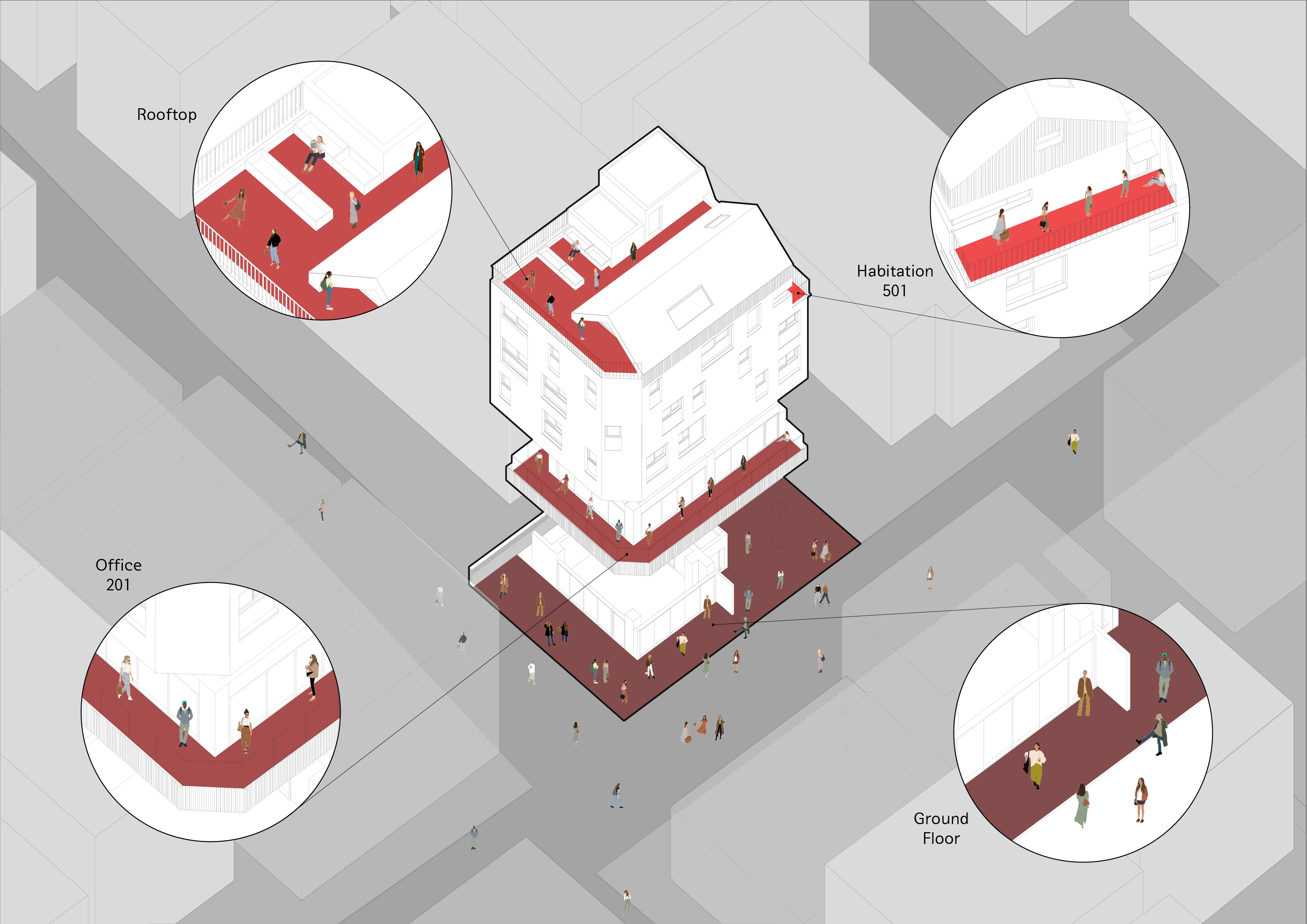 저층부는 가로를 향해 열려있고, 중층부는 주거의 채광과 환기를 위한 창을 뒀다. 다락층은 저층부의 재료를 반복하여 박공이 얹어진 듯한 형태다. 내부에는 층과 층 사이에 오프닝을 두어 공간을 연결했다. 1층과 2층 사이, 5층과 다락층 사이, 다락층과 천장 사이의 오프닝은 단절된 층을 연결한다. 외부의 벽돌타일 마감은 복도와 계단으로 연결되는 단순한 코어 방식이지만 외부의 느낌을 내부로 끌어들이는 효과를 준다. 중층부 이상의 주거 공간은 외부에서 바라볼 때와 내부에서 바라볼 때의 느낌을 다르게 주기 위해 창의 리듬감과 프라이버시에 따른 높이 변화 등으로 표현했다.