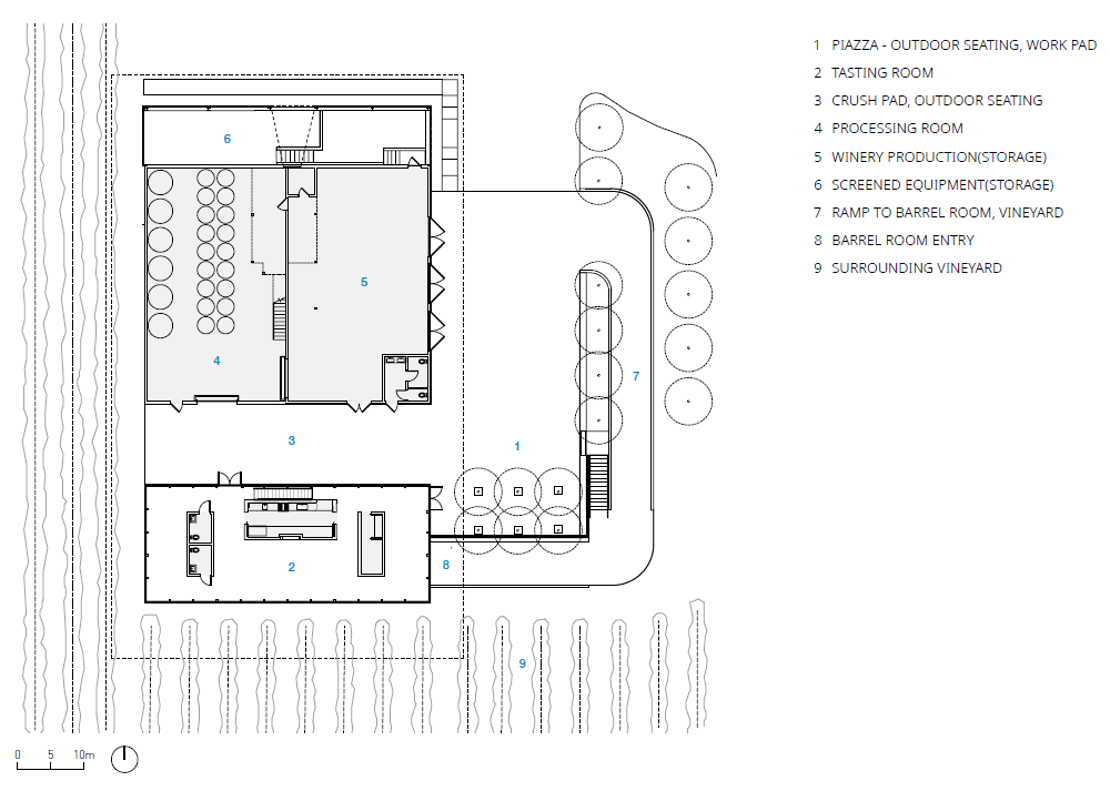주요 와이너리의 공간은 삼나무로 만들어진 스크린이 둘러싸고 있다. 이 스크린 벽은 빛에 따라 투명하기도 하고, 불투명해 보이기도 한다. 새로운 시음실은 사방이 유리로 감싸져 있어 주변 언덕의 전경을 한눈에 볼 수 있다. 주방과 욕실 등의 기타 공간은 시음실 공간의 안쪽으로 배치되어 있고 전면으로는 확실하게 열린 뷰를 가질 수 있게 설계했다. 와이너리와 시음실 사이에 자리 잡은 통나무집은 복합적인 기능을 하는 외부 공간으로 인접한 두 시설 모두에 귀중한 공간을 제공하는 동시에 주변의 포도밭을 구성한다. 수확 철에 와인 양조장에서 숙박을 할 수 있는 공간인 로지아도 마련되어 있다. 여름 동안 통나무집은 모임과 행사를 위한 공공 공간이 된다. 통나무집의 안뜰이자 광장은 현재 기존의 거주지와 확장된 와이너리 사이에 놓여 있다. 광장의 남쪽 끝은 포도밭 위로 올라가 건물 입구에서 접근할 때 극적인 지평선을 형성한다.