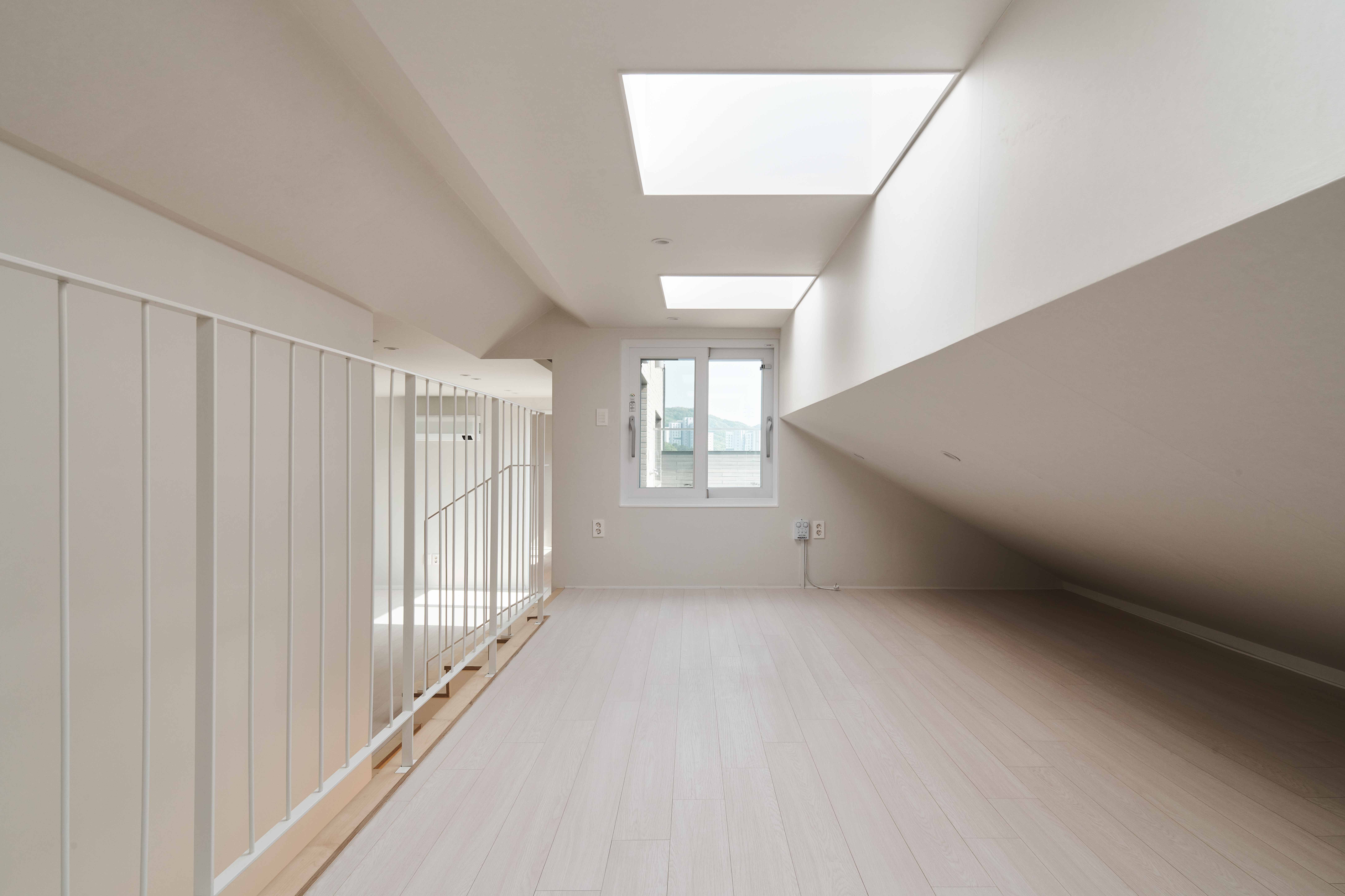 이 프로젝트는 다락의 면적이 줄어드는 것을 최소화하고자 복층 대신 4층의 전체 층고를 높이는 방향으로 계획했다. 다만, 층고 전체를 일괄적으로 높게 할 경우 다락으로 올라가는 계단이 너무 높아져 사용에 불편함이 발생하는 점을 감안하여 층고가 높을 필요가 없는 침실이나 화장실 공간은 기존의 층고를 유지하는 스킵플로어 형태로 계획했다.