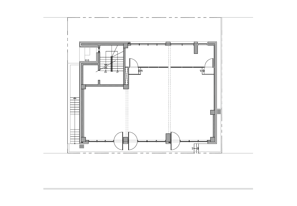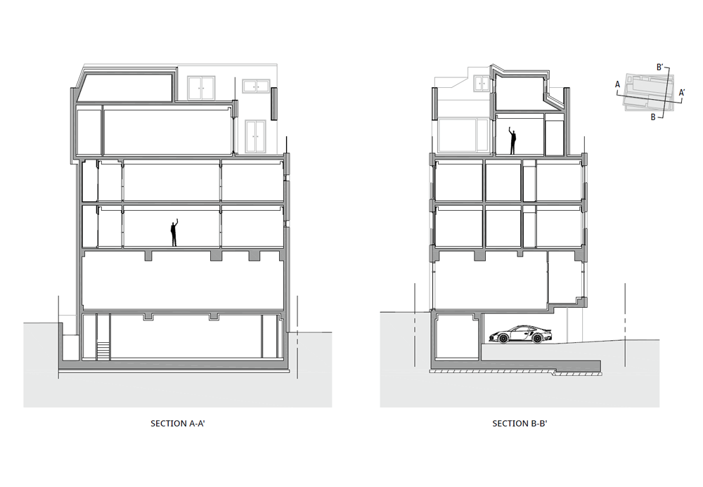 건물의 위치가 중심부에 있어 상가의 수익성을 극대화하는 것이 무엇보다 중요했다. 건물의 앞 뒤로 2개의 도로가 접해 있고 대지 내 단차가 2m 이상 나는 점을 이용해 채광이 잘 되는 반지하 형태의 추가적인 상가를 확보하고 뒤쪽 이면도로 지하층에 필로티 주차장을 배치했다. 뒤쪽 이면도로는 명목상 지하층이라고 해도 지상에 연결되기 때문에 지상층처럼 사용이 돼서 용적률이 부족한 대지의 한계를 극복하는 데 도움이 된다. 지하층 레벨에 주차 및 주택 출입구를 배치하여 앞측 중심도로에 1층 상가를 최대한 크게 마련하여 상가 수익을 극대화할 수 있었다. 지하층에 계획한 필로티 주차장으로 인해 상대적으로 지상 1층 상가 면적이 커졌고, 건축주 세대를 위한 주거 면적이 부족하여 다락에서 공간을 확보했다. 일반적으로 주인 세대를 다락층에 계획하는 경우 복층으로 개방감을 확보하는 경우가 많다.