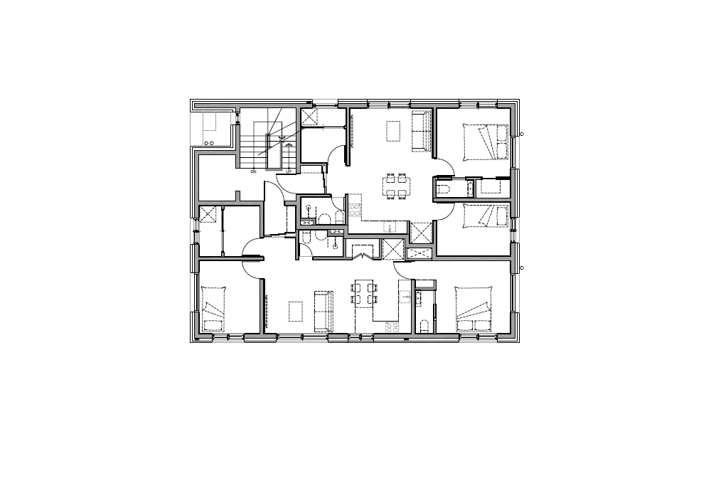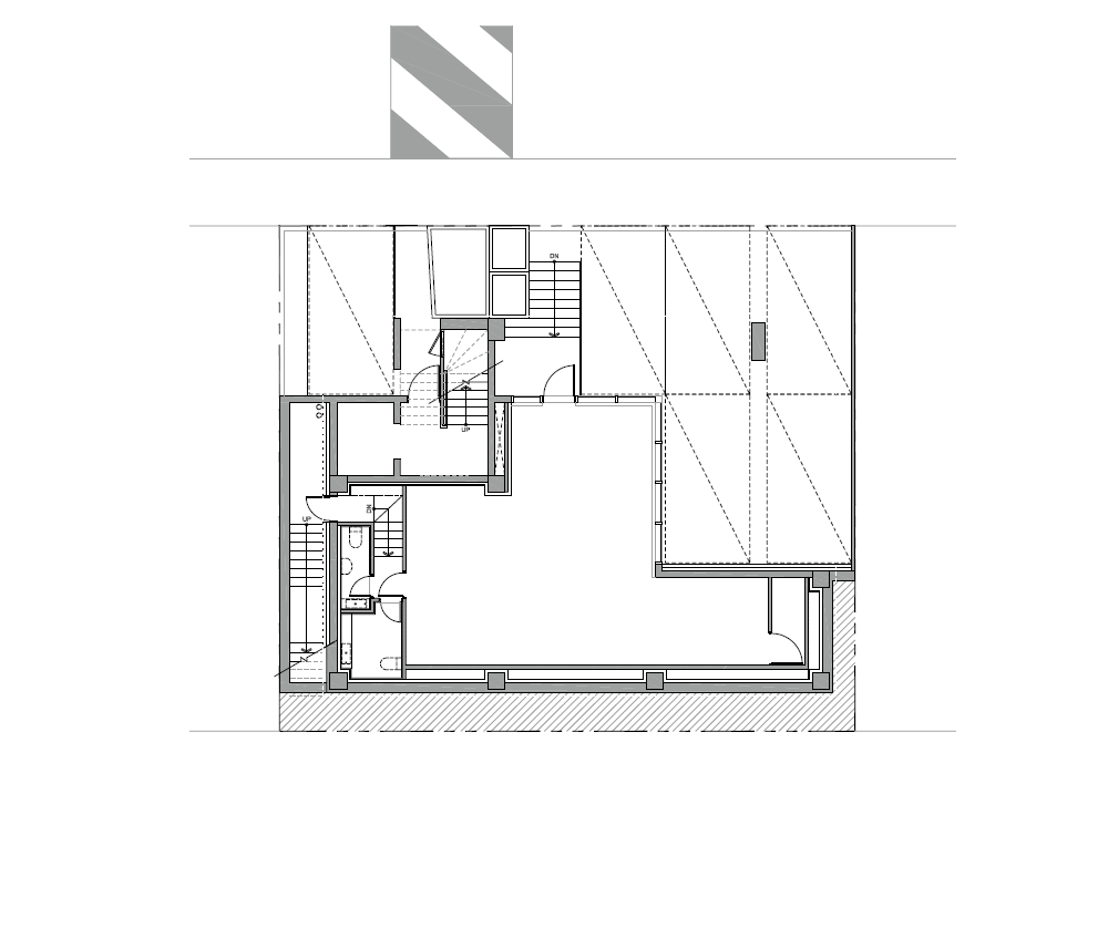 건물의 위치가 중심부에 있어 상가의 수익성을 극대화하는 것이 무엇보다 중요했다. 건물의 앞 뒤로 2개의 도로가 접해 있고 대지 내 단차가 2m 이상 나는 점을 이용해 채광이 잘 되는 반지하 형태의 추가적인 상가를 확보하고 뒤쪽 이면도로 지하층에 필로티 주차장을 배치했다. 뒤쪽 이면도로는 명목상 지하층이라고 해도 지상에 연결되기 때문에 지상층처럼 사용이 돼서 용적률이 부족한 대지의 한계를 극복하는 데 도움이 된다. 지하층 레벨에 주차 및 주택 출입구를 배치하여 앞측 중심도로에 1층 상가를 최대한 크게 마련하여 상가 수익을 극대화할 수 있었다. 지하층에 계획한 필로티 주차장으로 인해 상대적으로 지상 1층 상가 면적이 커졌고, 건축주 세대를 위한 주거 면적이 부족하여 다락에서 공간을 확보했다. 일반적으로 주인 세대를 다락층에 계획하는 경우 복층으로 개방감을 확보하는 경우가 많다.