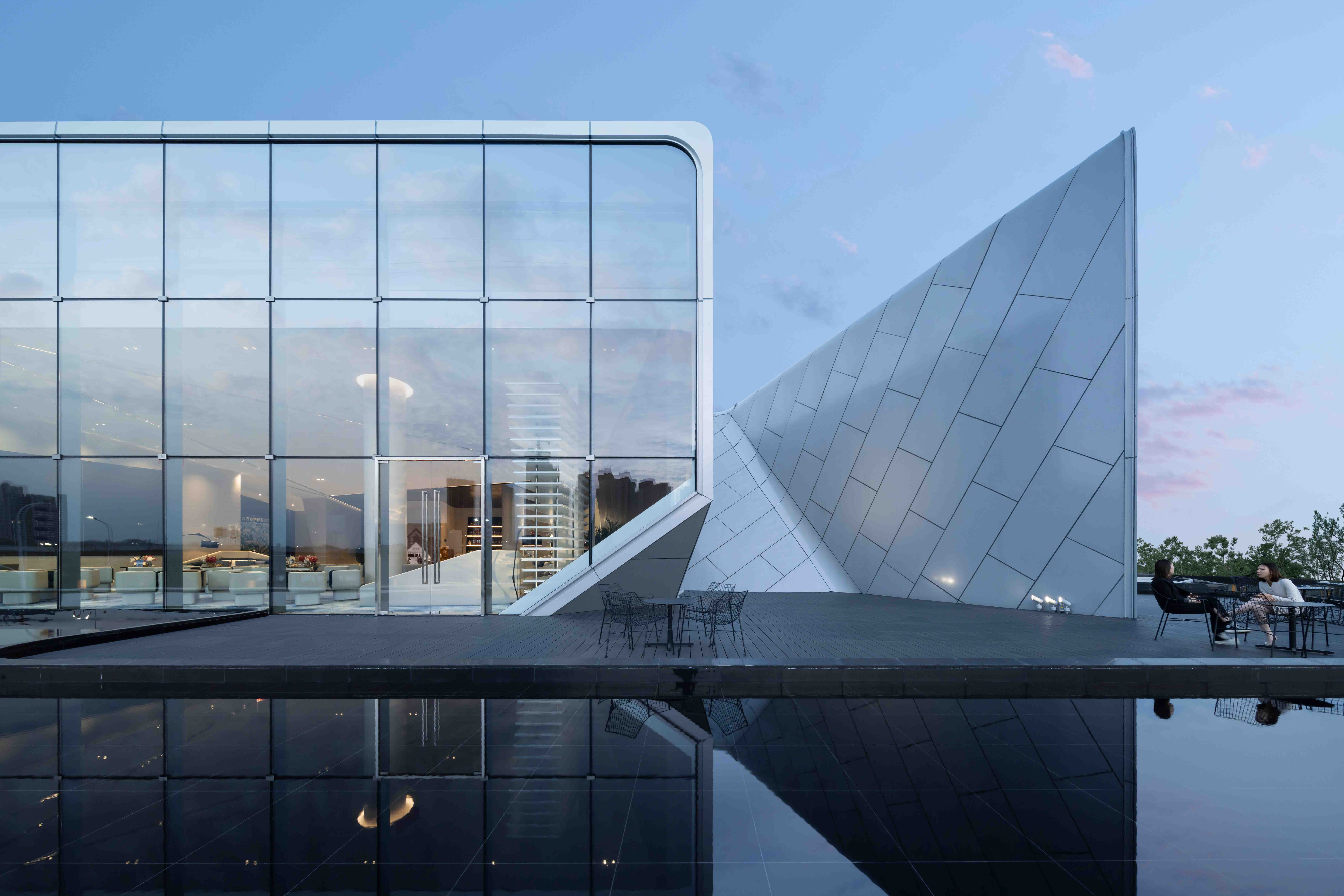 This case is located on the shore of Zhangjiang River in Ganzhou City. The site has great environmentalcharacteristics and atmosphere. The designeristellinga story of water in architectural language, soas to makethe buildingbe bornin water and integrated into thelandscape. Overlooking from distance, the building looks like a technology ark floating on the water.Its pure coloredmetal shell is integrated into the environment of same colored water and sky. When looking close,itsshapeis like waves, surrounded bywaterscapeand water curtain, creating a technology ark on the water.Itsdesignis based on the largeareafloor to ceiling windows and the smooth, concise and powerful shape, extendedalong the riverincombinationwith the terrain, and rotated to match the site. The blocks aresegmentedtoform a frame view.Taking the building as a boundary, the landscape design of the entrance square is regularand adopts simple geometric lines,itriseslayer by layer andis consistent with the building platform, just likethe rise of water waves to the shore.It presents a high-grade gray system as a whole, with auxiliarydetailssuch as aluminum plate, minimalist lines and diamond cutting surface, combing the beauty of light and shadow,and complementing the river scenery.