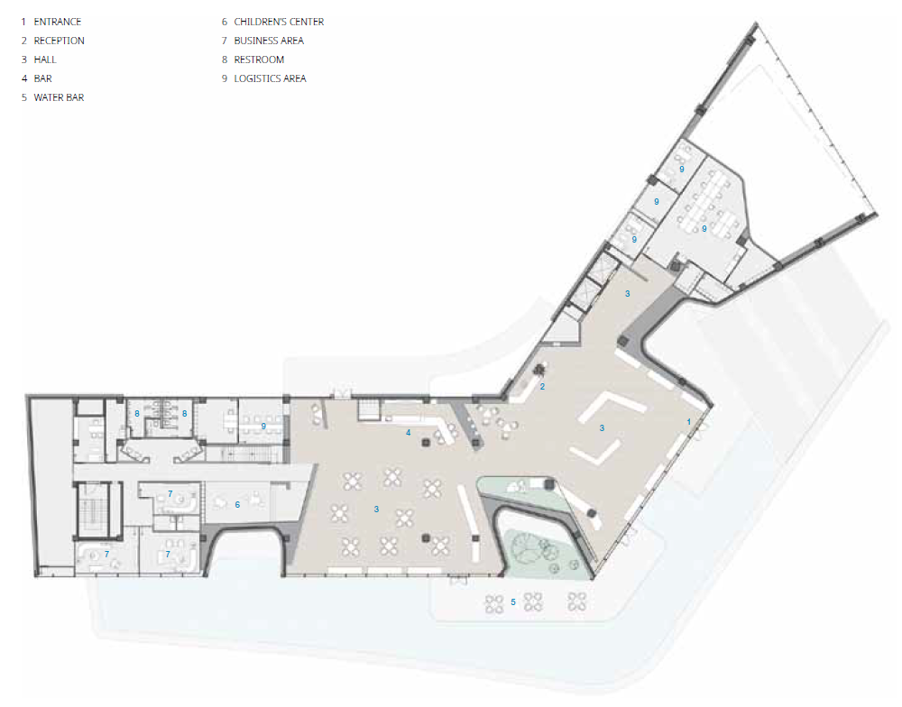 Waterscape runs through the beginningto theendwhensightseeingthebuilding. From the entrance landscapeto the waterscape on the second floor platform, from the construction near the water surface tothe watercurtain, the landscape is integrated with the building.Due to the irregular shape of the site, the backyardspace is relatively hidden and quiet, with curve ramps are used to gradually fit the boundary, the color layouttends to be lively and flexible,andan area for children's amusement and outdoor activitiesis set.
