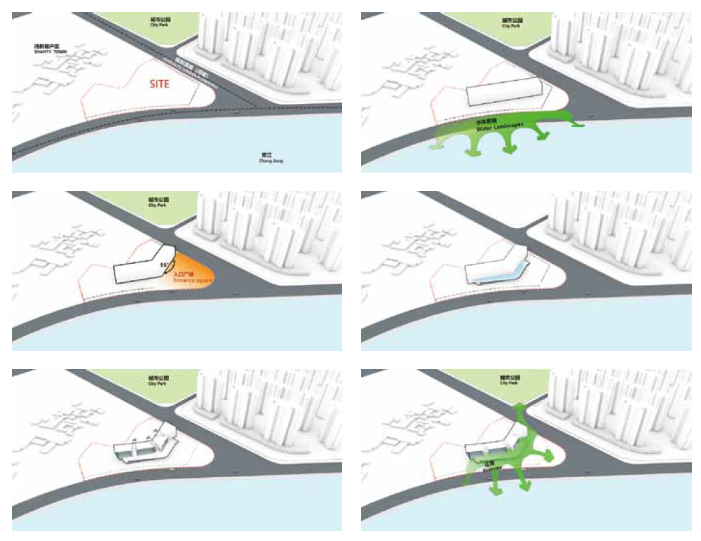 건물의 입구부터 2층의 플랫폼에 이르기까지 주변을 감싸는 수변 환경이 일체화되어 수경화(水景畵)를 만들어낸다. 주변의 불규칙적인 대지의 형태로 인해 건물 전경에 비해 뒷면의 정원이 조용하게 숨어있으며, 곡선의 경사로를 이용하여 경계를 따라 이동할 수 있다. 입구 광장은 규칙적이고 단순한 기하학 선을 채택하여 물가로 물결이 밀려오는 듯한 이미지를 디자인으로 형상화했다.
