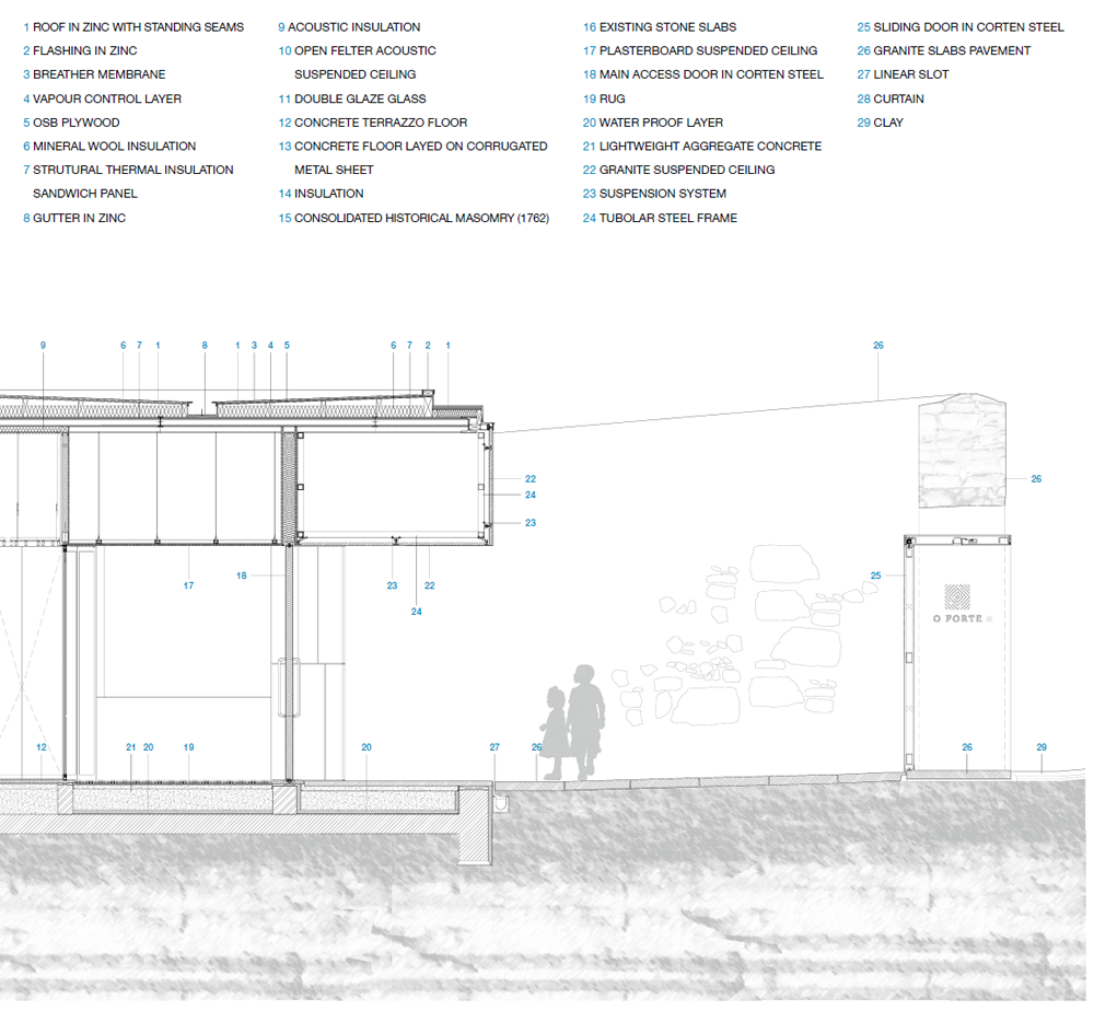 건축가는 이 공간을 새롭게 재단장하며 해안 기후조건에 적응할 수 있도록 건물의 벽의 두께를 강화했고, 공간의 맥락에 따른 새로운 형태로 보이도록 유리와 석재로 만들어진 단층의 건물로 계획했다. 일부 보존한 벽에 더욱 높은 벽을 연장하여, 새로운 볼륨감이 거친 바닷가의 환경과 대화하며 이 지역의 랜드마크로 거듭나길 바랐다. 재단장한 크리즈미나 요새의 건물은 다목적의 개별적인 행사를 위한 단층의 열린 공간이다. 기존의 벽과 건물 사이의 야외 마당은 건물의 형태에 따라 분절된 세 개의 공간으로 구성되었다. 동측과 서측, 남측을 각각 향하는 다각형 구조의 건물은 대서양에 노출된 바람의 저항을 느슨하게 한다.