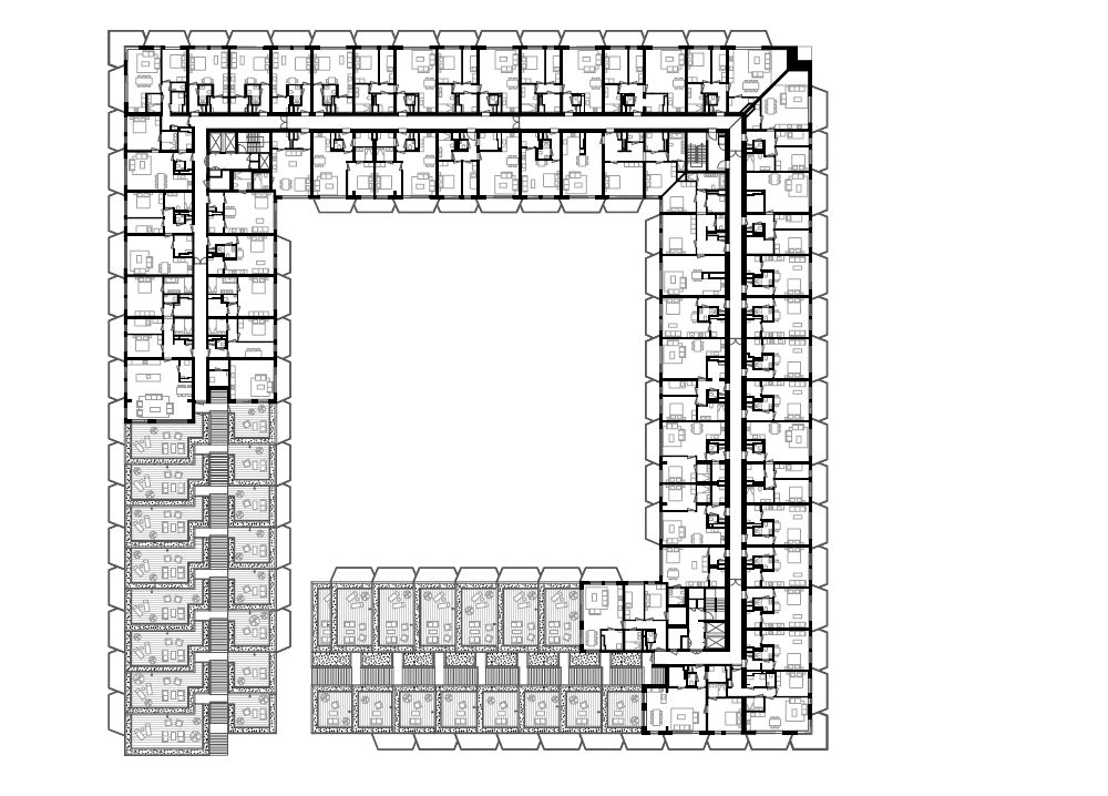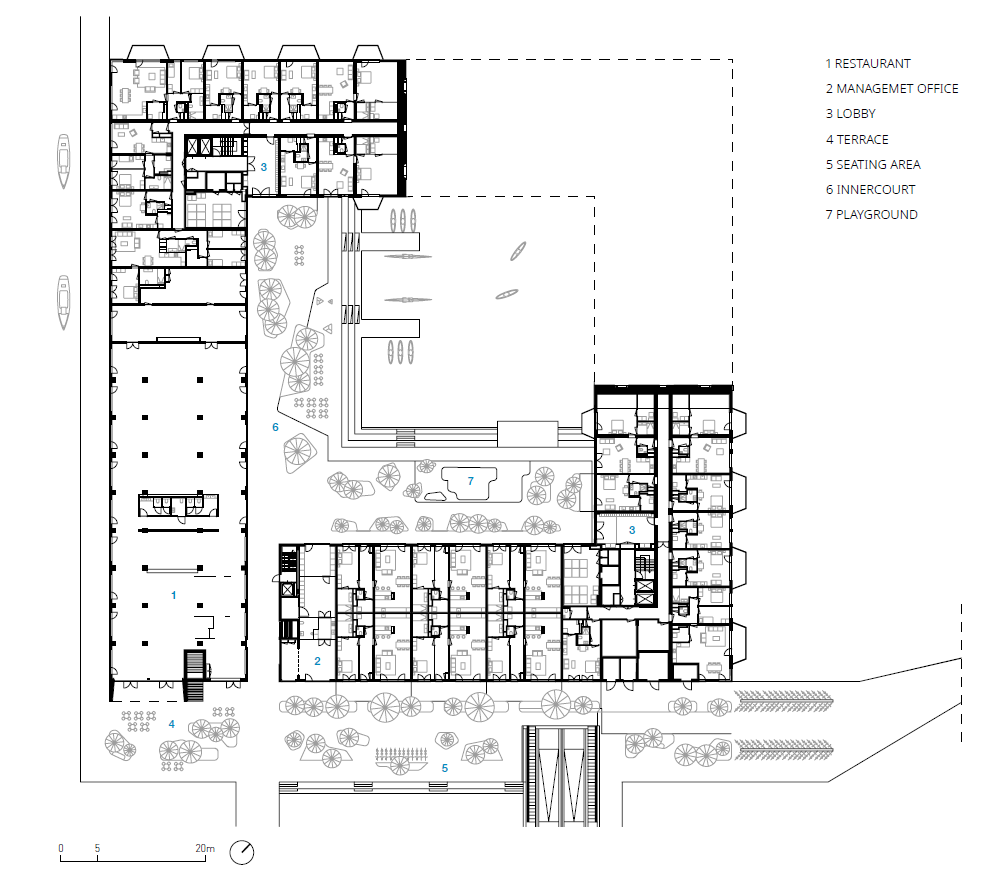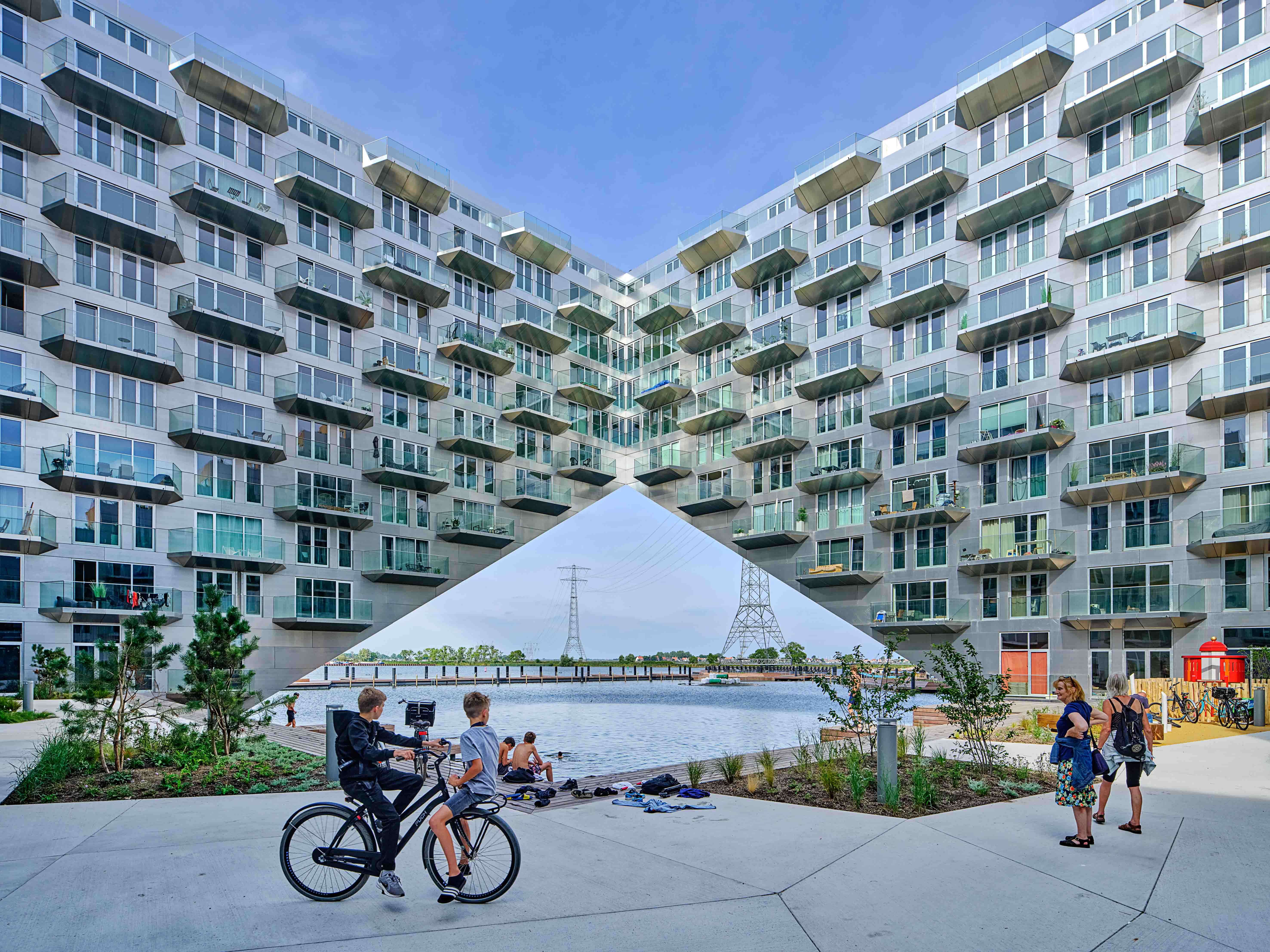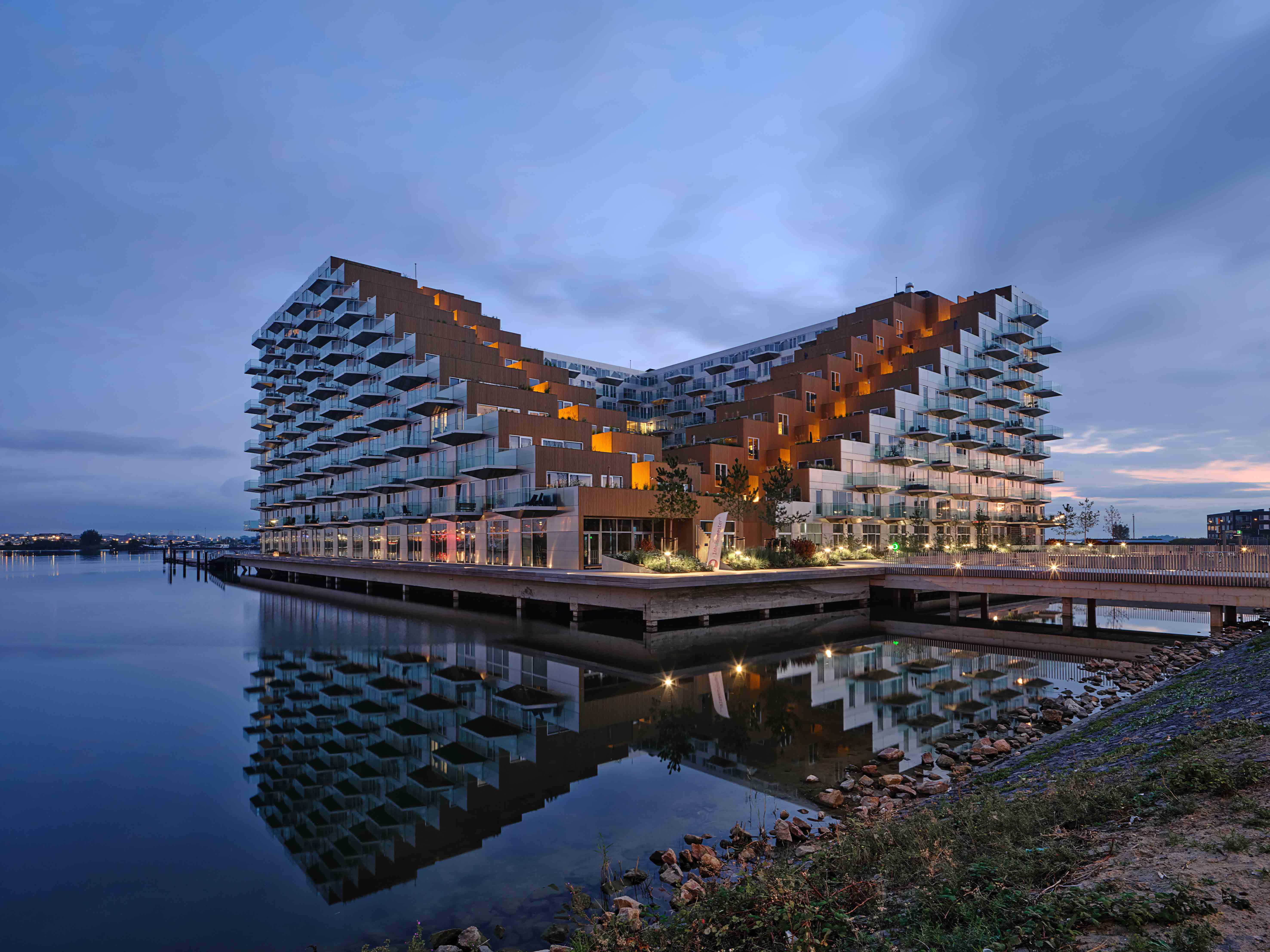 건물 전체의 구조는 물에 강한 콘크리트가 사용됐으나, 중앙 정원을 향하는 외벽과 해안가의 좌석 공간, 보행로 일부는 목재를 사용하여 호수 에서 바라보는 입면과는 색다른 느낌을 준다. 비스듬히 올라가는 계단의 형태를 띈 건물의 전체적인 매스는 아파트 내의 일광을 최적화 하고 이웃을 향해 블록이 내려오는 구조를 만들어 각 세대마다 넓은 테라스를 제공한다. 마치 작은 언덕의 정상에 등반하는 듯한 건물의 경사는 모든 세대에서 호수를 바라볼 수 있게 한다. 건물의 내부에는 총 442호의 거주용 세대 이외에도 다양한 프로그램을 포함하고 있다. 1층에서는 인접한 호수에서 즐길 수 있는 세일링 스쿨과 수상 스포츠 센터가 마련되어 있고, 호수를 바라볼 수 있는 테라스와 레스토랑이 있다.