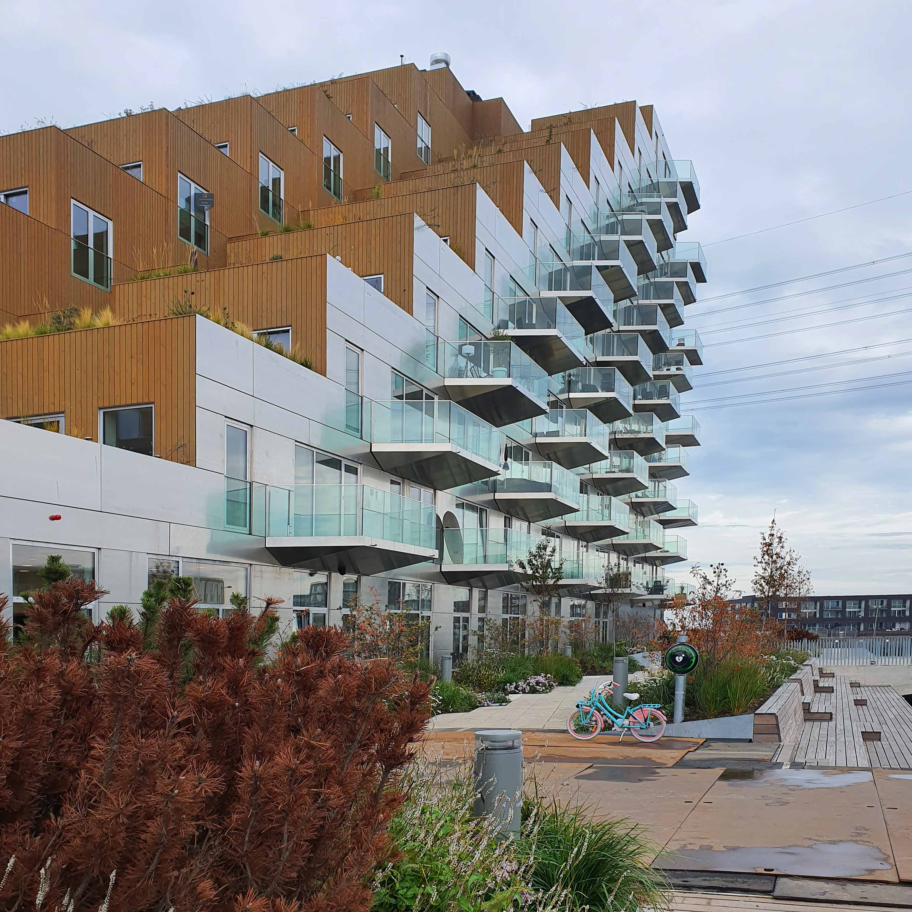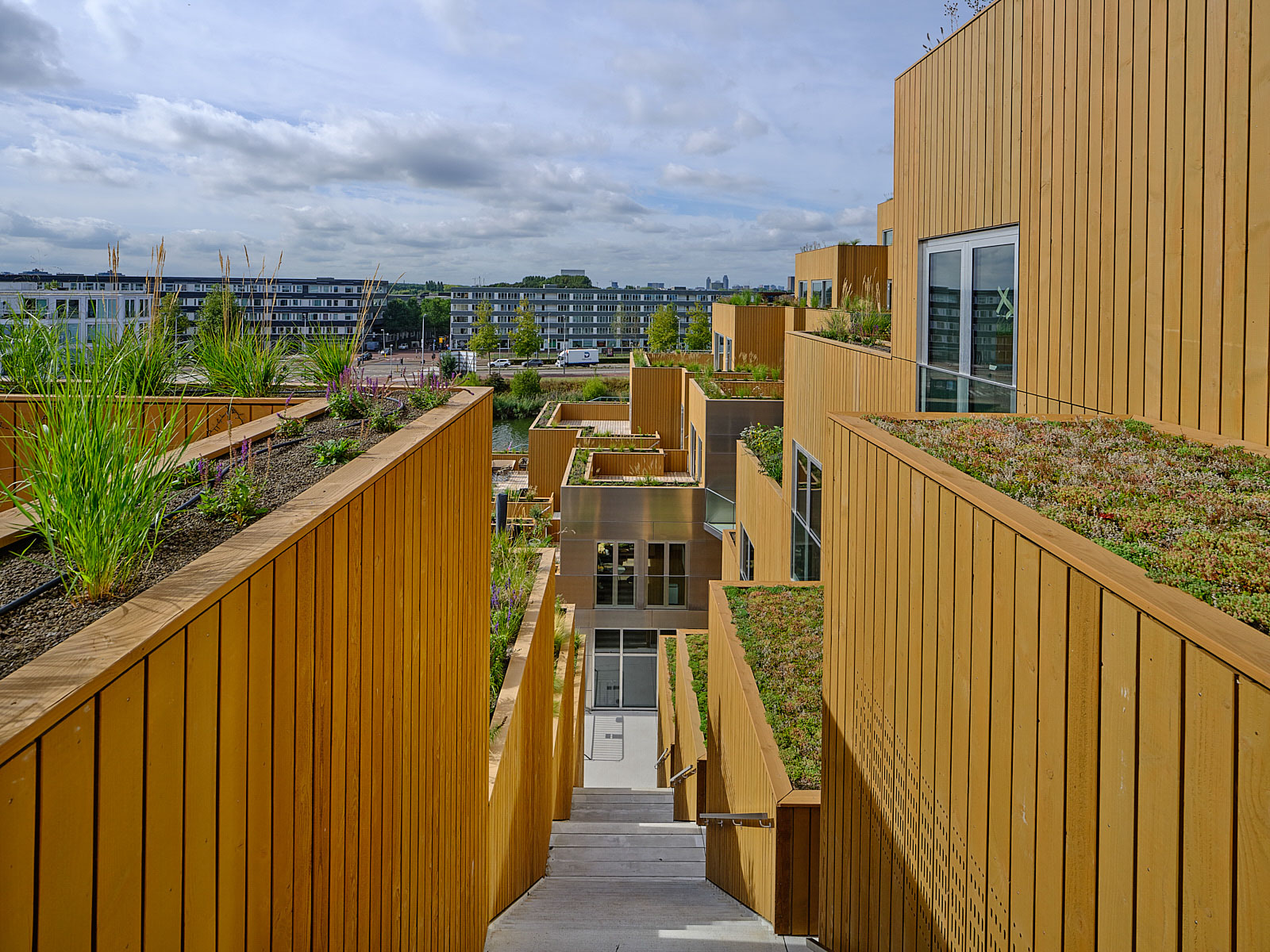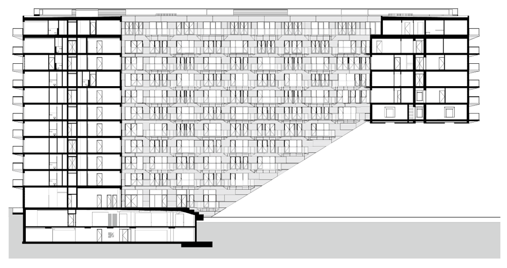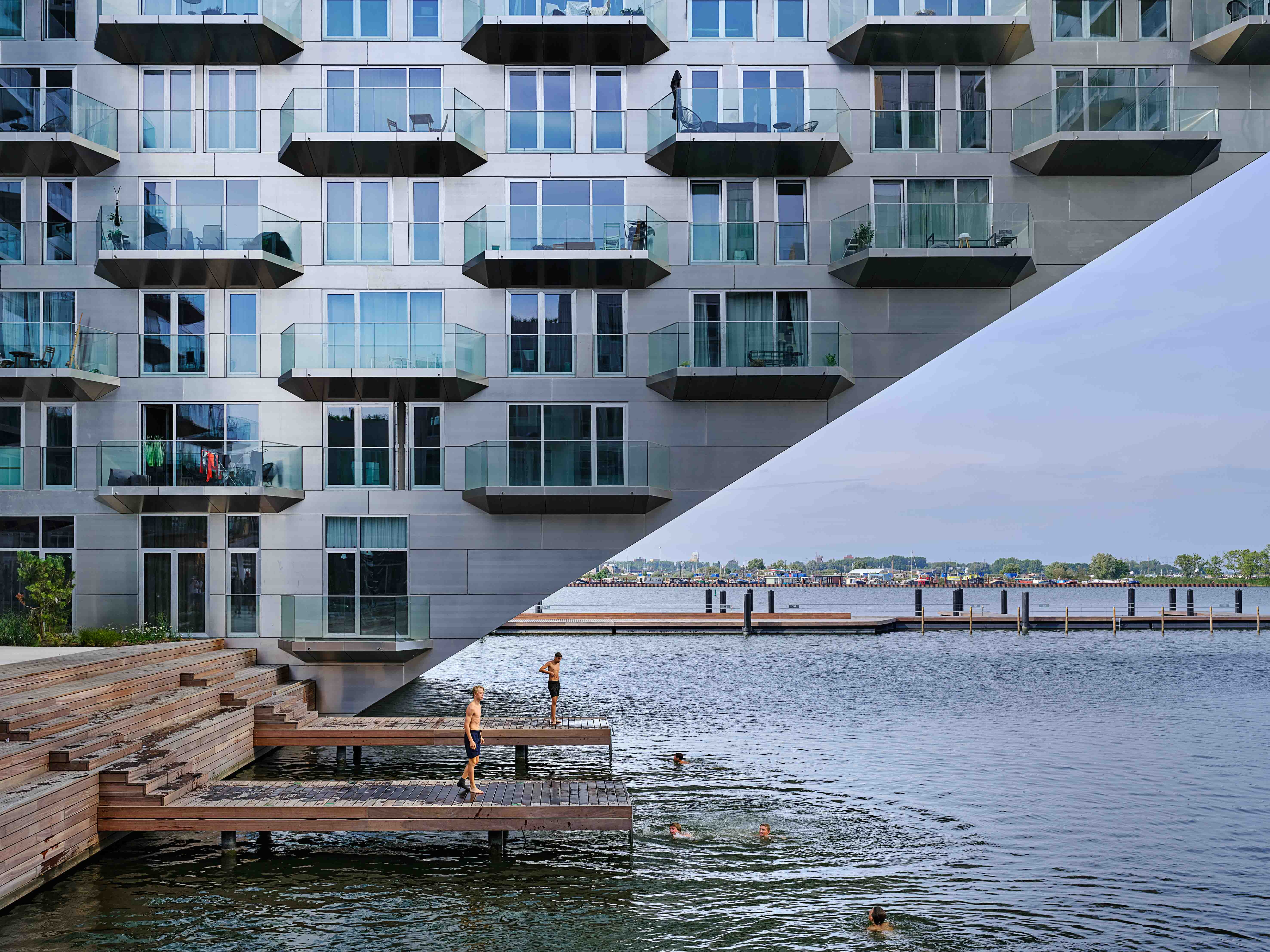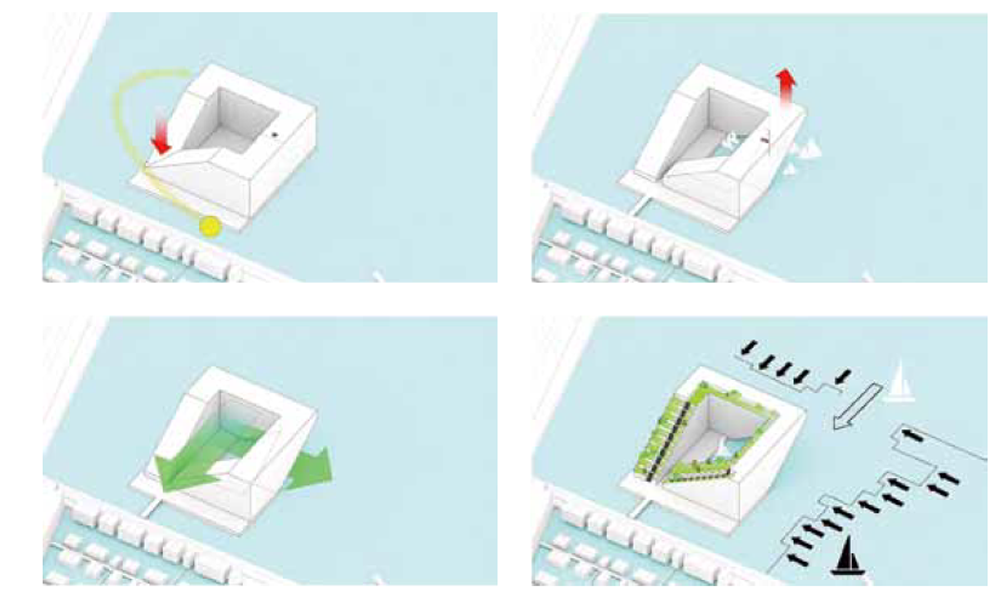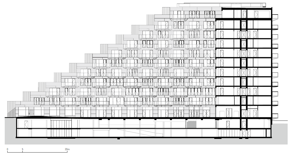 건물 전체의 구조는 물에 강한 콘크리트가 사용됐으나, 중앙 정원을 향하는 외벽과 해안가의 좌석 공간, 보행로 일부는 목재를 사용하여 호수 에서 바라보는 입면과는 색다른 느낌을 준다. 비스듬히 올라가는 계단의 형태를 띈 건물의 전체적인 매스는 아파트 내의 일광을 최적화 하고 이웃을 향해 블록이 내려오는 구조를 만들어 각 세대마다 넓은 테라스를 제공한다. 마치 작은 언덕의 정상에 등반하는 듯한 건물의 경사는 모든 세대에서 호수를 바라볼 수 있게 한다. 건물의 내부에는 총 442호의 거주용 세대 이외에도 다양한 프로그램을 포함하고 있다. 1층에서는 인접한 호수에서 즐길 수 있는 세일링 스쿨과 수상 스포츠 센터가 마련되어 있고, 호수를 바라볼 수 있는 테라스와 레스토랑이 있다.