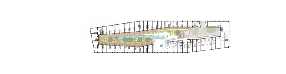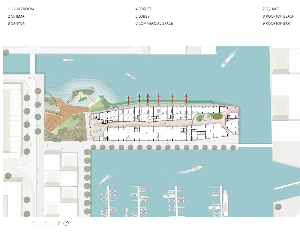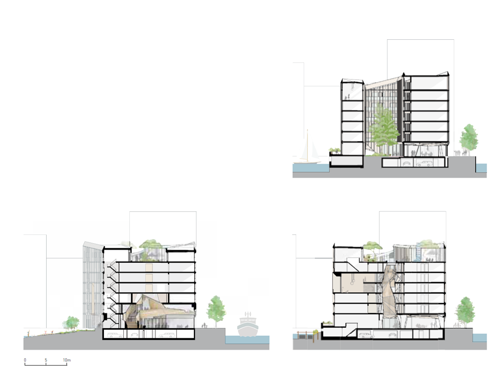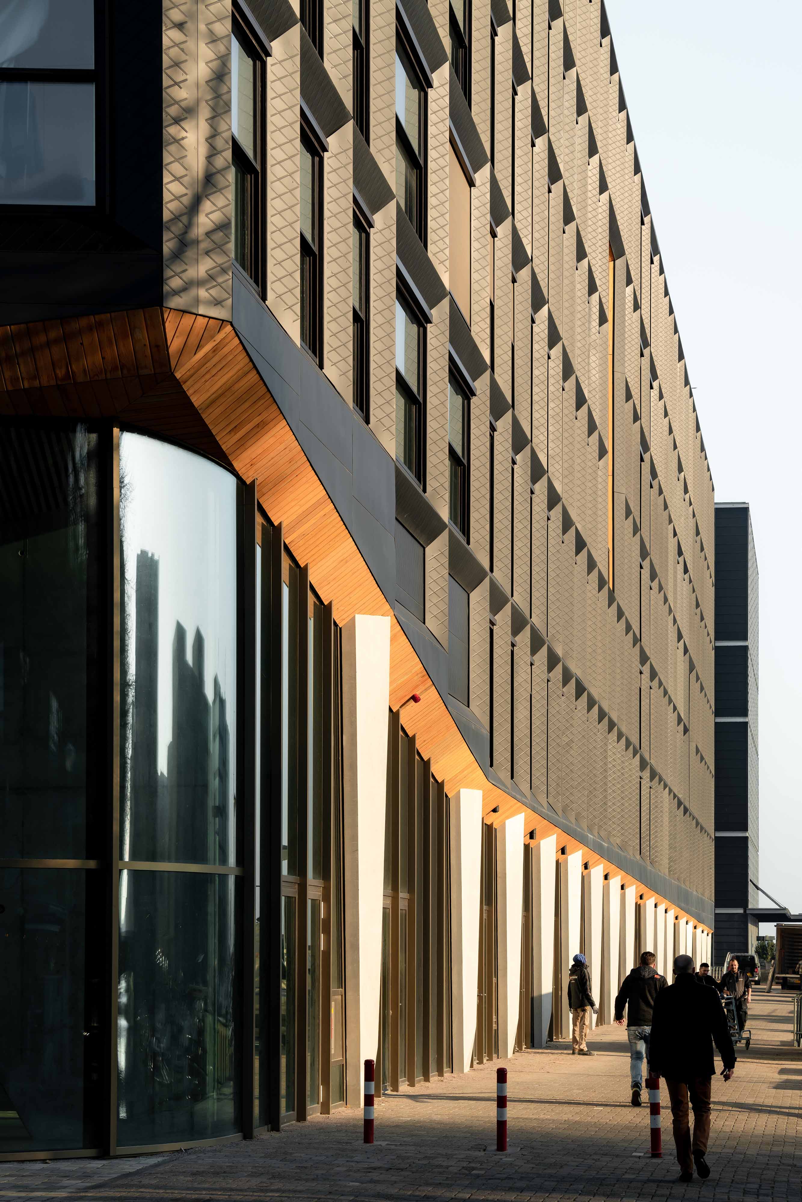 건물의 형태 개념은 전통적인 목재선의 구조에 기반을 둔다. 건물의 파사드는 대지에서 들어올려진 형태로 다이아몬드 형태의 볼륨을 형성한다. 불규칙적인 개구부의 형태와 특허를 받은 아연 소재의 마감을 사용한 창문은 건물 전체가 부드럽게 물결치는 듯한 인상을 준다. 주요 구조는 일련의 트러스 형태로 골격을 이루고 전체 볼륨 중 상당한 부분은 빈 공간을 형성한다. 특히, 내부의 트러스는 협곡 모양의 공공 경로와 독특한 골격을 형성한다.