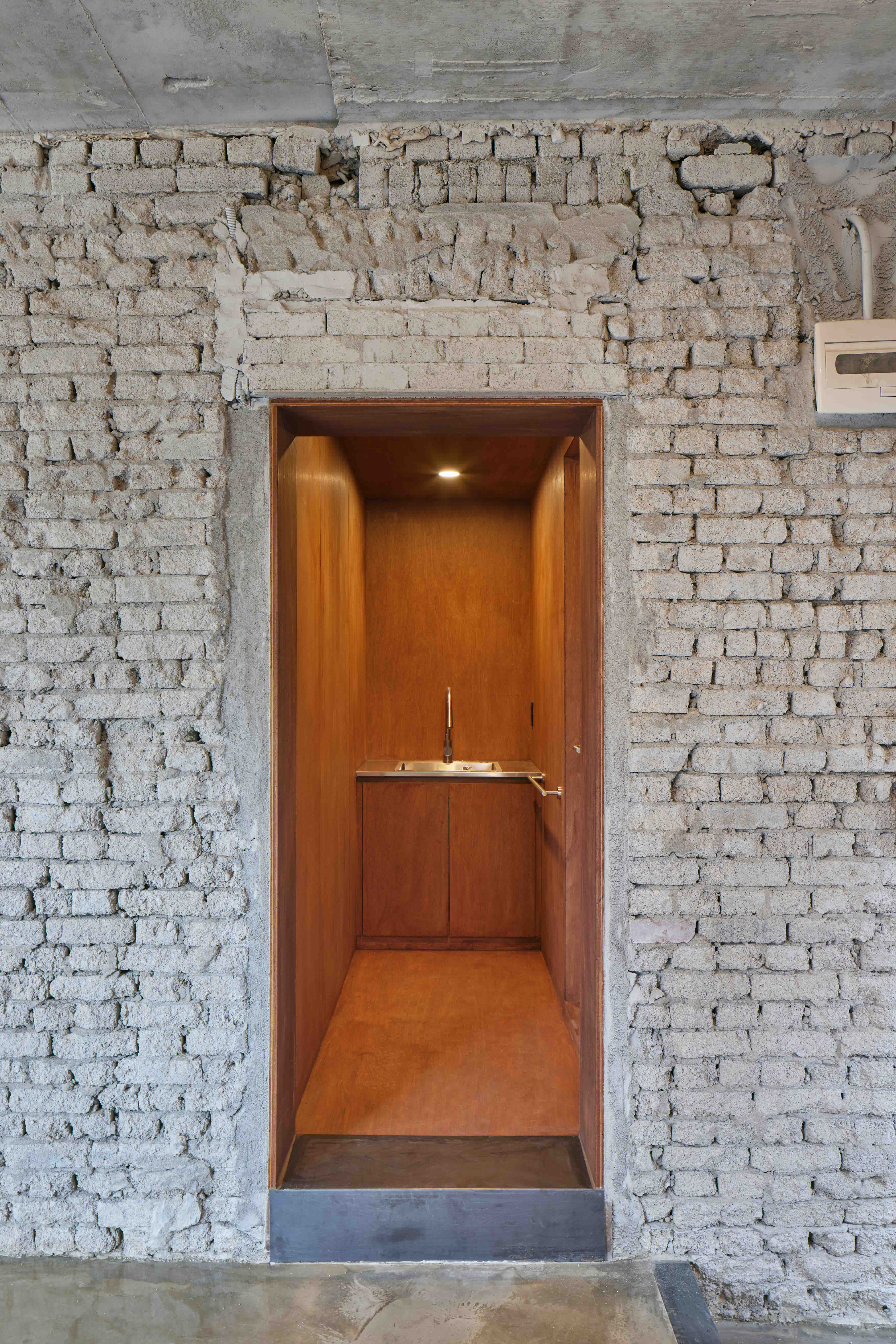 초기 계획안에서 덜어낼 것을 고민하는 것보다 최소한으로 남길 것들을 고민해야 했고, 그런 상황에 건축가 가 할 수 있는 일은 별로 없었다. 건축주는 어쩌면 타절을 원할 수도 있겠다는 생각이 들었지만 성격상 그렇게 끝내기는 더 싫었기에 당초 계약했던 설계비도 삭감해가며 그 와중에 할 수 있는 일을 찾아 존재의 의미를 증명해야 하는 묘한 외통수에 놓여졌다. 무언가를 더 증설하고 새로 넣을 여력이 없는 환경은 오히려 반대로 걷어내고 비우는 행위에 더 치중을 하게 만든다. 내외부벽체는 박피를 하듯 마감과 미장, 칠들을 걷어내며 오롯이 공간을 구성하는 날것의 물성을 드러내어 공간이 변모했던 흔적, 혹은 유적과 같은 층위를 노출시켜 다시금 공간이 늙어갈 수 있는 지속적인 가능성을 부여하였다.