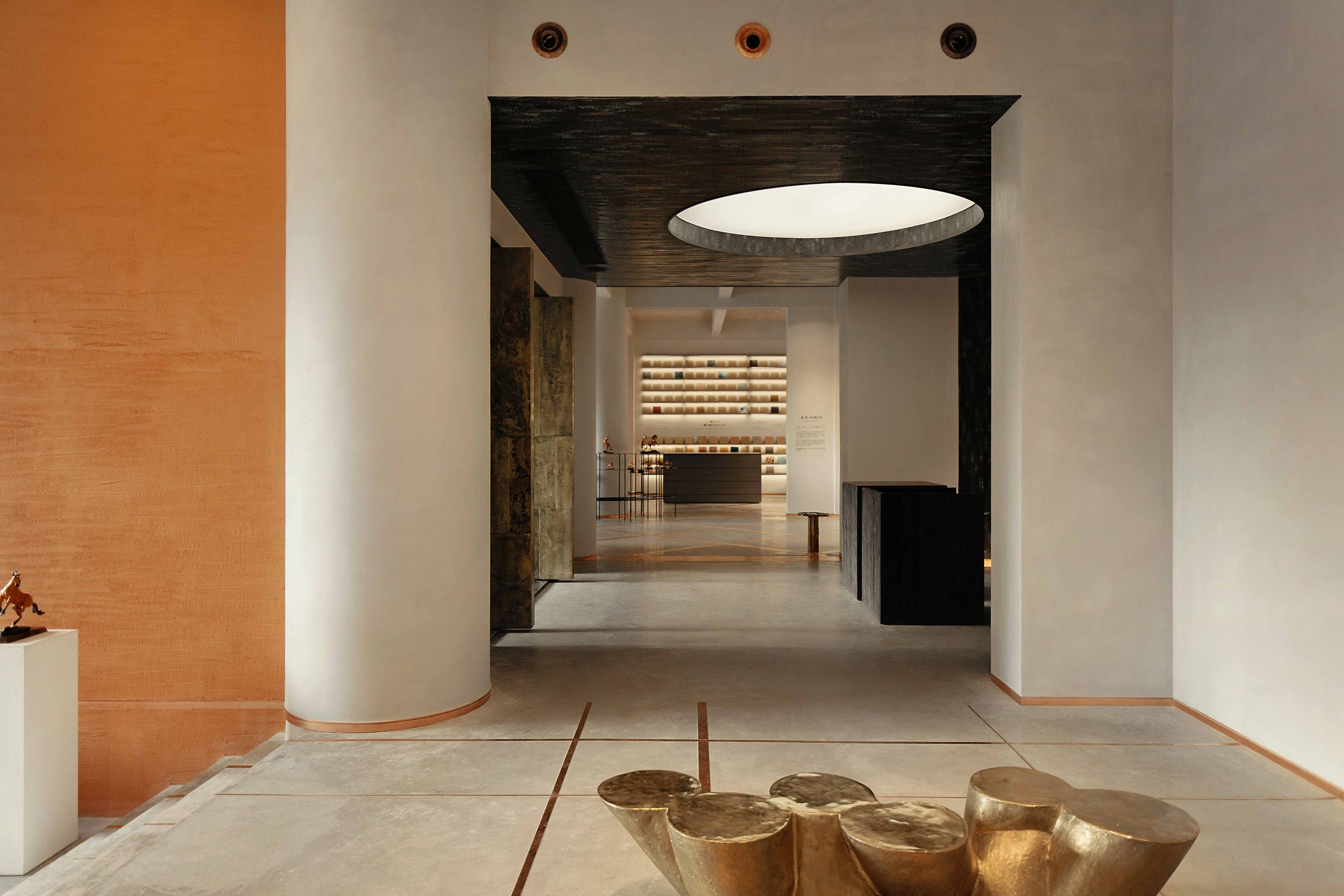 루이스 칸은 ‘디자인은 형태를 인식하는 것부터 실체를 구현하기까지의 일종의 활동’이라 했다. 융 징퉁의 구리문화전시장은 기능에서 미를 발견하고 전통 동양문화의 본질을 담아내고자 했다. 비대칭 기둥과 바닥에서 천장까지 설치된 창은 내부와 외부의 상호작용을 극대화한다. 창문을 통해 자연광이 비쳐 건축에 대한 자유, 나아가 공간의 흐름까지 내외부를 연결한다. 이에 따라 진열된 제품들은 브랜드의 콘셉트를 시각적으로 표현할 수 있다. 자연광이 드는 낮에는 금속의 질감을 느낌을 느낄 수 있고, 밤에는 빛과 그림자가 구리를 돋보이게 하여 공간까지 선명하게 보여준다.