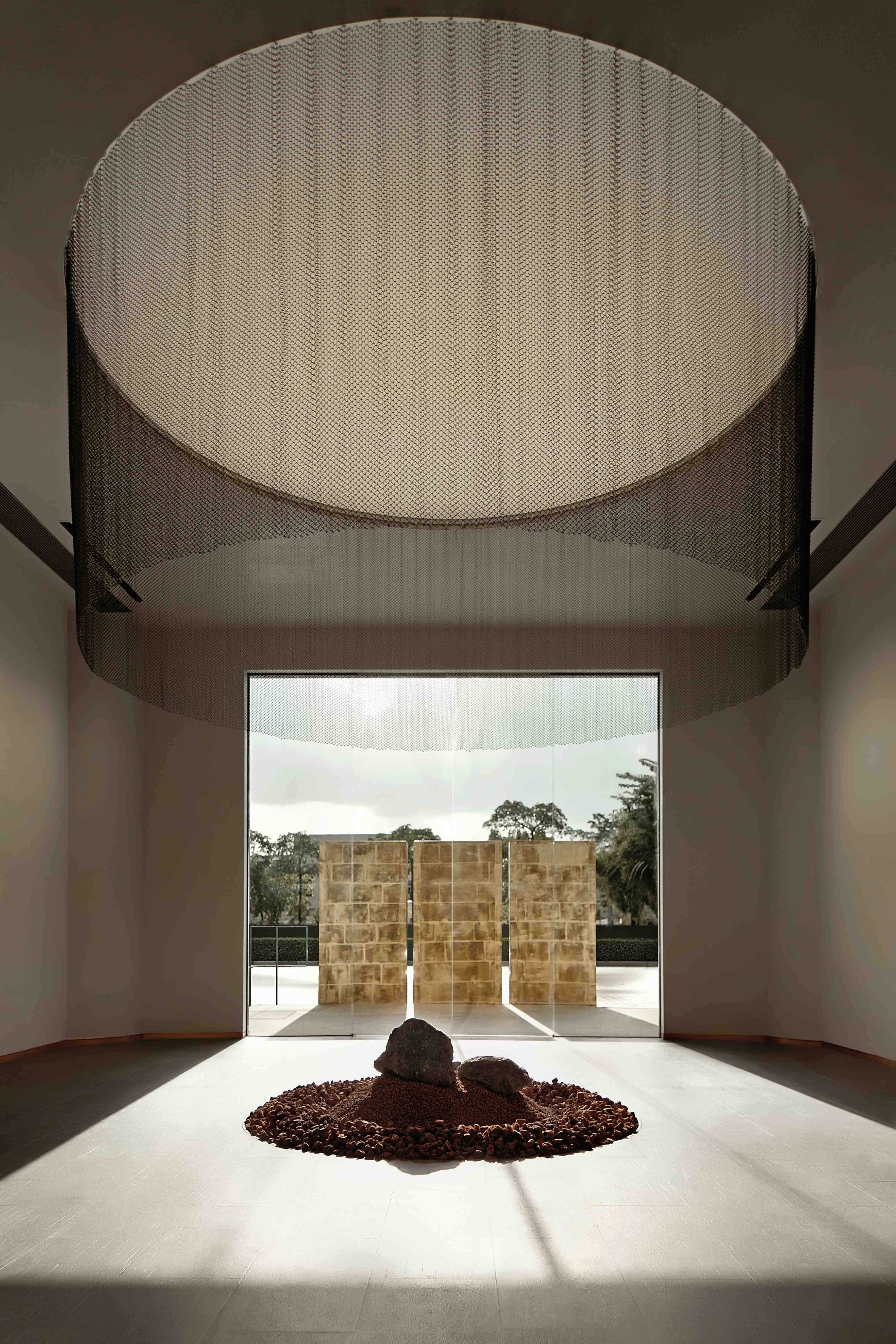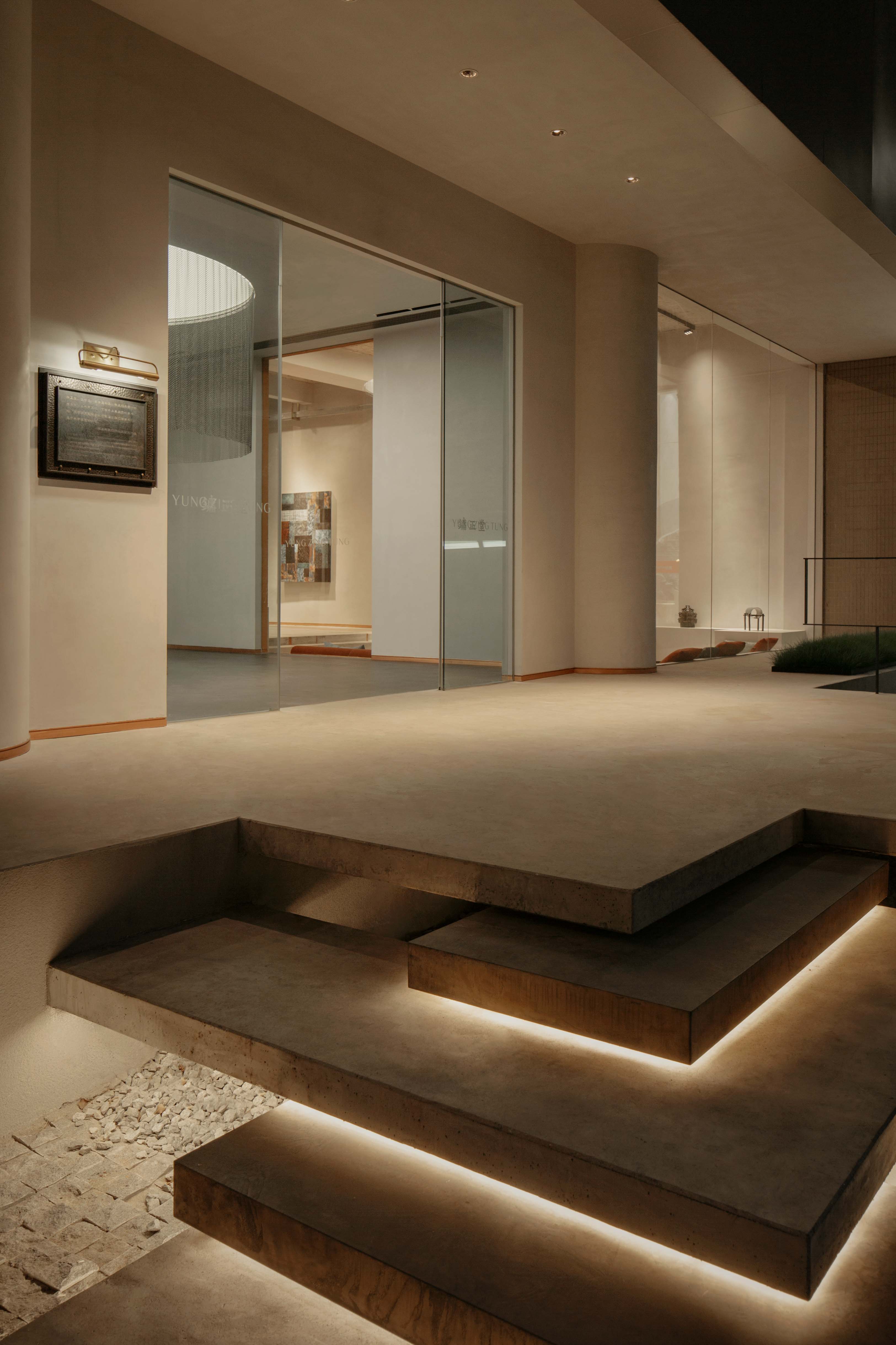 루이스 칸은 ‘디자인은 형태를 인식하는 것부터 실체를 구현하기까지의 일종의 활동’이라 했다. 융 징퉁의 구리문화전시장은 기능에서 미를 발견하고 전통 동양문화의 본질을 담아내고자 했다. 비대칭 기둥과 바닥에서 천장까지 설치된 창은 내부와 외부의 상호작용을 극대화한다. 창문을 통해 자연광이 비쳐 건축에 대한 자유, 나아가 공간의 흐름까지 내외부를 연결한다. 이에 따라 진열된 제품들은 브랜드의 콘셉트를 시각적으로 표현할 수 있다. 자연광이 드는 낮에는 금속의 질감을 느낌을 느낄 수 있고, 밤에는 빛과 그림자가 구리를 돋보이게 하여 공간까지 선명하게 보여준다.