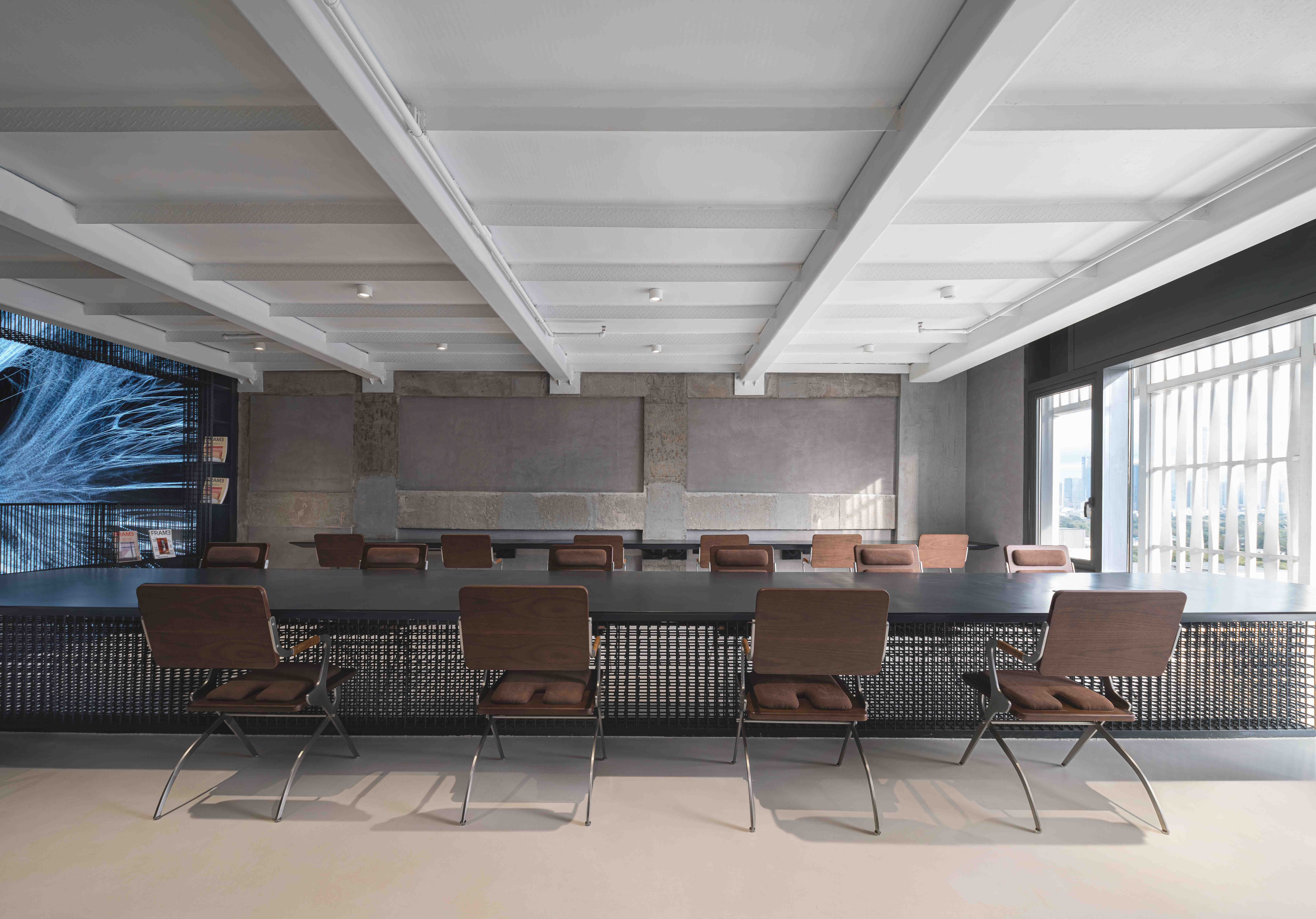 프레임(FRAME)은 홈 인테리어와 제품을 디자인하고 홍보하는 미디어를 운영하는 회사로, 선전 지역에 새로운 사무실을 만들며 독특한 국제 문화와 상업적 분위기를 연출하며 개방적이고 포용적인 협력 문화 플랫폼을 마련하고자 했다.전체적인 디자인 컨셉은 ‘프레임’(Frame)을 주제로 하여 공간, 구조, 형태, 재료를 재해석 했다. 층고 8.8m의 로프트 공간을 기준으로 내부 공간 배치를 재구성했다. 프레임 구조는 공간 전체의 확장감과 투명성을 보장한다. 이는 다양한 시간대에서 변화하는 자연광 아래에서 공간과 사람들을 통합하며 신선한 분위기를 제공한다.