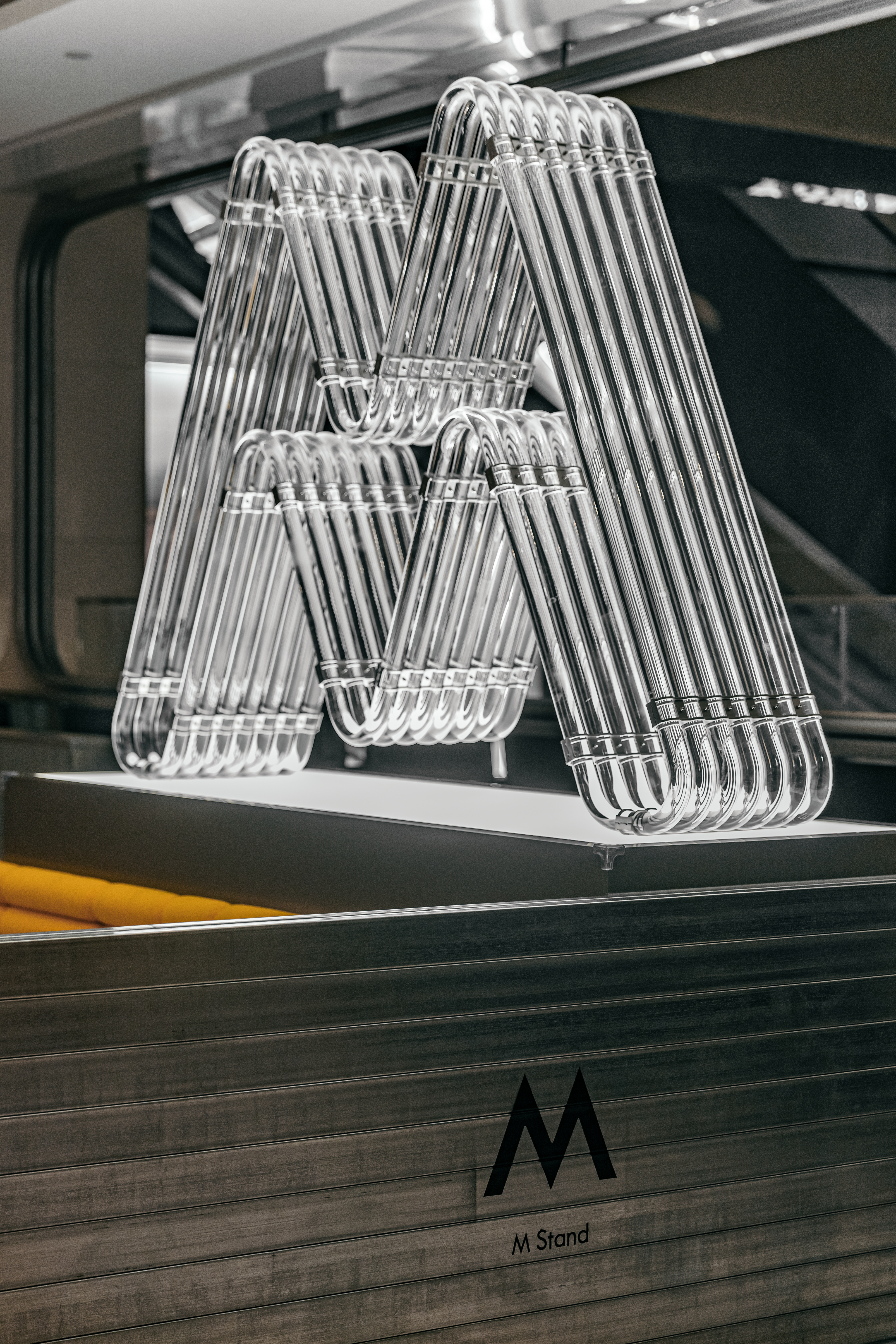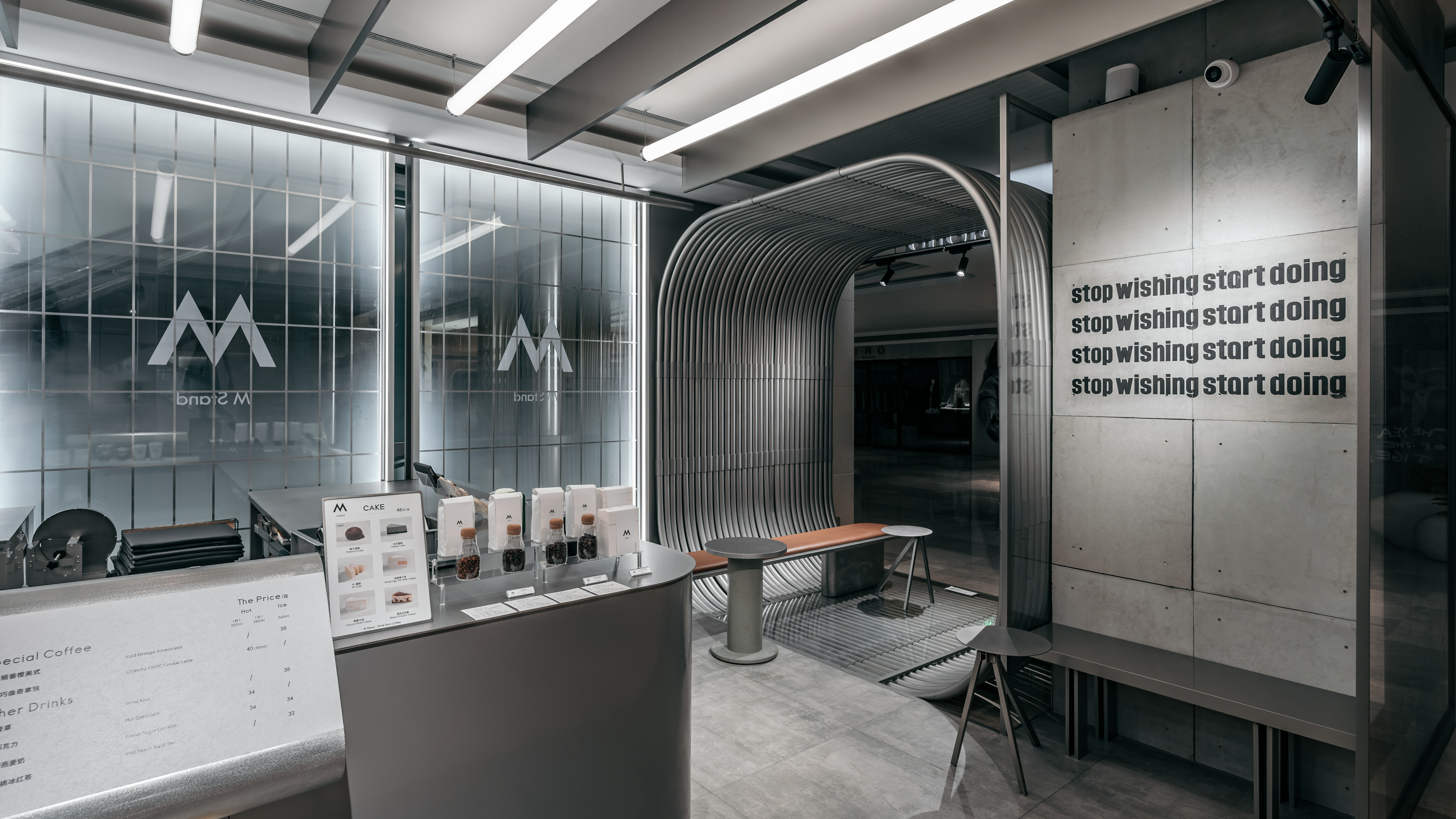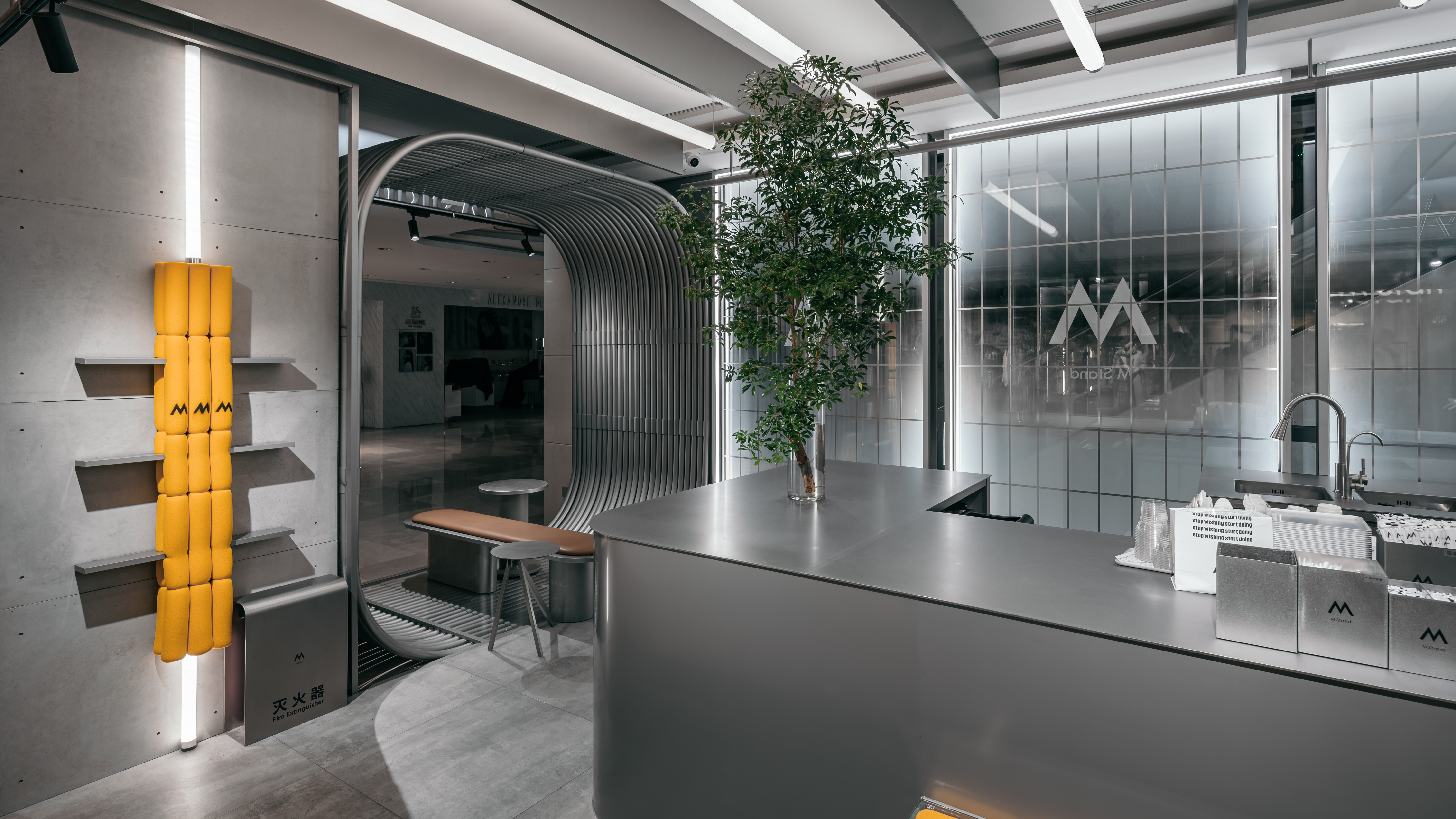 엠 스탠드는 우한 국제 프라자에서 오픈한 두 번재 카페 공간이다. 디자이너는 주변의 쇼핑몰 공간 사이에서 커피 브랜드의 정체성을 부각하기 위해 바쁜 도시 속 커피를 마실 수 있는 편안한 여행지와 같은 공간을 만들고자 했다.