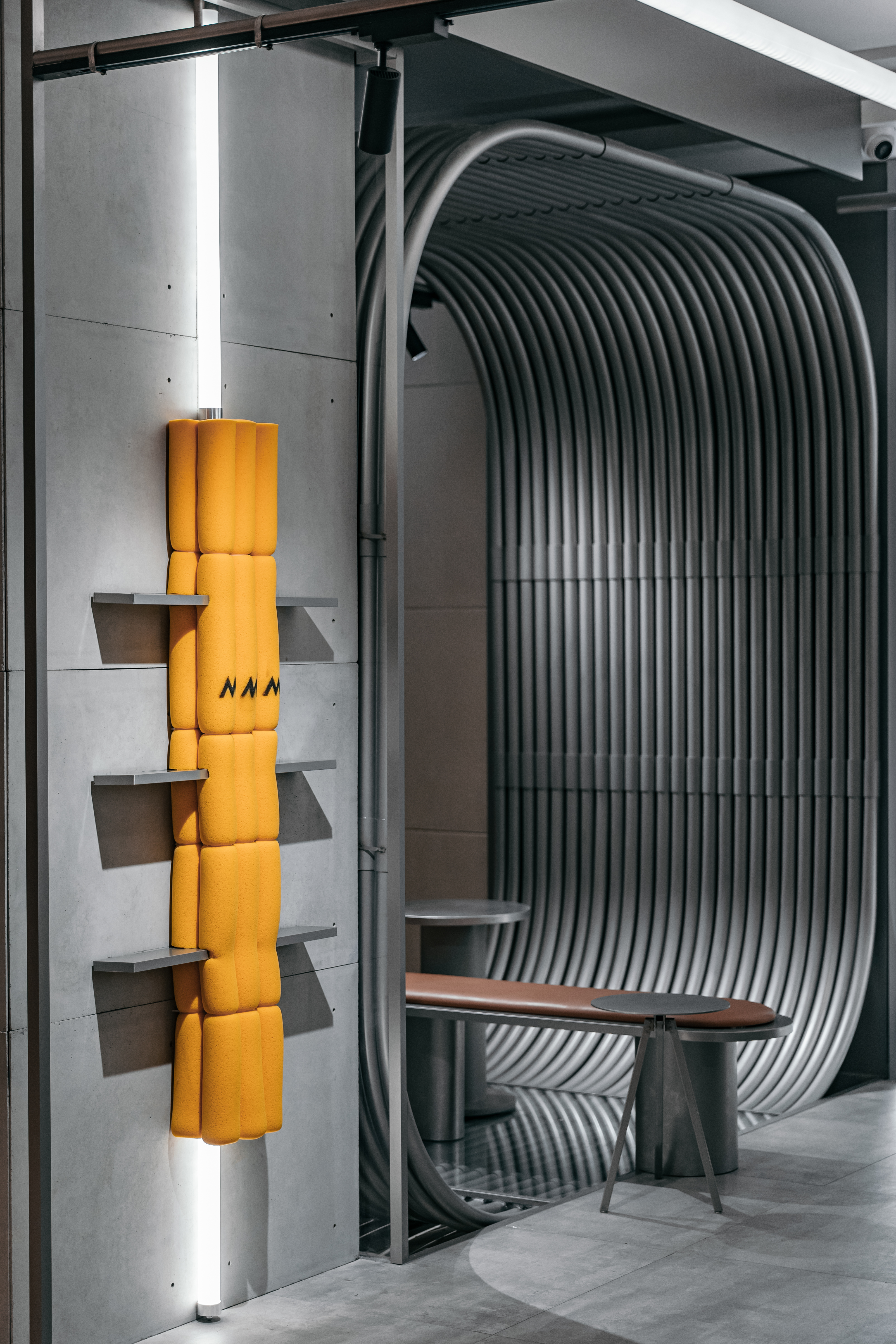 전체 공간은 시공간의 경계에 있는 우주정거장을 테마로 했다. 미니멀리즘의 회색 톤과 금속의 질감은 흰색의 조명과 대비되어 독특한 미래적인 느낌을 제공한다. 철거가 불가능한 기둥과 천장의 건물 구조가 이 공간만의 독특한 요소가 될 수 있도록 주변으로 바 카운터, 좌석 구역, 통로를 설치하여 공간을 재구성했다. 스테인리스 스틸로 제작된 곡선의 라인 좌석 영역은 유동적인 선과 독특한 원의 형태로부터 상상력을 자극하고 자유로움을 표현하는 브랜드의 정체성을 부각한다. 따뜻한 오렌지 색상의 스폰지 요소는 전체 공간이 지나치게 차가워지지 않도록 친근감을 더한다.