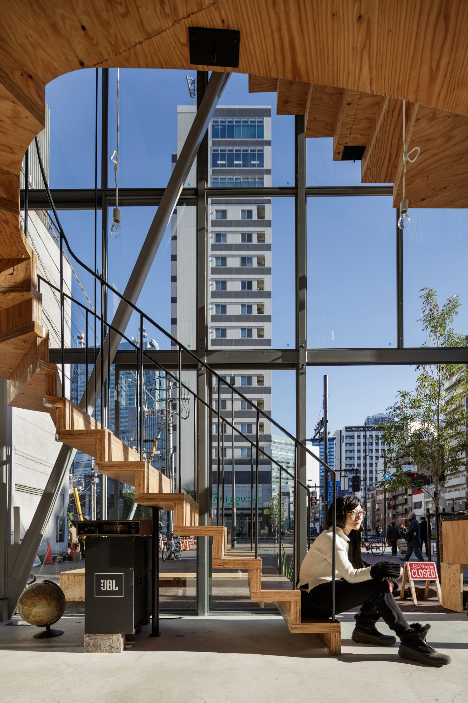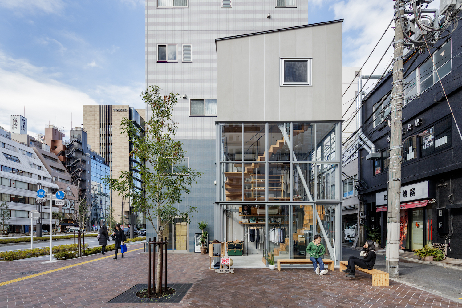 덴토시는 도쿄역과 가깝고 간선도로와 오래된 도로가 교차하는 곳에 세워진 작은 2층 건물이다. 비록 21㎡ 밖에 되지 않는 땅이었지만, 약 250㎡의 보도와 마주하고 있었다. 도시적 맥락안에서 우리는 건물과 주변 공간의 관계를 뒤집었다. 높은 위치에 만들어진 1층과 나무로 된 계단은 보도 위에 놓여 도시의 크고 작은 활동들을 이어준다. 이 작은 건물은 그 영향을 앞 보도까지 확장하며 다양한 흐름을 만들고 행인들이 모이는 장소가 된다.