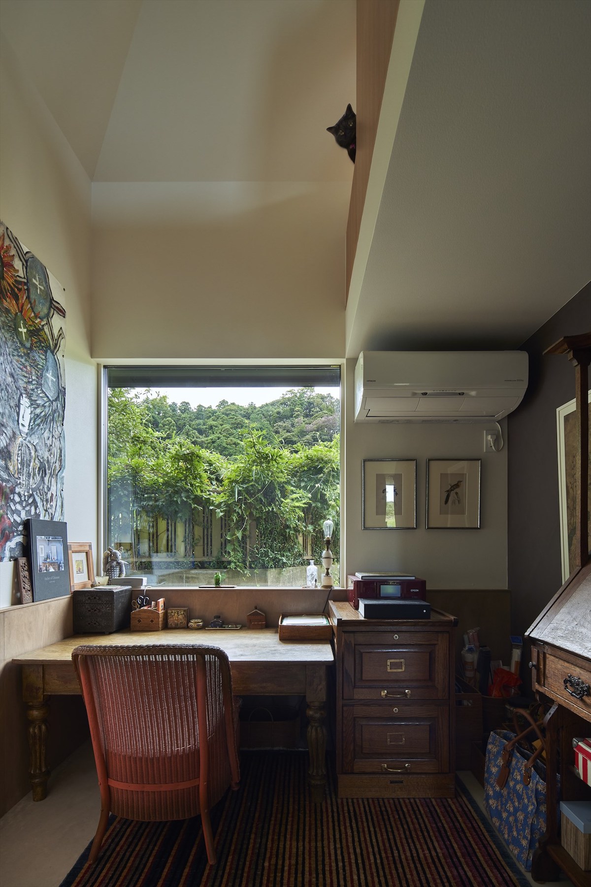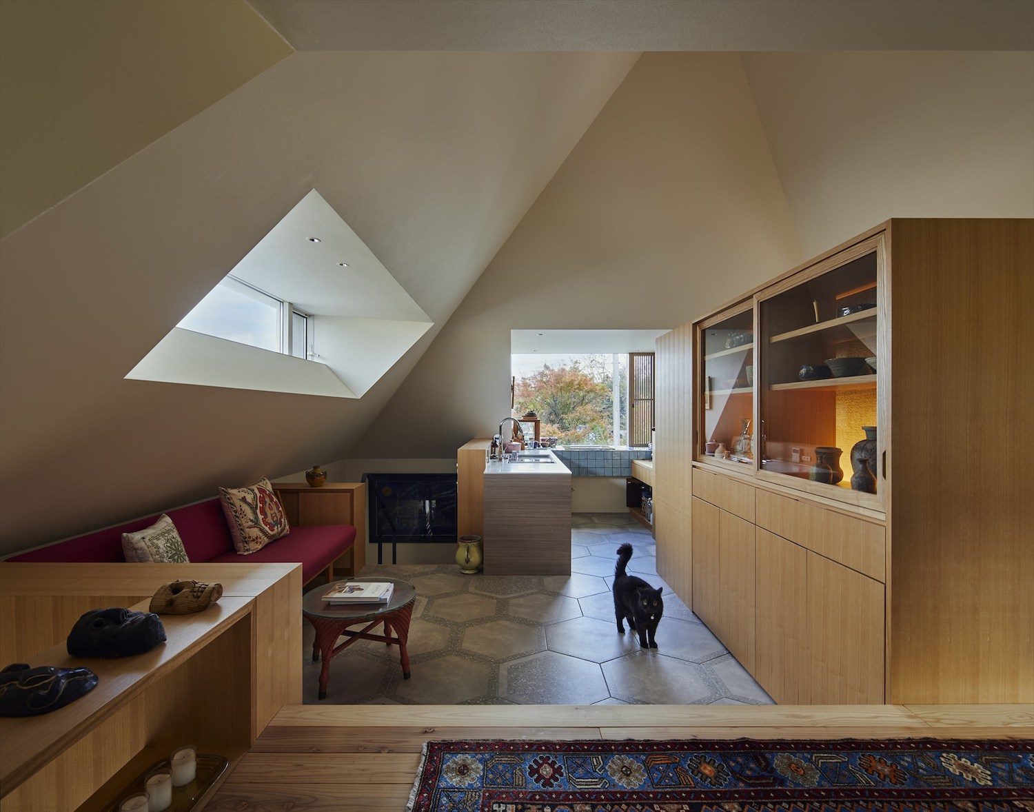 이 집은 일본의 고대 수도 중 하나인 가마쿠라의 언덕에 자리 잡고 있다. 이 지역은 암반 표면이 부드러운 퇴적물과 지역의 전형적인 토양으로 덮여 있다. 이어지는 토사 두께만 따지면 도로 위인데, 기초가 기반암 바로 위에 놓이도록 하기 위해 건축면적만큼 토사를 제거했다. 단순한 사각형 평면 위에 구조적으로 안정적인 피라미드 지붕을 얹었다. 지붕의 네 면에서는 산, 계곡, 마을, 하늘 등 각기 다른 경치를 감상할 수 있다. 이 집은 부부와 고양이 두 마리가 거주하지만, 디자인은 사람이나 반려동물 어느 쪽으로도 치우치지 않는다. 각 존재의 작은 흔적까지 순환시켜 모두가 자신만의 방식으로 시간을 보낼 수 있는 작은 상자를 만들고자 했다.