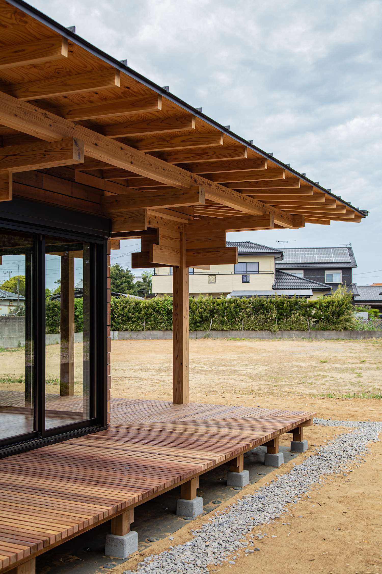 넓은 대지에 계획된 이 집은 외부공간과 생활 공간을 연결하기 위해 처마가 깊고, 데크가 길게 계획됐다. 또한, 바닥이 흙으로 된 구조물을 만들어 안팎에서 지속적으로 활용할 수 있도록 했다. 일본의 전통건축 공법인 ‘사시히지키(기둥의 축에 끼우는 방식)’를 활용한 처마와 기둥을 바탕으로 한 목조 건축물로 완성됐다.