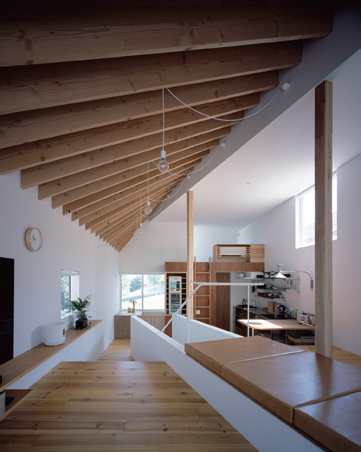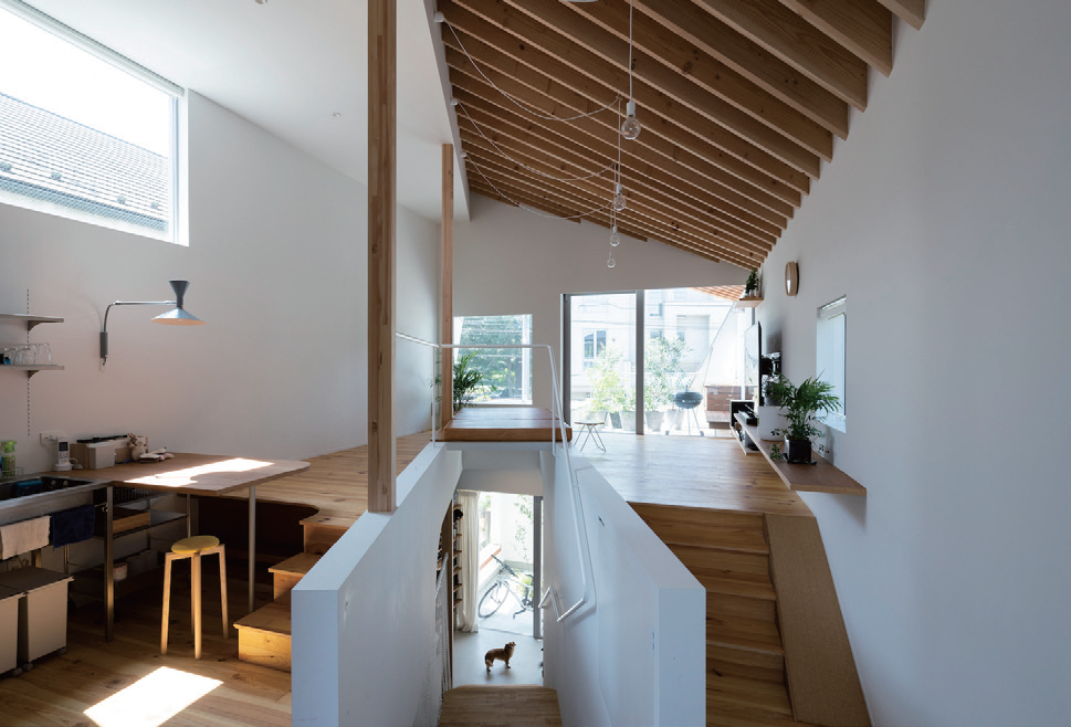 4마리의 반려견과 함께 사는 커플을 위해 도쿄 교외에 지어진 이 집은 녹지를 향해 대각선 축을 따라 건물을 배치하여 주변 녹지 경관을 실내로 들여온다. 이 축은 대지의 전면과 후면에서 시야를 가리는 건물을 피하고 있다. 중앙의 계단은 두 방향으로 녹지를 향해 있고, 칸막이로 구분된 방으로 자연스럽게 연결된다. 반려견들은 넓은 계단을 뛰어올라 방을 배회한다. 노출된 지붕 구조는 점차 기울어져 거주자의 시선을 이끌도록 했다.