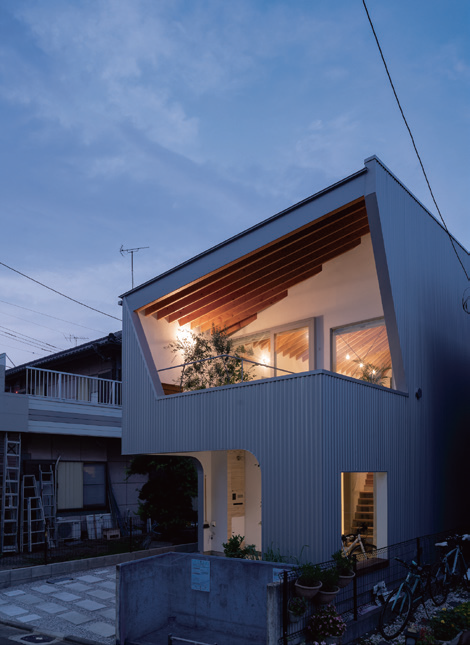 4마리의 반려견과 함께 사는 커플을 위해 도쿄 교외에 지어진 이 집은 녹지를 향해 대각선 축을 따라 건물을 배치하여 주변 녹지 경관을 실내로 들여온다. 이 축은 대지의 전면과 후면에서 시야를 가리는 건물을 피하고 있다. 중앙의 계단은 두 방향으로 녹지를 향해 있고, 칸막이로 구분된 방으로 자연스럽게 연결된다. 반려견들은 넓은 계단을 뛰어올라 방을 배회한다. 노출된 지붕 구조는 점차 기울어져 거주자의 시선을 이끌도록 했다.