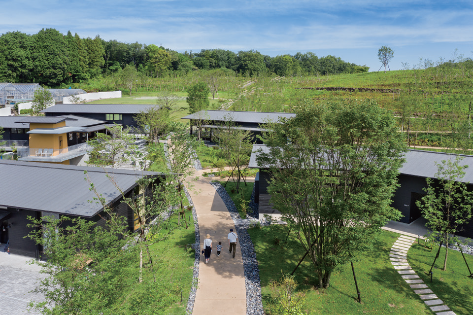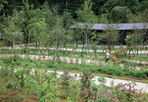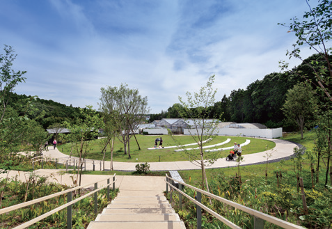 이 프로젝트는 넓은 대지를 분할하여 건물을 계획함으로써 대규모개발을 피하고 기존의 거리를 활용하여 순환로를 조성함으로써 각 장소에 맞는 체험을 제공하는 것을 목표로 시작됐다. 경관계획은 한때 이곳을 뒤덮었던 삼림을 재생하고자 하는 요구에 따라 약 1만 그루 이상의 묘목과 식물이 심어졌다. 솎아낸 나무와 낙엽은 인접한 농장에서 사용될 것이고, 재배부터 덤불 관리까지 사람의 손을 거쳐 경관은 천천히 변화해갈 것이다. 난간 없는 완만한 경사로는 약 20m 높이까지 오갈 수 있어, 산허리와 주변 경치를 감상하며 수풀의 성장을 느낄 수 있다.