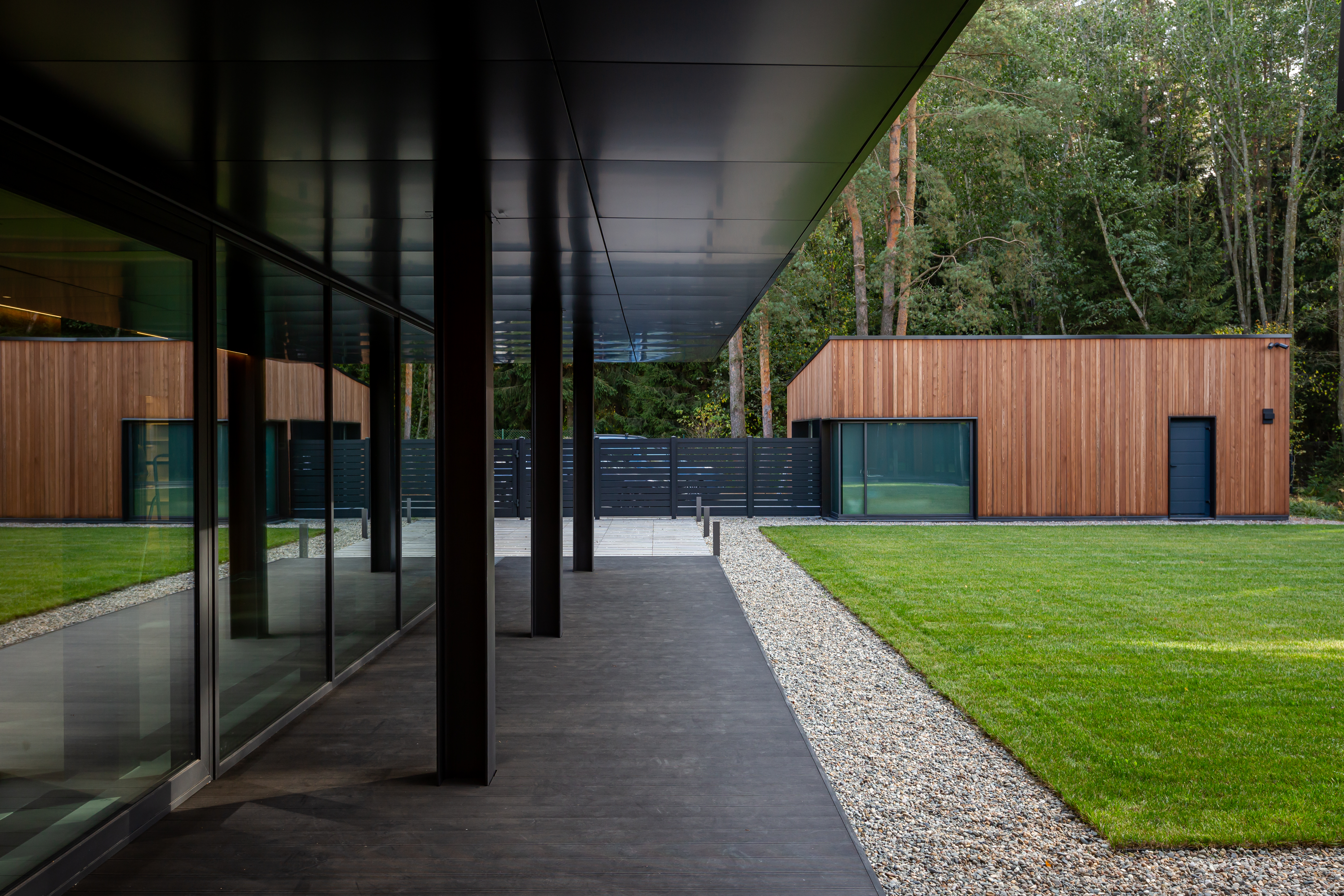 The architects designed a space where the clients can fully immerse themselves in a naturally peaceful environment while using the recreational facilities. The panoramic glass of the spa building reflects the forest, bringing the nearby natural environment inside.
