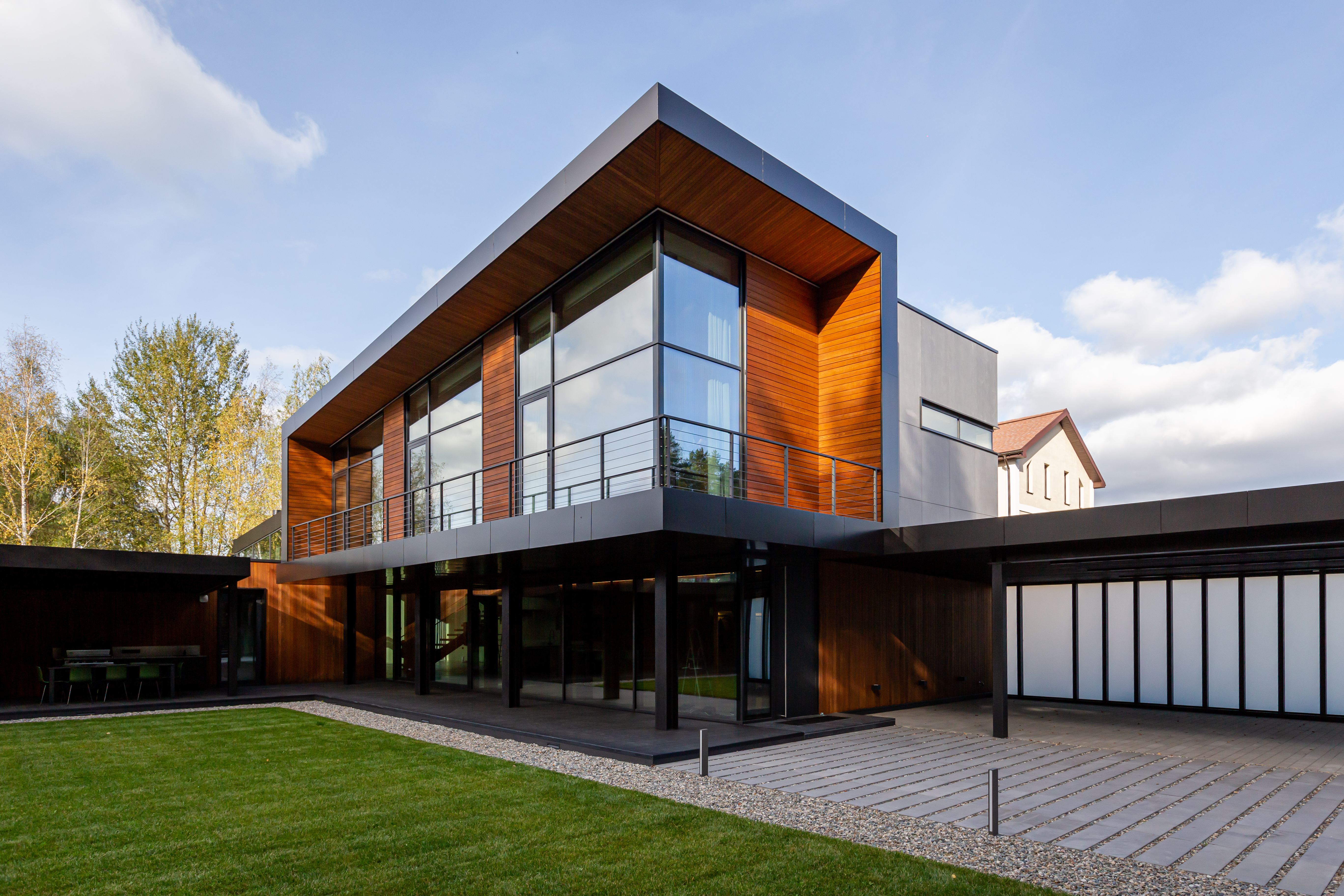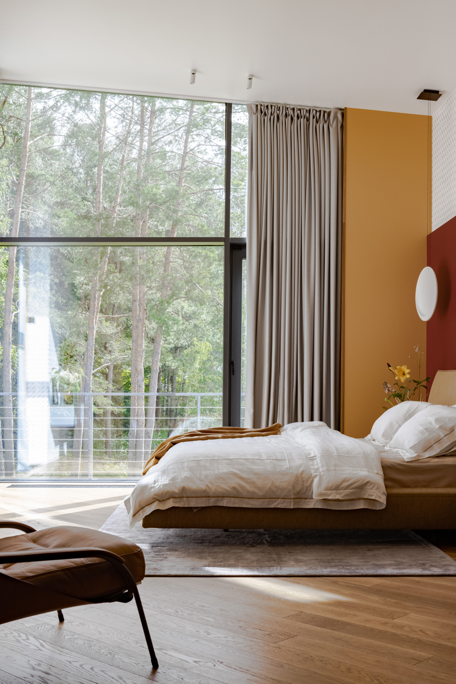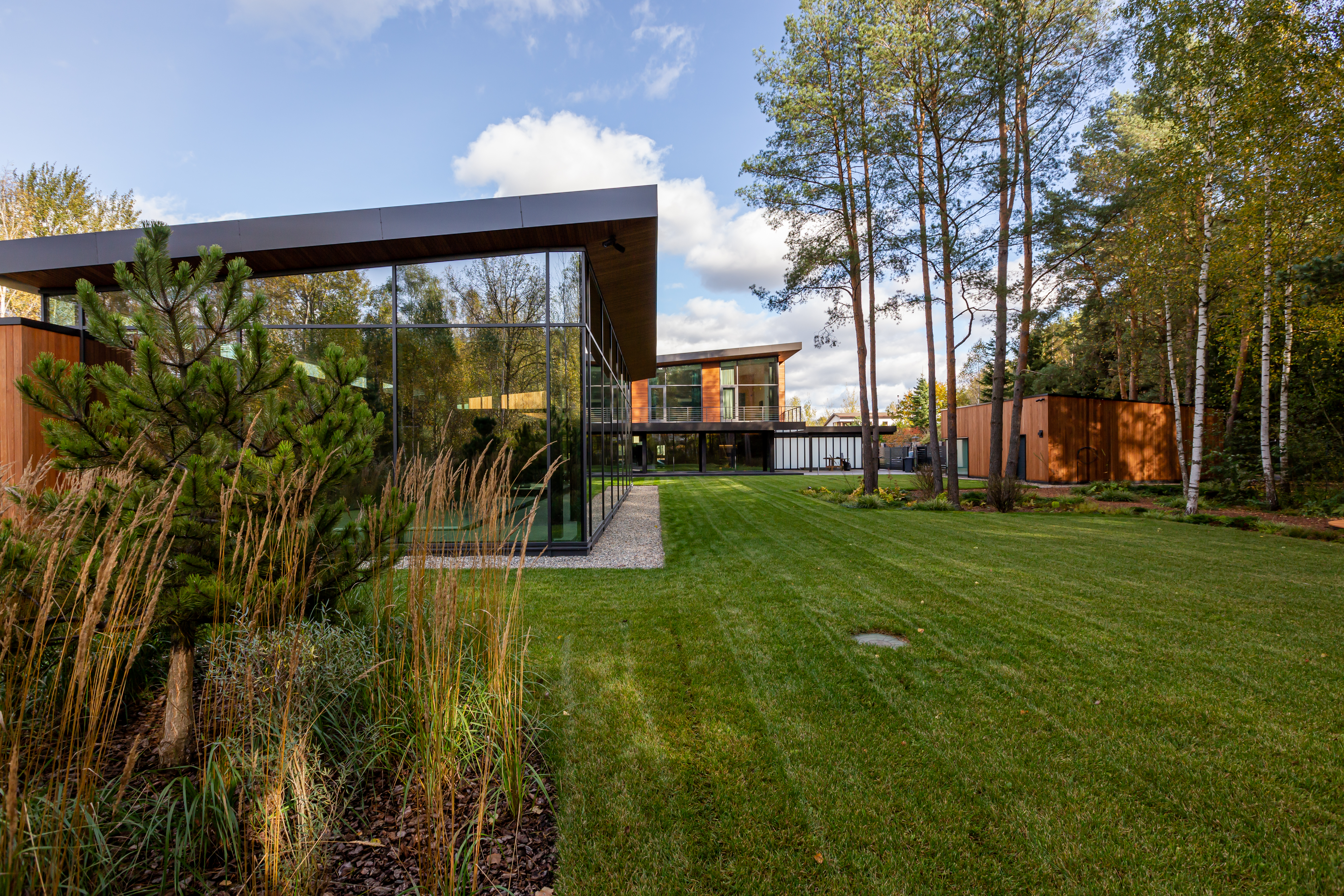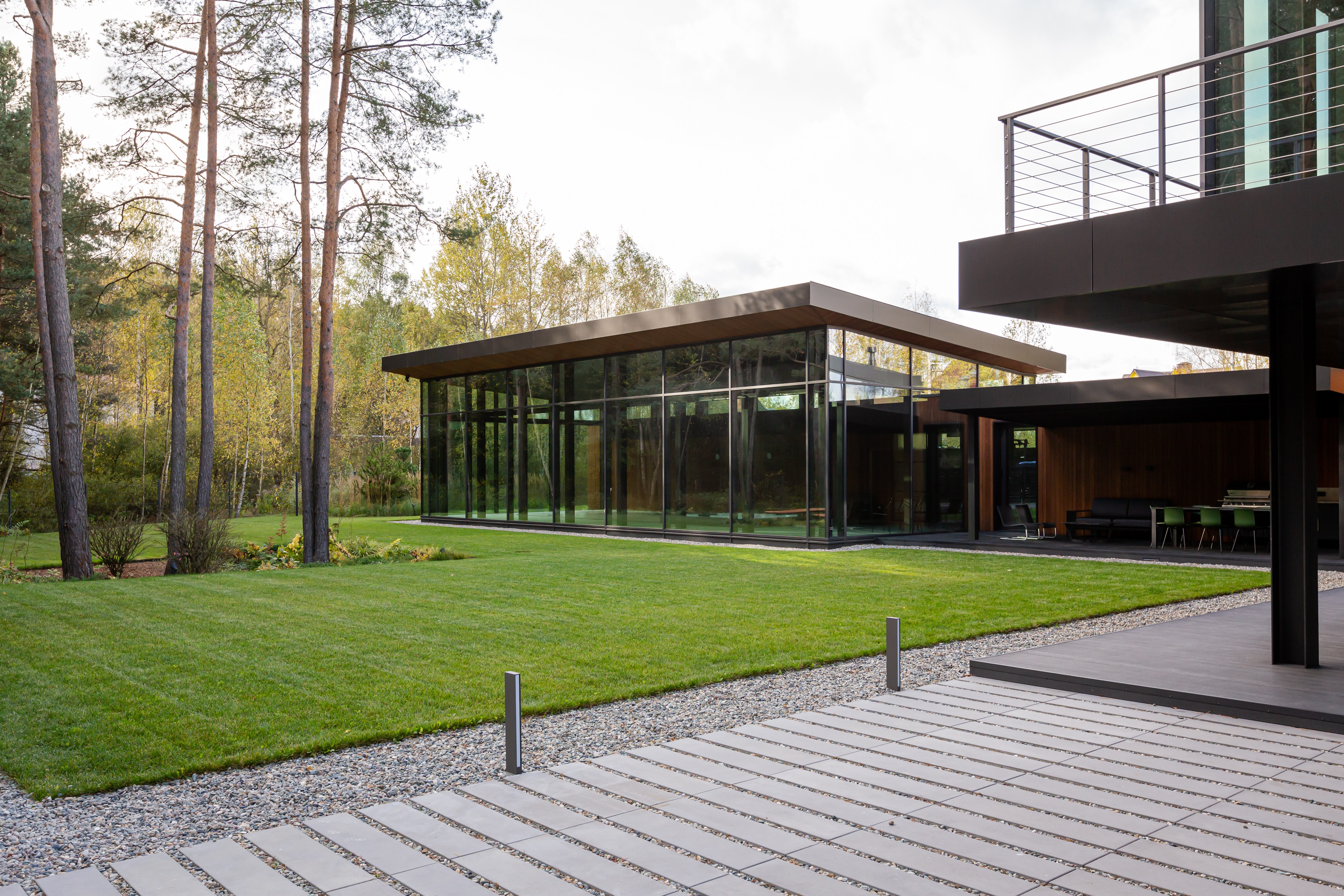 The long hallway of the residential building forms the main axis of the house, centering all the zones on the ground floor, and at the end of it is a living room with a unique atmosphere. A fireplace sits in the living room space, which has walls made of glass, allowing for views of the natural light shedding light in the yard throughout the seasons. The interior walls were designed with soundproofing panels to compensate for the reverberation of noise caused by the high ceilings of the living room and the glass facade. The second floor is accessed by a staircase with a transparent glass railing that leads to a small protruding mezzanine. When arranging private spaces such as a reading nook, guest room, and suites, wood pallet furniture was used to add warmth and comfort.