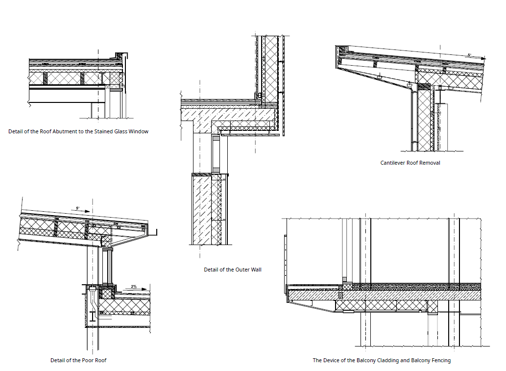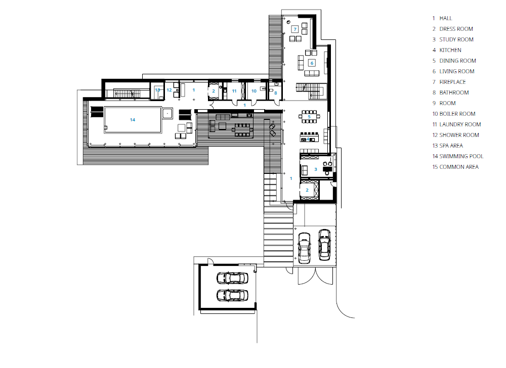 건축가는 건축주가 휴양시설을 이용하며 자연적으로 평화로운 환경에 완전히 몰입할 수 있는 공간을 설계했다. 스파용 건물의 파노라마 유리는 스파 시설을 이용하면서 물이 인접한 숲을 반사하여 자연환경을 내부로 끌어들인다.