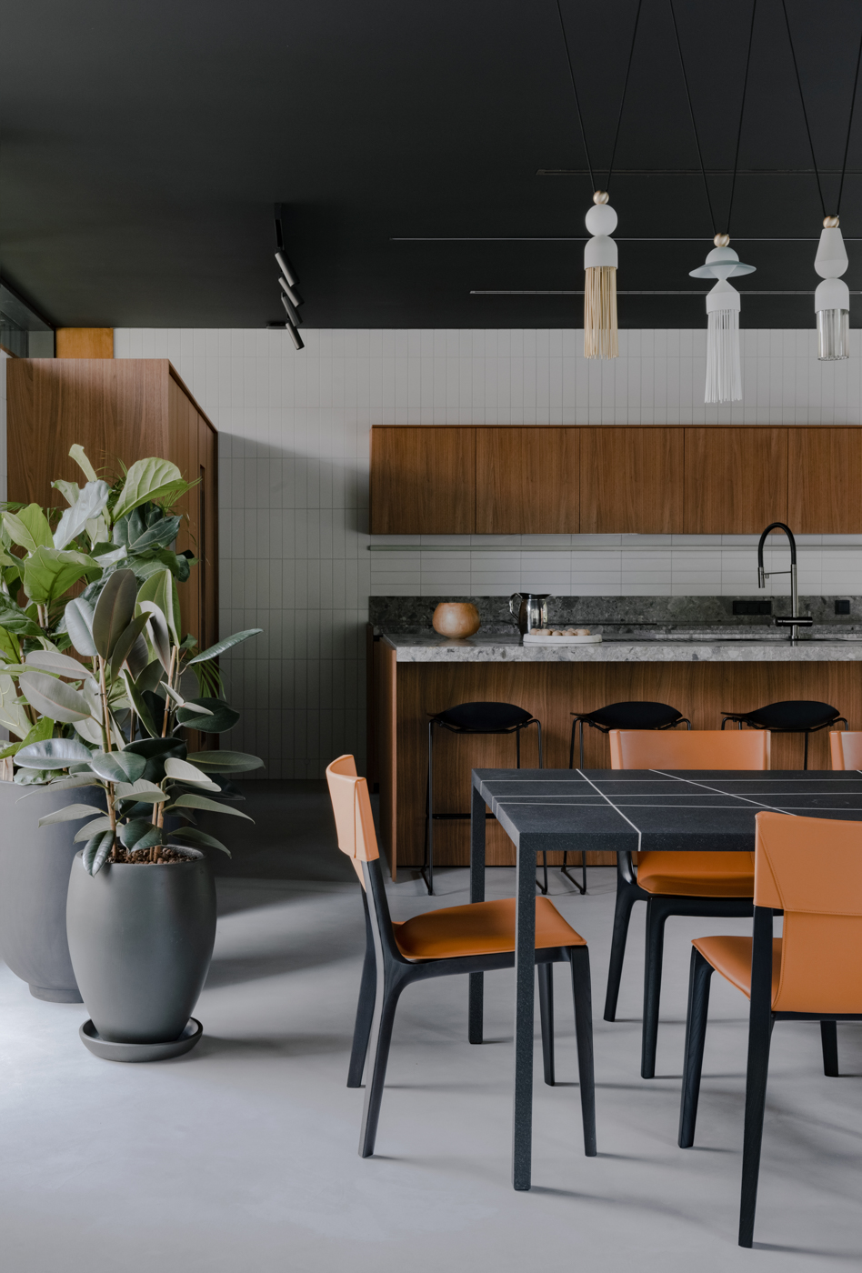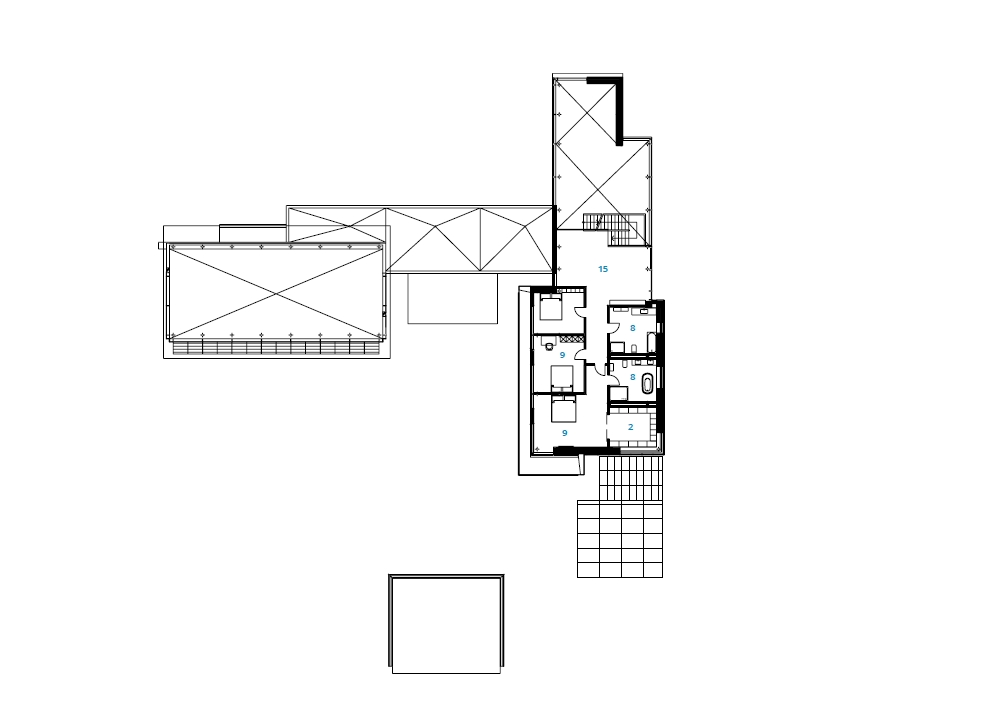 주거용 건물의 긴 복도는 1층의 모든 구역을 중심으로 하는 주택의 기본 축을 이루며, 그 끝에는 독특한 분위기의 응접실 공간이 마련되어 있다. 벽난로가 있는 응접실 공간의 벽면은 유리로 되어 있어 계절에 따른 자연 채광이 마당을 비추는 풍경을 감상할 수 있다. 내부의 벽면은 응접실의 높은 천장과 전면의 유리로 인한 소음의 반향을 보정하기 위해 방음 패널로 설계됐다. 2층은 투명한 유리 난간의 계단을 통해 돌출된 작은 메자닌으로 이어진다. 독서공간, 게스트룸, 스위트룸 등 프라이빗한 공간을 구성하기 위해 따뜻함과 편안함을 더한 목재 파레트의 가구를 활용했다.