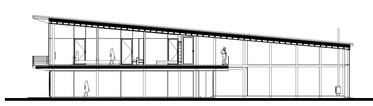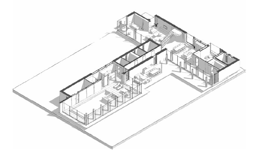 주거용 건물의 긴 복도는 1층의 모든 구역을 중심으로 하는 주택의 기본 축을 이루며, 그 끝에는 독특한 분위기의 응접실 공간이 마련되어 있다. 벽난로가 있는 응접실 공간의 벽면은 유리로 되어 있어 계절에 따른 자연 채광이 마당을 비추는 풍경을 감상할 수 있다. 내부의 벽면은 응접실의 높은 천장과 전면의 유리로 인한 소음의 반향을 보정하기 위해 방음 패널로 설계됐다. 2층은 투명한 유리 난간의 계단을 통해 돌출된 작은 메자닌으로 이어진다. 독서공간, 게스트룸, 스위트룸 등 프라이빗한 공간을 구성하기 위해 따뜻함과 편안함을 더한 목재 파레트의 가구를 활용했다.