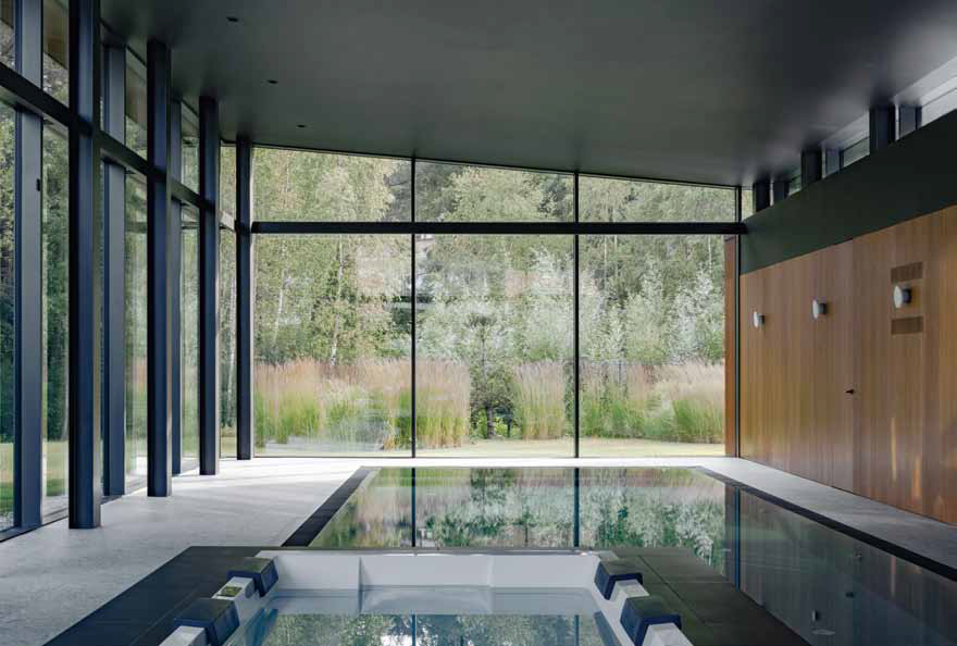 건축가는 건축주가 휴양시설을 이용하며 자연적으로 평화로운 환경에 완전히 몰입할 수 있는 공간을 설계했다. 스파용 건물의 파노라마 유리는 스파 시설을 이용하면서 물이 인접한 숲을 반사하여 자연환경을 내부로 끌어들인다.