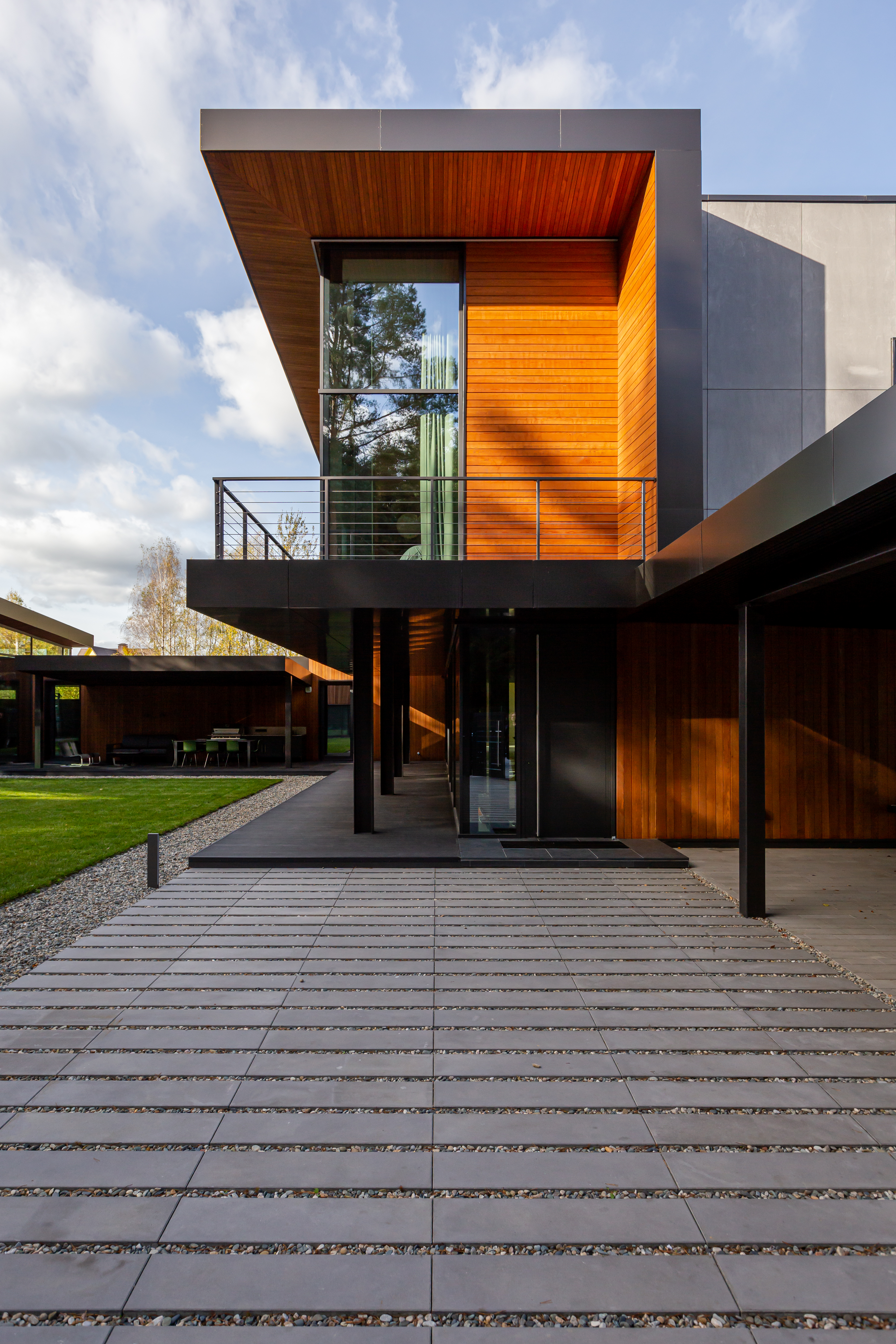 The long hallway of the residential building forms the main axis of the house, centering all the zones on the ground floor, and at the end of it is a living room with a unique atmosphere. A fireplace sits in the living room space, which has walls made of glass, allowing for views of the natural light shedding light in the yard throughout the seasons. The interior walls were designed with soundproofing panels to compensate for the reverberation of noise caused by the high ceilings of the living room and the glass facade. The second floor is accessed by a staircase with a transparent glass railing that leads to a small protruding mezzanine. When arranging private spaces such as a reading nook, guest room, and suites, wood pallet furniture was used to add warmth and comfort.