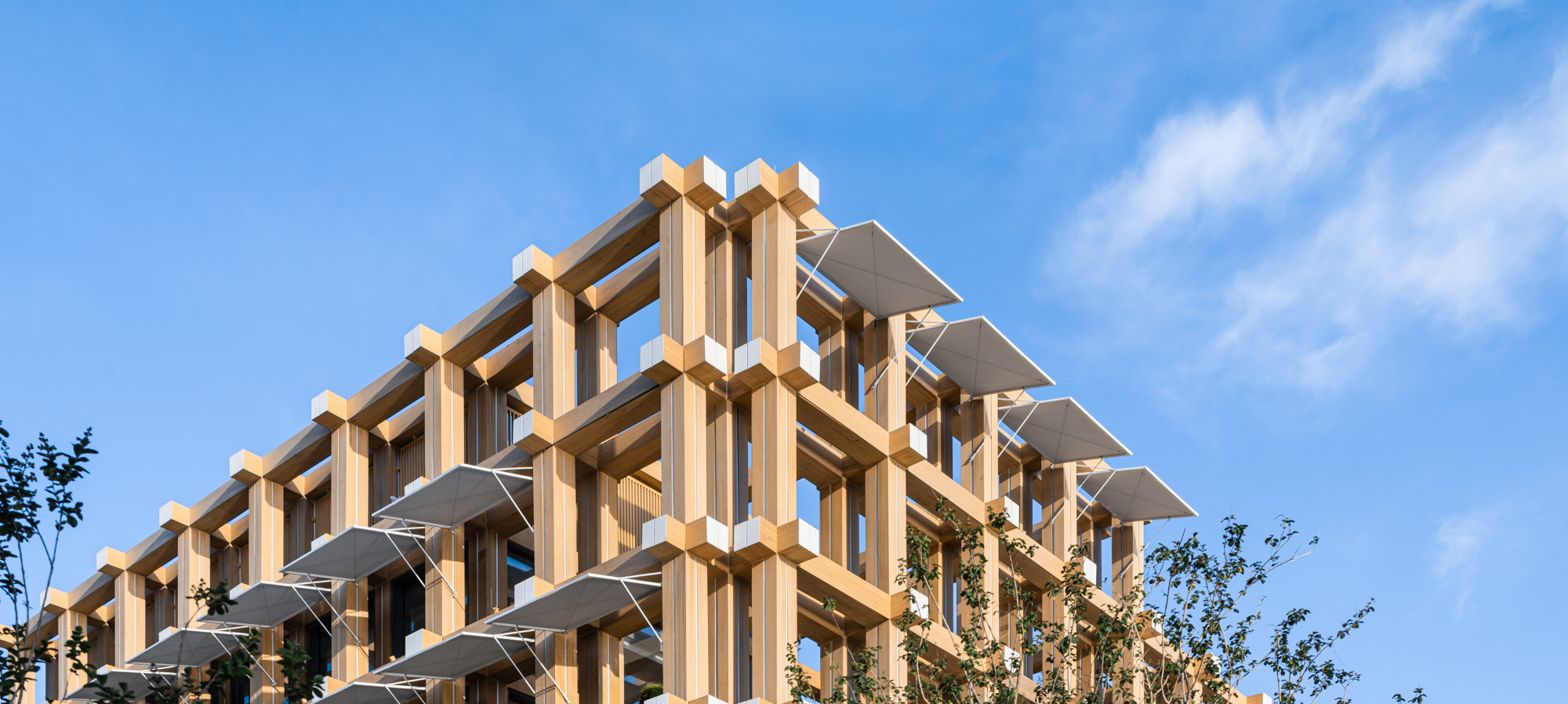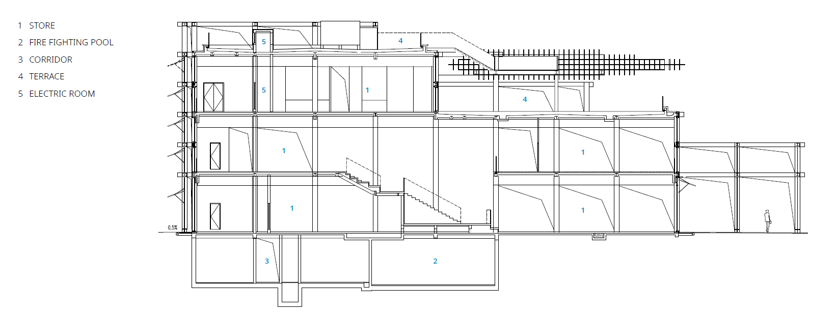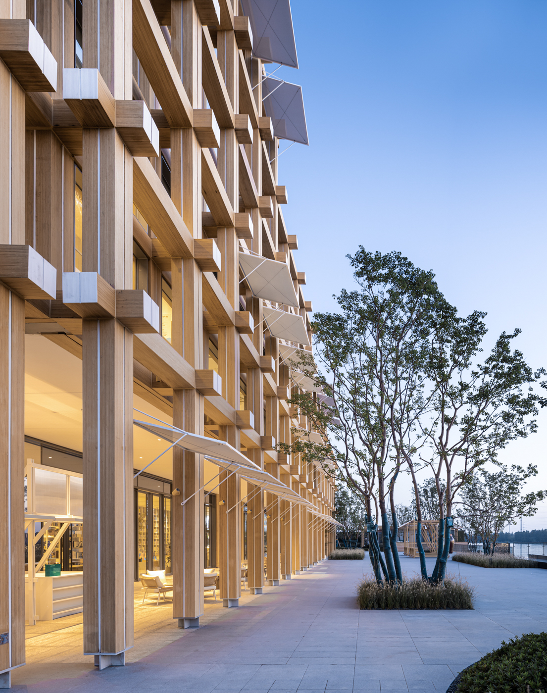 The architects initially envisioned the space being used as an exhibition and experience center for the rice wine of Shaoxing, and later repurposed as a commercial space along the waterfront. To flexibly divide the interior space, the building was set up with cubic modules as the basic module of the building, which have a width, length and height of 4.8m. These room-shaped modules are optimally sized to accommodate the floor plan and height of the required spaces, such as exhibitions, commercial spaces, restaurants, and elevator rooms. The basic modular units fully correspond to the shape and façade of the building, and the composition of the repeating units forms a unique architectural feature. The shaded façade, which symbolizes the detachable windows of traditional houses, creates a sense of depth and layers. The main material used for the modules is recycled bamboo, which has the advantage of being easy to process and environmentally friendly.