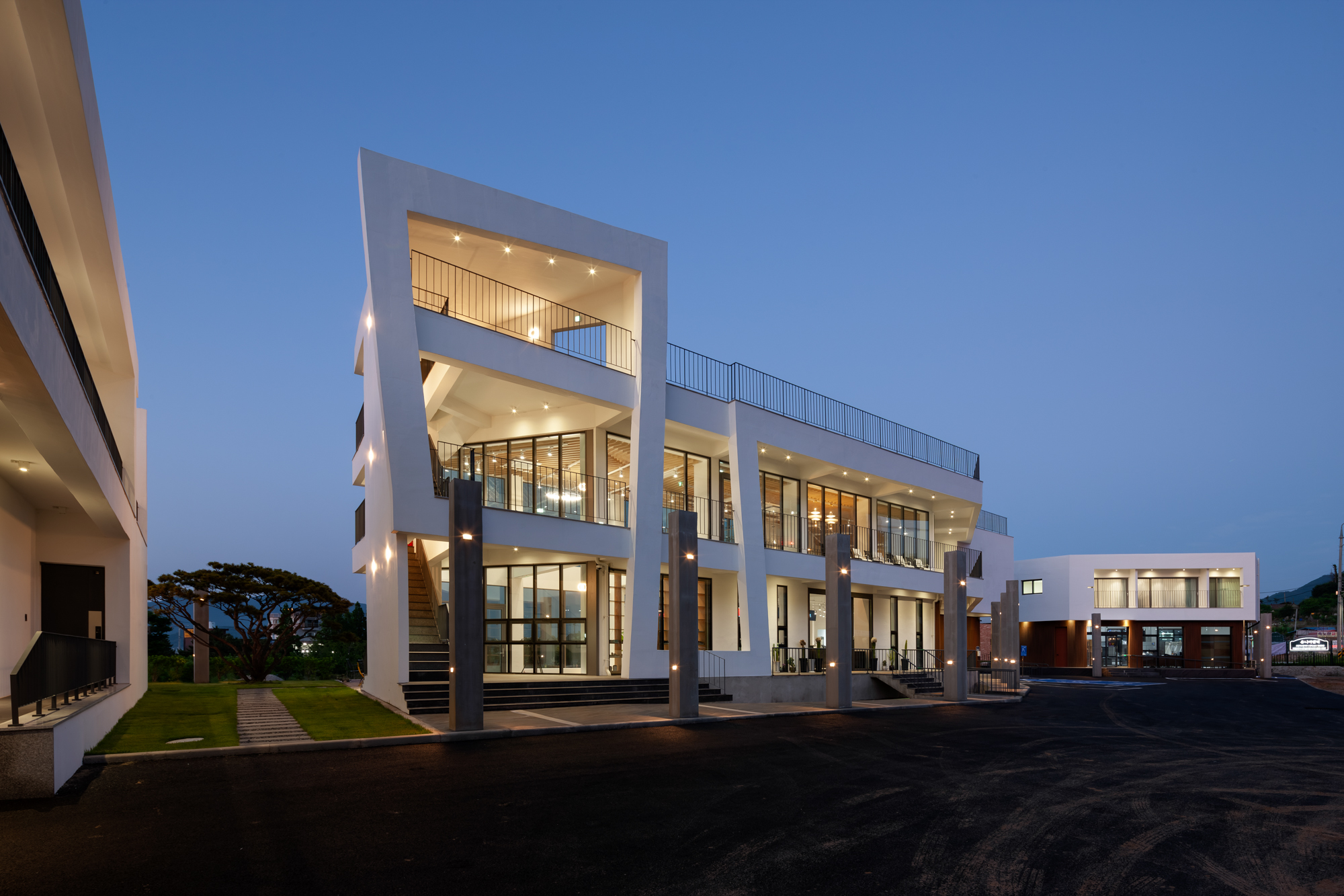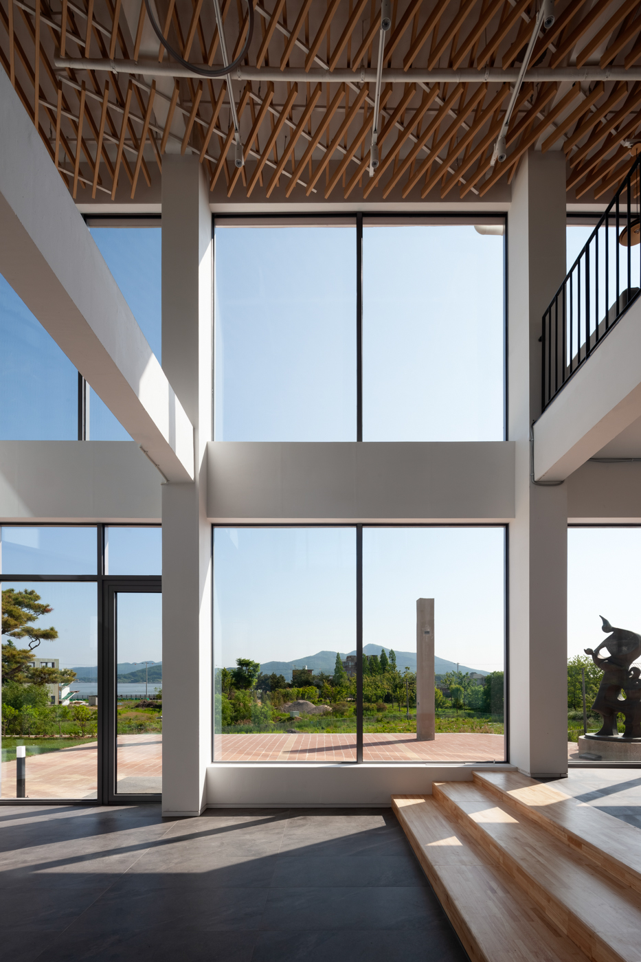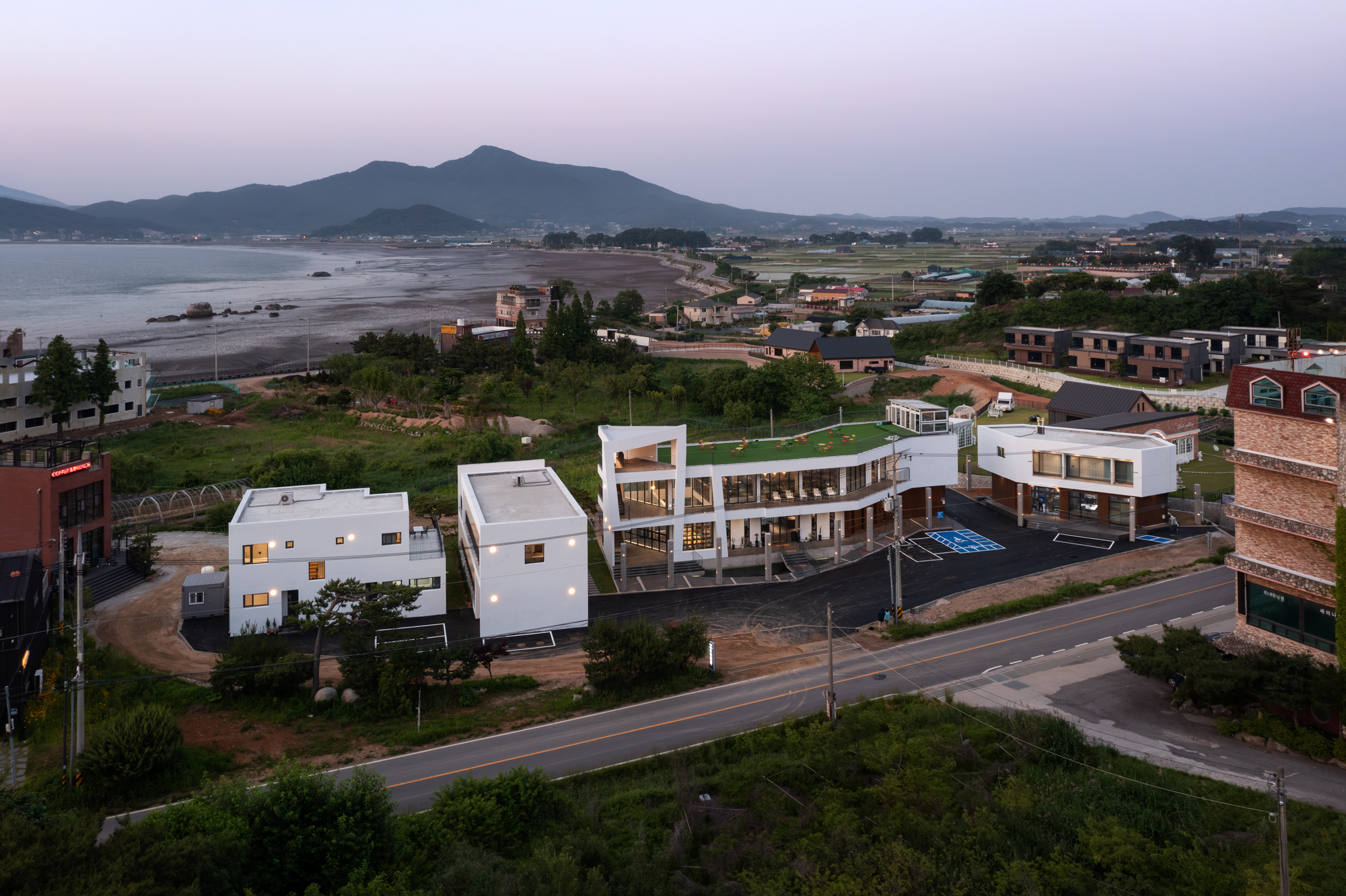 ESC Frame is a bakery cafe and pension[1] project planned on a site adjacent to the coastal island of Ganghwa Island, overlooking Hupo-hang Port to the northeast and the tip of Manisan Mountain to the southwest. Seeing that despite being on the West Coast, the water does not recede throughout the day, and during shrimping season, fishing boats with their nets spread out look like white yachts floating by, the client requested a space that would provide a scenic view of the sea.
