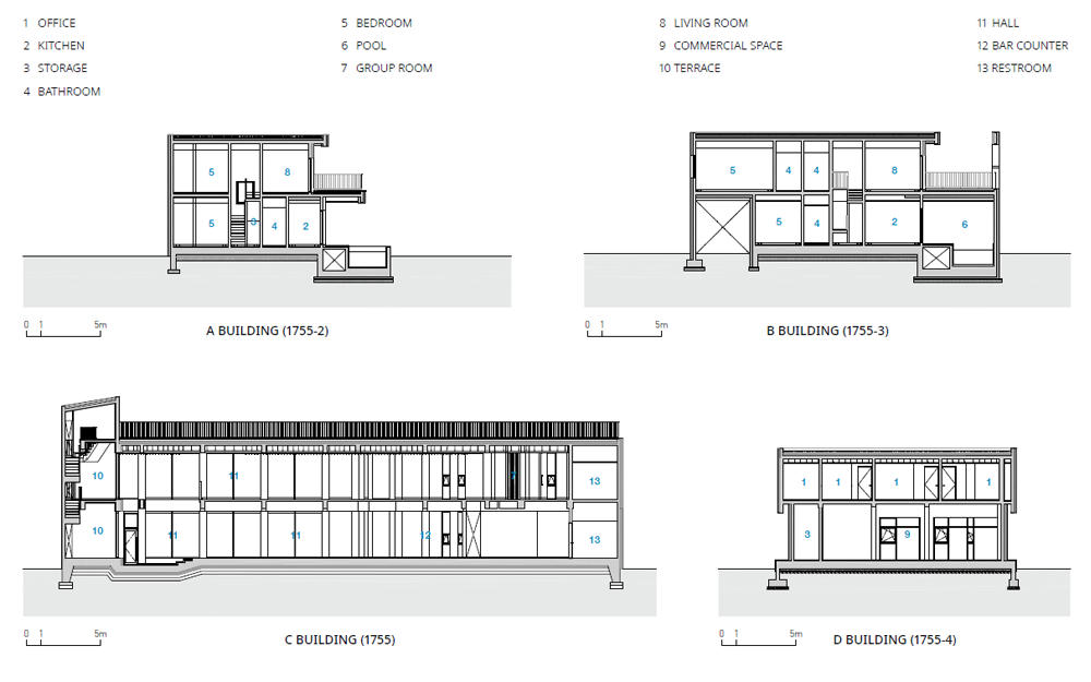 연면적 카페_594.89㎡ / 펜션 A동_183.15㎡ / 펜션 B,C동_197.62㎡ / 숙소_198.05㎡